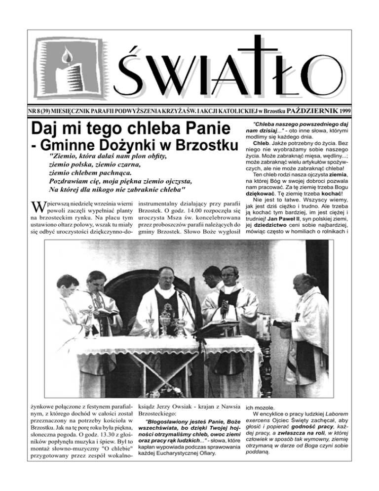 NR 8 (39) MIESIĘCZNIK PARAFII PODWYŻSZENIA KRZYŻA ŚW. I AKCJI KATOLICKIEJ w Brzostku PAŹDZIERNIK 1999 Daj mi tego chleba Panie - Gminne Dożynki w Brzostku "Ziemio, która dałaś nam plon obfity, ziemio polska, ziemio czarna, ziemio chlebem pachnąca. Pozdrawiam cię, moja piękna ziemio ojczysta, Na której dla nikogo nie zabraknie chleba" W "Chleba naszego powszedniego daj nam dzisiaj..." - oto inne słowa, którymi modlimy się każdego dnia. Chleb. Jakże potrzebny do życia. Bez niego nie wyobrażamy sobie naszego życia. Może zabraknąć mięsa, wędliny...; może zabraknąć wielu artykułów spożywczych, ale nie może zabraknąć chleba! Ten chleb rodzi nasza ojczysta ziemia, na której Bóg w swojej dobroci pozwala nam pracować. Za tę ziemię trzeba Bogu dziękować. Tę ziemię trzeba kochać! Nie jest to łatwe. Wszyscy wiemy, jak jest dziś ciężko i trudno. Ale trzeba ją kochać tym bardziej, im jest ciężej i trudniej! Jan Paweł II, syn polskiej ziemi, jej dziedzictwo ceni sobie najbardziej, mówiąc często w homiliach o rolnikach i pierwszą niedzielę września wierni powoli zaczęli wypełniać planty na brzosteckim rynku. Na placu tym ustawiono ołtarz polowy, wszak tu miały się odbyć uroczystości dziękczynno-do- instrumentalny działający przy parafii Brzostek. O godz. 14.00 rozpoczęła się uroczysta Msza św. koncelebrowana przez proboszczów parafii należących do gminy Brzostek. Słowo Boże wygłosił żynkowe połączone z festynem parafialnym, z którego dochód w całości został przeznaczony na potrzeby kościoła w Brzostku. Jak na tę porę roku była piękna, słoneczna pogoda. O godz. 13.30 z głośników popłynęła muzyka i śpiew. Był to montaż słowno-muzyczny "O chlebie" przygotowany przez zespół wokalno- ksiądz Jerzy Owsiak - krajan z Nawsia ich mozole. Brzosteckiego: W encyklice o pracy ludzkiej Laborem "Błogosławiony jesteś Panie, Boże wszechświata, bo dzięki Twojej hojności otrzymaliśmy chleb, owoc ziemi oraz pracy rąk ludzkich..." - słowa, które kapłan wypowiada podczas sprawowania każdej Eucharystycznej Ofiary. exercens Ojciec Święty zachęcał, aby głosić i popierać godność pracy, każdej pracy, a zwłaszcza na roli, w której człowiek w sposób tak wymowny, ziemię otrzymaną w darze od Boga czyni sobie poddaną. PAŹDZIERNIK 1999 Ilekroć też Jan Paweł II przybywa do Polski, zawsze daje wyraz swego ogromnego szacunku dla pracy polskiego rolnika. Przed dwunastoma laty w Tarnowie mówił: "Ziemia i ten, który ją uprawia, jego praca, stają się szczególnym obrazem Boga i kluczem do zrozumienia Jego Królestwa. I to jest także potwierdzeniem ogromnie głębokim godności pracy na roli. Pomyślmy, że dla zrozumienia Ewangelii, dla zrozumienia czym jest Królestwo Boże i życie wieczne, kim jest sam Chrystus, trzeba znać rolnictwo i pasterstwo." Nie ukrywał Ojciec Święty trudów i bolączek: "Wiadomo, że polska wieś współczesna w wyniku dramatycznych doświadczeń, jakie stały się jej udziałem, przeżywa wieloraki kryzys gospodarczy i moralny. Jakże łatwo byłoby wymienić błędy popełnione w przeszłości i te, które wciąż trwają i świadczą o niedowartościowaniu rolnictwa, które stało się terenem nieprzemyślanych eksperymentów, braku zaufania, a nawet dyskryminacji..." Niestety, nie straciły te słowa na aktualności. Kryzys gospodarczy, niedowartościowanie rolnictwa, nieprzemyślane eksperymenty, a zwłaszcza kryzys moralny... Przed dwoma tygodniami przejeżdżałem śladami św. Jana z Dukli po pięknych, nieodległych przecież nam terenach. Ileż tam porzuconej odłogiem ziemi. Z dawnych pegeerów zostały tylko ruiny. Tamta ziemia od lat już nie rodzi. Bolesna to prawda o ziemi nie tylko w naszych okolicach. Podobne obrazki mogłem oglądać i na Pomorzu, gdzie dane mi było pracować; i w wielu innych zakątkach naszego kraju. Oto smutne następstwa długich powojennych lat zniewolenia naszego kraju i jego bezlitosnego wykorzystywania ze strony sowieckich dyktatorów. Przez długie lata wieś i rolnictwo były marnowane, niedowartościowane. Stalinowski reżim spowodował masowe opuszczanie wsi, ucieczkę młodych od ziemi do miasta. Pozostawił w spadku wszystkie zaniedbania, pustkę na polach i - tę najsmutniejszą - pustkę moralną! Młodzieży zapewnił jedynie budkę z piwem, a skutecznie ogołocił z ambicji, z ideałów, zamieszał w głowach i sercach... Dziś ziemia leży odłogiem! Jakże inaczej wyglądała onegdaj polska ziemia. Zofia Kossak-Szczucka w książce Pożoga przywołuje czasy końca I wojny światowej na Wołyniu. Od Wschodu szła pożoga. Niszczono wszystko, co piękne i polskie. Palono dwory, plądrowano spichlerze, grabiono gromadzony przez lata majątek. I właśnie wtedy - w owym tragicznym roku "ŚWIATŁO" 1918 - polscy ziemianie na Wołyniu, jak w najnormalniejszych czasach, obsiali jesienią pola. Nikt się wtedy nie łudził, że doczeka wiosny. Ale nawet nie sprzedawano zboża, lecz pozostawiono je w spichlerzach. Tymi ludźmi kierował mocny, choć może często nieświadomy obowiązek obsiania pola, niezależnie od tego, komu przypadnie plon. Nieobsianie ziemi zdawało się zbrodnią każdemu z tych ludzi przesiąkniętych tradycją. Ukraiński chłop, urzeczony bolszewicką wizją lepszego świata miał w sobie chciwość ziemi. Polski ziemianin był cały przesiąknięty miłością do niej. Przepiękny pomnik wystawił też polskim chłopom nasz noblista Władysław Reymont, pokazując światu pracowitego, mocnego, kochającego ziemię Borynę z Lipiec. W śmiertelnej gorączce w koszuli szedł przez pole i siał, aż padł i został jak biała hostia na czarnej roli. Jakże często polski chłop przed żniwem kłosów dotykał, całował je z miłością i modlił się głośno słowami poety, Franciszka Karpińskiego: "Boże z Twoich rąk żyjemy, Choć naszymi pracujemy; Z Ciebie plenność miewa rola My zbier