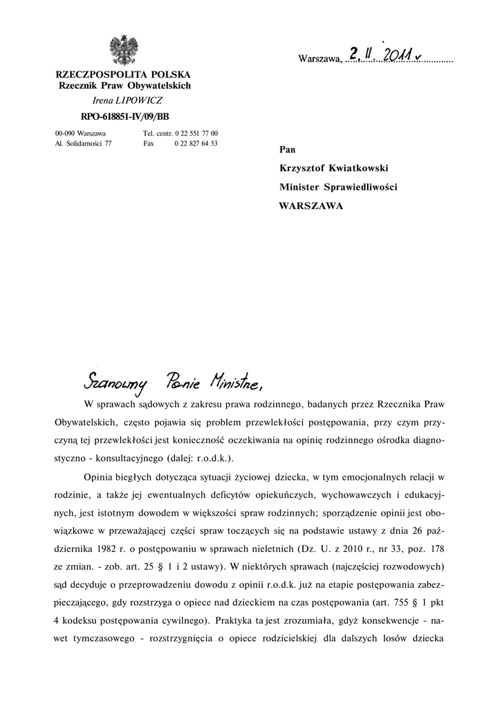 RZECZPOSPOLITA POLSKA Rzecznik Praw Obywatelskich Irena LIPOWICZ RPO-618851-IV/09/BB 00-090 Warszawa Al. Solidarności 77 Tel. centr. 0 22 551 77 00 Fax 0 22 827 64 53 Pan Krzysztof Kwiatkowski Minister Sprawiedliwości WARSZAWA W sprawach sądowych z zakresu prawa rodzinnego, badanych przez Rzecznika Praw Obywatelskich, często pojawia się problem przewlekłości postępowania, przy czym przy czyną tej przewlekłości jest konieczność oczekiwania na opinię rodzinnego ośrodka diagno styczno - konsultacyjnego (dalej: r.o.d.k.). Opinia biegłych dotycząca sytuacji życiowej dziecka, w tym emocjonalnych relacji w rodzinie, a także jej ewentualnych deficytów opiekuńczych, wychowawczych i edukacyj nych, jest istotnym dowodem w większości spraw rodzinnych; sporządzenie opinii jest obo wiązkowe w przeważającej części spraw toczących się na podstawie ustawy z dnia 26 paź dziernika 1982 r. o postępowaniu w sprawach nieletnich (Dz. U. z 2010 r., nr 33, poz. 178 ze zmian. - zob. art. 25 § 1 i 2 ustawy). W niektórych sprawach (najczęściej rozwodowych) sąd decyduje o przeprowadzeniu dowodu z opinii r.o.d.k. już na etapie postępowania zabez pieczającego, gdy rozstrzyga o opiece nad dzieckiem na czas postępowania (art. 755 § 1 pkt 4 kodeksu postępowania cywilnego). Praktyka ta jest zrozumiała, gdyż konsekwencje - na wet tymczasowego - rozstrzygnięcia o opiece rodzicielskiej dla dalszych losów dziecka 2 mogą być bardzo istotne: w przypadku małoletnich dzieci, nawet kilkumiesięczna rozłąka z jednym z rodziców może zupełnie zmodyfikować relacje rodzinne. Orzeczenie o formie sprawowania opieki rodzicielskiej powinno być zatem rozstrzygnięciem optymalnym z uwa gi na potrzeby emocjonalne i rozwojowe dziecka. Tymczasem właśnie opinia sporządzona przez r.o.d.k. ,jest najbardziej wartościowym środkiem dowodowym, stanowiącym dla sądu pewne źródło informacji ze względu na jego charakter i fachowość osób sporządzających opinię" (Wanda Stojanowska, „Dowód z opinii rodzinnego ośrodka diagnostyczno - konsul tacyjnego w sprawach o rozwód i jego wpływ na treść wyroku w świetle wyników badania aktowego", Instytut Wymiaru Sprawiedliwości, Warszawa 2001 r., s. 28). Tak więc opinia psychologiczna (bądź psychologiczno - pedagogiczna), sporządzona przez specjalistyczny ośrodek, jest podstawowym narzędziem, za pomocą którego sąd ustala sytuację życiową dziecka i kształtuje jego relacje rodzinne. Niemniej jednak, skuteczność działania sądu rodzinnego w dużym stopniu zależy od sprawnego przeprowadzenia tego do wodu; obserwacja praktyki orzeczniczej wskazuje tymczasem na wielomiesięczne opóźnie nia w diagnozie psychologicznej dziecka. Długotrwałe oczekiwanie na opinię r.o.d.k. jest tym zarzutem, który pojawia się bardzo często w skargach rodziców kierowanych do Rzecz nika. Do podobnych wniosków prowadzi lektura raportów z badań aktowych, sporządzo nych przez Instytut Wymiaru Sprawiedliwości, z pewnością znanych Ministrowi Sprawie dliwości, udostępnionych przez Instytut na prośbę Rzecznika Praw Obywatelskich. Badania dotyczące wykorzystania dowodu z opinii r.o.d.k. w postępowaniu sądowym zostały zapre zentowane w dwóch raportach: w powołanej wcześniej pracy Wandy Stojanowskiej „Dowód z opinii rodzinnego ośrodka diagnostyczno - konsultacyjnego w sprawach o roz wód... " z 2001 r. oraz w pracy Pawła Ostaszewskiego „Opinia rodzinnego ośrodka diagno styczno-konsultacyjnego w sprawach o ustalenie kontaktów dziecka z innymi osobami niż rodzice " z 2007 r. Wprawdzie od momentu wykonania badań upłynął pewien okres, anali zowano akta spraw już prawomocnie zakończonych, niemniej jednak ustalenia poczynione w raportach trudno uznać za nieaktualne. W przeciągu ostatnich kilku lat system diagnozo wania dzieci nie uległ znaczącym zmianom1, jednocześnie można wskazać na zwiększony wpływ spraw rodzinnych do sądów2. 1 Liczba placówek, wyznaczonych przez Ministra Sprawiedliwości zarządzeniem z dnia 18 maja 2001 r. (Dz.Urz. MS nr 1, poz. 6), parokrotnie nowelizowanym, jest względnie stała, i wynosi około 60. 2 Np. w 2001 r. do sądów okręgowych wpłynęło 78 163 sprawy o rozwód lub separację, w 2007 r.: 104 393 sprawy, w 2009 r. - 100 772 sprawy (dane statystyczne dostępne na stronach internetowych MS). 3 Wydaje się zatem, że obraz praktyki działania r.o.d.k., przedstawiony w powołanych badaniach, zachowuje aktualność - na to wskazują również akta spraw rodzinnych, bada nych przez Rzecznika. W świetle danych, zebranych w powołanych badaniach, opinia r.o.d.k. jest dowodem mającym bardzo duży wpływ na rozstrzygnięcie sprawy: w 86 % spraw badanych przez W. Stojanowską, orzeczenie sądu było zgodne z wnioskami biegłych (jednak w 3 % tych spraw sąd do pewnego stopnia zmodyfikował propozycję biegłych - s. 30 opracowania). Również w świetle badań P. Ostaszewskiego, w przeważającej liczbie przypadków rozstrzygnięcia sądu w pełni pokrywały się z sugestiami r.o.d.k. (s 31 -32 i 35 opracowania). Opinie sporządzane przez biegłych zostały poddane analizie pod względem formal nym, a także merytorycznym; w ocenie badaczy, opinie te prawie zawsze są zgodne z wzo rem zawartym w rozporządzeniu Ministra Sprawiedliwości z dnia 3 sierpnia 2001 r. w sprawie organizacji i zakresu działania rodzinnych ośrodków diagnostyczno-konsultacyj nych (Dz. U. nr 97, poz. 1063), prezentują także wysoki poziom profesjonalizmu, a opinie niestaranne stanowią nikłą część ogółu. Paweł Ostaszewski podkreśla, że opinie r.o.d.k. w analizowanych sprawach spełniały dwie podstawowe funkcje - funkcję informacyjną (pre zentując obiektywne ustalenia i fakty oraz funkcję instruktażową (formułując sugestie i po stulując określone rozwiązania - s. 16 opracowania). Autor zwraca także uwagę na wielość i różnorodność stosowanych technik badawczych (średnio 5 techni