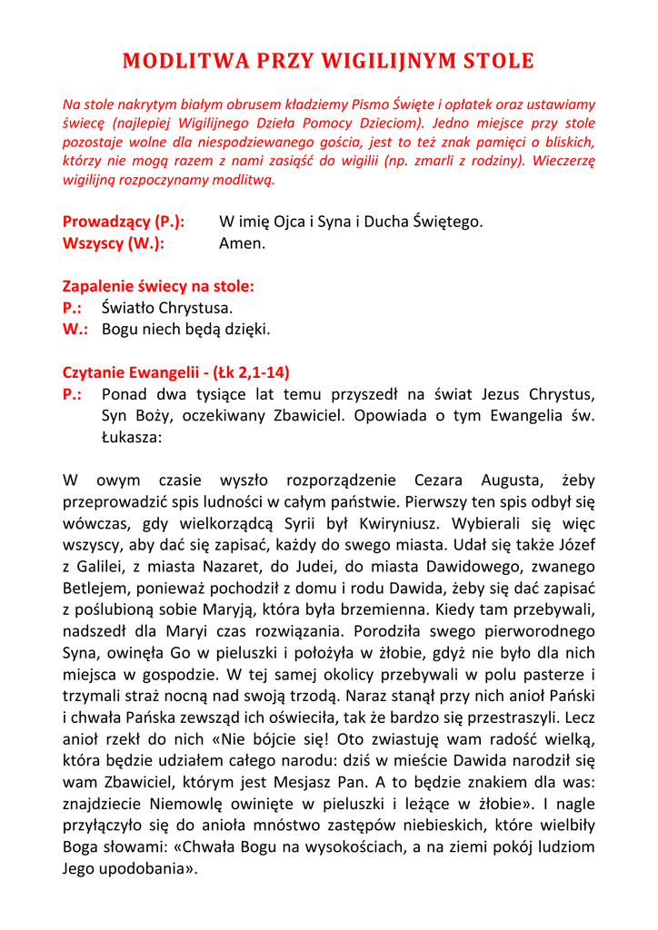 MODLITWA PRZY WIGILIJNYM STOLE Na stole nakrytym białym obrusem kładziemy Pismo Święte i opłatek oraz ustawiamy świecę (najlepiej Wigilijnego Dzieła Pomocy Dzieciom). Jedno miejsce przy stole pozostaje wolne dla niespodziewanego gościa, jest to też znak pamięci o bliskich, którzy nie mogą razem z nami zasiąść do wigilii (np. zmarli z rodziny). Wieczerzę wigilijną rozpoczynamy modlitwą. Prowadzący (P.): Wszyscy (W.): W imię Ojca i Syna i Ducha Świętego. Amen. Zapalenie świecy na stole: P.: Światło Chrystusa. W.: Bogu niech będą dzięki. Czytanie Ewangelii - (Łk 2,1-14) P.: Ponad dwa tysiące lat temu przyszedł na świat Jezus Chrystus, Syn Boży, oczekiwany Zbawiciel. Opowiada o tym Ewangelia św. Łukasza: W owym czasie wyszło rozporządzenie Cezara Augusta, żeby przeprowadzić spis ludności w całym państwie. Pierwszy ten spis odbył się wówczas, gdy wielkorządcą Syrii był Kwiryniusz. Wybierali się więc wszyscy, aby dać się zapisać, każdy do swego miasta. Udał się także Józef z Galilei, z miasta Nazaret, do Judei, do miasta Dawidowego, zwanego Betlejem, ponieważ pochodził z domu i rodu Dawida, żeby się dać zapisać z poślubioną sobie Maryją, która była brzemienna. Kiedy tam przebywali, nadszedł dla Maryi czas rozwiązania. Porodziła swego pierworodnego Syna, owinęła Go w pieluszki i położyła w żłobie, gdyż nie było dla nich miejsca w gospodzie. W tej samej okolicy przebywali w polu pasterze i trzymali straż nocną nad swoją trzodą. Naraz stanął przy nich anioł Pański i chwała Pańska zewsząd ich oświeciła, tak że bardzo się przestraszyli. Lecz anioł rzekł do nich «Nie bójcie się! Oto zwiastuję wam radość wielką, która będzie udziałem całego narodu: dziś w mieście Dawida narodził się wam Zbawiciel, którym jest Mesjasz Pan. A to będzie znakiem dla was: znajdziecie Niemowlę owinięte w pieluszki i leżące w żłobie». I nagle przyłączyło się do anioła mnóstwo zastępów niebieskich, które wielbiły Boga słowami: «Chwała Bogu na wysokościach, a na ziemi pokój ludziom Jego upodobania». Teraz śpiewamy kolędę „Wśród nocnej ciszy” lub „Bóg się rodzi”. Wspólna modlitwa P.: Boże, nasz Ojcze, w tej uroczystej godzinie wychwalamy Cię i dziękujemy za noc, w której posłałeś nam swojego Syna Jezusa Chrystusa, naszego Pana i Zbawiciela i prosimy Ciebie: P.: Udziel naszej rodzinie daru miłości, zgody i pokoju. Ciebie prosimy. W.: Wysłuchaj nas, Panie. P.: Obdarz naszych sąsiadów, przyjaciół i znajomych pokojem tej nocy. Ciebie prosimy. P.: Wszystkich opuszczonych, samotnych, chorych, biednych, głodnych na całym świecie pociesz i umocnij Dobrą Nowiną tej świętej nocy. Ciebie prosimy. P.: Naszych zmarłych... obdarz szczęściem i światłem Twej chwały. Ciebie prosimy. Wszyscy odmawiają modlitwę „Ojcze nasz” P.: Panie Boże, Ty sprawiłeś, że ta święta noc zajaśniała blaskiem prawdziwej światłości Jednorodzonego Syna Twojego, spraw, abyśmy jaśnieli blaskiem Twego światła w naszym codziennym postępowaniu. Przez Chrystusa Pana naszego. W.: Amen. Łamanie się opłatkiem P.: A teraz w duchu miłości i przebaczenia przełamiemy się opłatkiem chlebem miłości. Podzielimy się tym chlebem na znak miłości, jedności oraz szacunku dla naszej polskiej tradycji. Otwierając serca nasze w miłości wzajemnej, otwieramy je na przyjście Pana. Niech On będzie zawsze z nami: Wszyscy łamią się opłatkiem i składają sobie życzenia. Modlitwa przed wieczerzą P.: Pobłogosław Panie Boże nas, pobłogosław ten posiłek, tych, którzy go przygotowali, i naucz nas dzielić się chlebem i radością ze wszystkimi. Przez Chrystusa Pana naszego. W.: Amen. Modlitwa po wieczerzy P.: Dziękujemy Ci, Boże, nasz dobry Ojcze, za Syna Twego Jezusa Chrystusa, dziękujemy za miłość do wszystkich ludzi, za ten błogosławiony wieczór i dary, które spożywaliśmy. Tobie chwała na wieki wieków. W.: Amen. Po wieczerzy wigilijnej jest moment rozdawania prezentów, które przypominają nam, że największym prezentem jest Pan Jezus. Wspólne kolędowanie przypomni nam, Kto jest najważniejszym bohaterem tej Nocy. Zwieńczeniem domowego świętowania jest wspólne wyjście na Pasterkę do kościoła.