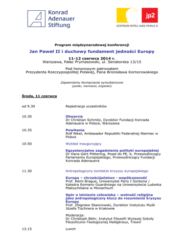 Program międzynarodowej konferencji Jan Paweł II i duchowy fundament jedności Europy 11-12 czerwca 2014 r. Warszawa, Pałac Prymasowski, ul. Senatorska 13/15 Pod honorowym patronatem Prezydenta Rzeczypospolitej Polskiej, Pana Bronisława Komorowskiego Zapewniamy tłumaczenie symultaniczne (polski, niemiecki, angielski) Środa, 11 czerwca od 9.30 Rejestracja uczestników 10.30 Otwarcie Dr Christian Schmitz, Dyrektor Fundacji Konrada Adenauera w Polsce, Warszawa 10.35 Powitanie Rolf Nikel, Ambasador Republiki Federalnej Niemiec w Polsce 10.50 Wykład inaugurujący Egzystencjalne zagadnienia polityki europejskiej Dr Hans-Gert Pöttering, Poseł do PE, b. Przewodniczący Parlamentu Europejskiego, Przewodniczący Fundacji Konrada Adenauera 11.30 Antropologiczny kontekst kryzysu europejskiego Europa – chrześcijaństwo - współczesność Prof. Rémi Brague, Uniwersytet Paris I Sorbona / Katedra Romano Guardiniego na Uniwersytecie Ludwika Maksymiliana w Monachium Spór o istnienie człowieka – wolność religijna jako antropologiczny klucz do rozumienia kryzysu Europy Prof. Zbigniew Stawrowski, Dyrektor Instytutu Myśli Józefa Tischnera w Krakowie Moderacja: Dr Christoph Böhr, Instytut Filozofii Wyższej Szkoły Filozoficzno-Teologicznej Heiligkreuz, Trewir 13.15 Lunch 14.00 Antropologia polityczna Karola Wojtyły Karol Wojtyła – filozof w sporze o człowieka w XX wieku Ks. prof. Alfred Wierzbicki, Dyrektor Instytutu Jana Pawła II, Katolicki Uniwersytet Lubelski Obraz człowieka i jego polityczny wymiar u Karola Wojtyły Prof. Rocco Buttiglione, Zastępca Przewodniczącego Parlamentu Włoch, Rzym Dyskusja Moderacja: Dominika Kozłowska, Redaktor Naczelna „Znak“, Kraków 15.45 Przerwa kawowa 16.15 Antropologia filozoficzna Karola Wojtyły „Mogę być rozumiany tylko od wewnątrz” – Karola Wojtyły główne założenia myśli o człowieku Dr Christoph Böhr, Instytut Filozofii Wyższej Szkoły Filozoficzno-Teologicznej Heiligkreuz, Trewir Pojęcie godności ludzkiej u Karola Wojtyły Prof. Kazimierz Rynkiewicz, Katedra Filozofii, Uniwersytet Ludwika Maksymiliana w Monachium Dyskusja Moderacja: Dr hab. Arkadiusz Stempin, Wyższa Szkoła Europejska im. J. Tischnera, Kraków 18.00 Zakończenie pierwszego dnia obrad 19.00 Przyjęcie Restauracja w Hotelu Victoria Sofitel przy ul. Królewskiej 11 Czwartek, 12 czerwca 09.00 Karola Wojtyły idee Europy Koncepcja Europy w myśli Karola Wojtyły Prof. Karl-Joseph Hummel, Dyrektor Instytutu Badawczego Komisji ds. Historii Współczesnej, Bonn Niezłomny europejczyk – wizja polityczna i antropologia Karola Wojtyły Dr Maciej Zięba OP, Dyrektor Instytutu „Tertio Millennio”, Warszawa Dyskusja Moderacja: Dr Michał Gierycz, Centrum Myśli Jana Pawła II, Uniwersytet Kardynała Stefana Wyszyńskiego, Warszawa 10.30 Przerwa kawowa 10.45 Europa na drodze samookreślenia Czy kryzys Europy jest kryzysem europejskiej antropologii? Perspektywa Wschodu i Zachodu. Ks. dr Oleh Kindiy, Ukraiński Uniwersytet Katolicki, Lwów Europejska antropologia i europejska polityka – obserwacja współczesności Ks. prof. Piotr Mazurkiewicz, b. Sekretarz Generalny COMECE, Instytut Politologii Uniwersytetu Kardynała Stefana Wyszyńskiego, Warszawa Dyskusja Moderacja: Dr Christoph Böhr, Wyższa Szkoła Filozoficzno-Teologiczna Heiligkreuz, Trewir 12.15 Wykłady kończący konferencję Antropologiczne przekonania i zamęt polityczny: co może być drogowskazem naszego działania? Kardynał dr Kazimierz Nycz, Metropolita Warszawski 13.00 Podsumowanie obrad Dr Michał Łuczewski, Z-ca Dyrektora Centrum Myśli Jana Pawła II, Warszawa 13.15 Patronat medialny: Zakończenie konferencji