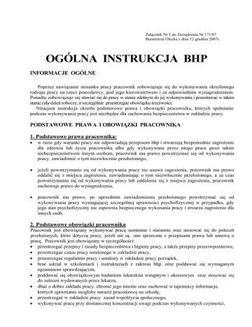 Załącznik Nr 1 do Zarządzenia Nr 171/07 Burmistrza Olecka z dnia 12 grudnia 2007r. OGÓLNA INSTRUKCJA BHP INFORMACJE OGÓLNE Poprzez nawiązanie stosunku pracy pracownik zobowiązuje się do wykonywania określonego rodzaju pracy na rzecz pracodawcy, pod jego kierownictwem i za odpowiednim wynagrodzeniem. Ponadto zobowiązuje się stawiać się do pracy w stanie zdolnym do jej wykonywania i pozostawać w takim stanie cały dzień roboczy, a szczególnie przestrzegać obowiązku trzeźwości. Niniejsza instrukcja określa podstawowe prawa i obowiązki pracownika, których spełnianie podczas wykonywania pracy jest niezbędne dla zachowania bezpieczeństwa w zakładzie pracy. PODSTAWOWE PRAWA I OBOWIĄZKI PRACOWNIKA 1. Podstawowe prawa pracownika: • w razie gdy warunki pracy nie odpowiadają przepisom bhp i stwarzają bezpośrednie zagrożenie dla zdrowia lub życia pracownika albo gdy wykonywana przez niego praca grozi takim niebezpieczeństwem innym osobom, pracownik ma prawo powstrzymać się od wykonywania pracy, zawiadomić o tym niezwłocznie przełożonego, • jeżeli powstrzymanie się od wykonywania pracy nie usuwa zagrożenia, pracownik ma prawo oddalić się z miejsca zagrożenia, zawiadamiając o tym niezwłocznie przełożonego, a za czas powstrzymania się od wykonywania pracy lub oddalenia się z miejsca zagrożenia, pracownik zachowuje prawo do wynagrodzenia, • pracownik ma prawo, po uprzednim zawiadomieniu przełożonego powstrzymać się od wykonywania pracy wymagającej szczególnej sprawności psychofizycznej w przypadku, gdy jego stan psychofizyczny nie zapewnia bezpiecznego wykonania pracy i stwarza zagrożenie dla innych osób. 2. Podstawowe obowiązki pracownika Pracownik jest obowiązany wykonywać pracę sumienne i starannie oraz stosować się do poleceń przełożonych, które dotyczą pracy, jeżeli nie są one sprzeczne z przepisami prawa lub umową o pracę. Pracownik jest obowiązany w szczególności: • przestrzegać przepisy i zasady bezpieczeństwa i higieny pracy, a także przepisy przeciwpożarowe, • przestrzegać czasu pracy ustalonego w zakładzie pracy, • przestrzegać regulamin pracy i ustalony w zakładzie pracy porządek, • brać udział w szkoleniach i instruktażach z zakresu bhp, oraz poddawać się wymaganym egzaminom sprawdzającym, • poddawać się obowiązkowym badaniom lekarskim wstępnym i okresowym oraz stosować się do zaleceń wydawanych przez lekarza, • dbać o dobro zakładu pracy, chronić jego mienie oraz zachować w tajemnicy informacje, których ujawnianie mogłoby narazić pracodawcę na szkodę, • przestrzegać w zakładzie pracy zasad współżycia społecznego, • wykonywać pracę przy dostatecznej koncentracji uwagi podczas wykonywanych czynności, • • • • • • dbać o należyty stan techniczny urządzeń, narzędzi i sprzęt oraz o porządek i ład w miejscu pracy, przerwać pracę w przypadku zauważenia złej pracy urządzenia i powiadomić o tym przełożonego, nie przeprowadzać samowolnie napraw urządzeń, stosować zgodnie z przeznaczeniem przydzieloną odzież i obuwie robocze, a także w miarę potrzeby odzież ochronną, przestrzegać zasady higieny osobistej w pracy, znać instrukcje obsługi i instrukcje bhp obsługiwanych urządzeń oraz przestrzegać podczas pracy ustalenia w zakresie bezpieczeństwa. W PRZYPADKU POWSTANIA POŻARU NALEŻY: Postępować zgodnie z instrukcją przeciwpożarową a w szczególności: • ostrzec osoby znajdujące się w obrębie zagrożenia, • powiadomić przełożonych o pożarze, • zawiadomić straż pożarną, • przystąpić do prowadzenia akcji gaśniczej za pomocą podręcznego sprzętu gaśniczego. • podjąć decyzję o ewakuacji ludzi, Podczas akcji gaśniczej obowiązuje zasada podporządkowania się poleceniom kierującego akcją ratowniczo-gaśniczą. W PRZYPADKU ZAISTNIENIA WYPADKU: Powiadomić przełożonego a w szczególności: • udzielić poszkodowanym pierwszej pomocy, • w razie potrzeby wezwać pogotowie ratunkowe. W PRZYPADKU POWSTANIA AWARII: • • • natychmiast zatrzymać pracę urządzenia, powiadomić przełożonego i wykonywać jego polecenia, podjąć pracę ponownie po wykonaniu naprawy i otrzymaniu polecenia przełożonego. Sankcje karne: Pracownik naruszający przepisy bezpieczeństwa i higieny pracy może być ukarany karą porządkową czyli karą upomnienia lub karą nagany jak również karą pieniężną (art. 108 k.p.) W przypadku ciężkiego naruszenia obowiązków, przez pracownika, w zakresie bezpieczeństwa i higieny pracy, pracodawca może na zasadzie art. 52 § 1 pkt 1 k.p. rozwiązać z pracownikiem umowę o pracę bez wypowiedzenia. Załącznik Nr 2 do Zarządzenia Nr171./07 Burmistrza Olecka z dnia 12 grudnia 2007r. INSTRUKCJA BHP PRZY PRACACH ADMINISTRACYJNO- BIUROWYCH UWAGI OGÓLNE Pracownicy mają obowiązek wykonywać pracę zgodnie z zasadami i przepisami bhp. Jednak obowiązku tego nie będą mogli wypełniać, jeżeli nie będzie odpowiedniego wsparcia od strony pracodawcy lub osób kierujących. Pracownicy nie mogą być obciążani samodzielnym organizowaniem stanowiska pracy – do tego zobowiązany jest pracodawca. Oznacza to, że mają oni prawo zwrócić się do pracodawcy bezpośrednio lub za pośrednictwem osób kierujących o odpowiednie wyposażenie lub o taką zmianę organizacji pracy, by mogli wykonywać pracę przy możliwe minimalnych zagrożeniach i czynnikach szkodliwych. Do pracy administracyjno- biurowej może być skierowany pracownik, który posiada: • Wymagane kwalifikacje do pracy na wyznaczonym stanowisku, • Właściwy stan zdrowia potwierdzony orzeczeniem lekarskim. Bezpieczne warunki pracy w biurze są zapewnione, gdy: • Zapewniona jest dostatecznie duża powierzchnia stanowiska pracy (co najmniej 13m2 wolnej objętości pomieszczenia oraz co najmniej 2m2 wolnej powierzchni podłogi nie zajętej przez urządzenia techniczne, sprzęt itp.) • Jest wła