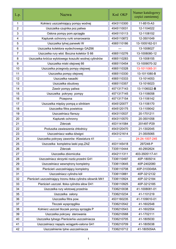 Kod OKP Lp Numer katalogowy części zamiennej