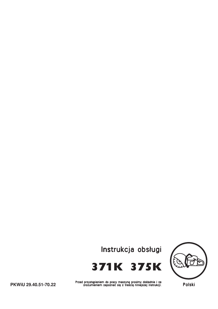Instrukcja obs∏ugi 371K 375K PKWiU 29.40.51-70.22 Przed przystàpieniem do pracy maszynà prosimy dok∏adnie i ze zrozumieniem zapoznaç si´ z treÊcià niniejszej instrukcji. Polski ZNACZENIE SYMBOLI Oznakowanie przecinarki: UWAGA! Przecinarka mo˝e byç niebezpieczna. Nieostro˝ne lub niew∏aÊciwe pos∏ugiwanie si´ przecinarkà mo˝e spowodowaç powa˝ne lub Êmiertelne obra˝enia u˝ytkownika lub innych osób. Symbole wyst´pujàce w instrukcji obs∏ugi: Wy∏àcz silnik przesuwajàc wy∏àcznik w prawo do pozycji STOP przed ka˝dym przeglàdem lub konserwacjà. Przed uruchomieniem przecinarki przeczytaj uwa˝nie instrukcj´ i upewnij si´, ˝e jà zrozumia∏eÊ. Zawsze noÊ autoryzowane r´kawice ochronne. Pracujàc u˝ywaj: • Autoryzowanego kasku ochronnego • Autoryzowanych ochronników s∏uchu • Okularów ochronnych lub siatki ochronnej. Wymagane jest regularne czyszczenie. Niniejszy produkt zgodny jest z obowiàzujàcymi normami CE. Uwaga Przy pracy przecinarkà wytwarzane sà du˝e iloÊci py∏u, które mogà powodowaç uszkodzenia dróg oddechowych. Stosuj odpowiednià mask´ przeciwpy∏owà lub innà ochron´ dróg oddechowych. Unikaj wdychania oparów benzyny i spalin. Zapewnij dobrà wentylacj´ w miejscu pracy. Uwaga Iskry z tarczy tnàcej mogà spowodowaç zapalenie materia∏ów ∏atwopalnych tj.: benzyna (gaz), drewno, sucha trawa itp. Emisja ha∏asu do otoczenia zgodna z dyrektywà Wspólnoty Europejskiej. WartoÊç emisji dla maszyny podana zosta∏a w rozdziale Dane techniczne oraz na naklejce. 2 – Polish Kontrola wzrokowa. Zawsze nale˝y nosiç okulary ochronne lub siatk´ ochronnà. SPIS TREÂCI Co trzeba zrobiç przed u˝yciem nowej przecinarki • Przeczytaj dok∏adnie iInstrukcj´ obs∏ugi. • Sprawdê zamontowanie i regulacj´ tarczy tnàcej, patrz rozdzia∏ „Monta˝”. • W∏àcz silnik i sprawdê ustawienia gaênika. Patrz rozdzia∏ „Obs∏uga przecinarki”, cz´Êç „Gaênik”. Po prawid∏owej regulacji tarcza tnàca nie powinna obracaç si´ na biegu ja∏owym. Ustawienie pr´dkoÊci na biegu ja∏owym jest opisane w Instrukcji Obs∏ugi. Wyreguluj pr´dkoÊç zgodnie z tymi zasadami. Nie u˝ywaj przecinarki, je˝eli pr´dkoÊç na biegu ja∏owym nie zosta∏a odpowiednio ustawiona! • Zlecaj swojemu dealerowi Husqvarny kontrol´ przecinarki oraz wykonywanie najwa˝niejszych regulacji i napraw. ! UWAGA! W ˝adnym przypadku nie wolno modyfikowaç oryginalnego modelu przecinarki bez zgody producenta. U˝ywaj zawsze oryginalnych cz´Êci zamiennych. Nieautoryzowane zmiany lub akcesoria mogà prowadziç do powa˝nych uszkodzeƒ lub Êmierci. Spis treÊci Znaczenie symboli ............................................................ 2 Zasady bezpieczeƒstwa Ârodki ochrony osobistej ........................................................... 4 Zespo∏y zabezpieczajàce przecinarki ................................... 4 Przeglàd, konserwacja i obs∏uga zespo∏ów zabezpieczajàcych przecinarki .................................................................................. 5 Ogólne zasady bezpieczeƒstwa ............................................ 6 Transport i przechowywanie ...................................................... 6 Tankowanie ................................................................................ 7 Ogólne zasady pracy przecinarkà .......................................... 7 Ci´cie ......................................................................................... 7 Odbicie ....................................................................................... 8 Konserwacja i przechowywanie ................................................. 9 Tarcze tnàce .............................................................................. 10 Tarcze Êcierne .......................................................................... 10 Tarcze tnàce ............................................................................ 11 Tarcze diamentowe .................................................................. 11 Opis zespo∏ów przecinarki Opis zespo∏ów przecinarki ........................................................ 12 Monta˝ uk∏adu tnàcego ! UWAGA! U˝ywanie urzàdzeƒ, które tnà, Êcierajà, wiercà, piaskujà lub nadajà kszta∏t materia∏om mo˝e spowodowaç wyst´powanie py∏ów i oparów zawierajàcych szkodliwe Êrodki chemiczne. Nale˝y znaç w∏aÊciwoÊci ci´tego materia∏u i nosiç odpowiednià mask´ przeciwpy∏owà lub innà ochron´ dróg oddechowych. Monta˝ g∏owicy tnàcej ............................................................. 13 Sprawdzanie wa∏ka nap´dowego i podk∏adek tarcz .................. 13 Monta˝ tarczy tnàcej ............................................................... 13 Przechowywanie paliwa Mieszanka paliwowa ................................................................ 14 Tankowanie .............................................................................. 14 Uruchamianie i wy∏àczanie przecinarki Uruchamianie i wy∏àczanie przecinarki ..................................... 15 Obs∏uga przecinarki Regulacja paska nap´dowego ................................................... 16 Wymiana paska nap´dowego .................................................. 16 Gaênik ...................................................................................... 17 Filtr paliwa ................................................................................ 18 Filtr powietrza ........................................................................... 18 Rozrusznik ................................................................................ 19 Âwieca zap∏onowa .................................................................... 20 T∏umik ...................................................................................... 20 Uk∏ad ch∏odzenia ...................................................................