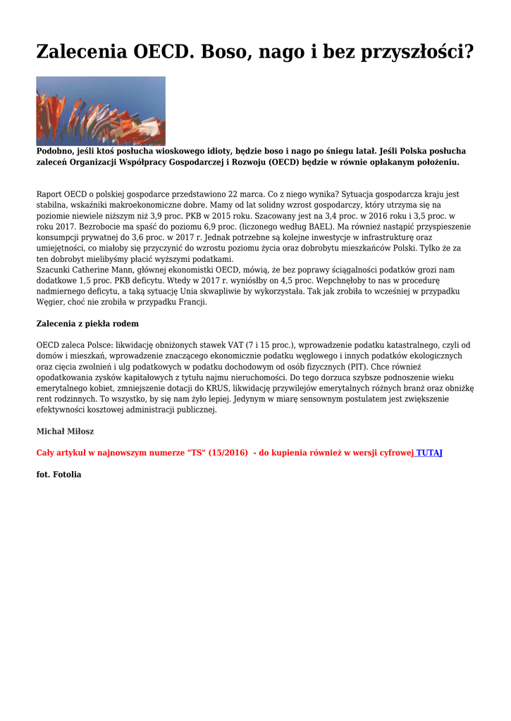Zalecenia OECD. Boso, nago i bez przyszłości? Podobno, jeśli ktoś posłucha wioskowego idioty, będzie boso i nago po śniegu latał. Jeśli Polska posłucha zaleceń Organizacji Współpracy Gospodarczej i Rozwoju (OECD) będzie w równie opłakanym położeniu. Raport OECD o polskiej gospodarce przedstawiono 22 marca. Co z niego wynika? Sytuacja gospodarcza kraju jest stabilna, wskaźniki makroekonomiczne dobre. Mamy od lat solidny wzrost gospodarczy, który utrzyma się na poziomie niewiele niższym niż 3,9 proc. PKB w 2015 roku. Szacowany jest na 3,4 proc. w 2016 roku i 3,5 proc. w roku 2017. Bezrobocie ma spaść do poziomu 6,9 proc. (liczonego według BAEL). Ma również nastąpić przyspieszenie konsumpcji prywatnej do 3,6 proc. w 2017 r. Jednak potrzebne są kolejne inwestycje w infrastrukturę oraz umiejętności, co miałoby się przyczynić do wzrostu poziomu życia oraz dobrobytu mieszkańców Polski. Tylko że za ten dobrobyt mielibyśmy płacić wyższymi podatkami. Szacunki Catherine Mann, głównej ekonomistki OECD, mówią, że bez poprawy ściągalności podatków grozi nam dodatkowe 1,5 proc. PKB deficytu. Wtedy w 2017 r. wyniósłby on 4,5 proc. Wepchnęłoby to nas w procedurę nadmiernego deficytu, a taką sytuację Unia skwapliwie by wykorzystała. Tak jak zrobiła to wcześniej w przypadku Węgier, choć nie zrobiła w przypadku Francji. Zalecenia z piekła rodem OECD zaleca Polsce: likwidację obniżonych stawek VAT (7 i 15 proc.), wprowadzenie podatku katastralnego, czyli od domów i mieszkań, wprowadzenie znaczącego ekonomicznie podatku węglowego i innych podatków ekologicznych oraz cięcia zwolnień i ulg podatkowych w podatku dochodowym od osób fizycznych (PIT). Chce również opodatkowania zysków kapitałowych z tytułu najmu nieruchomości. Do tego dorzuca szybsze podnoszenie wieku emerytalnego kobiet, zmniejszenie dotacji do KRUS, likwidację przywilejów emerytalnych różnych branż oraz obniżkę rent rodzinnych. To wszystko, by się nam żyło lepiej. Jedynym w miarę sensownym postulatem jest zwiększenie efektywności kosztowej administracji publicznej. Michał Miłosz Cały artykuł w najnowszym numerze "TS" (15/2016) - do kupienia również w wersji cyfrowej TUTAJ fot. Fotolia