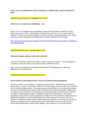 SYTUACJA W SZKOLNICTWIE WYŻSZYM, „DZIENNIK GAZETA PRAWNA” 2016 Dziennik Gazeta Prawna, 22 listopada 2016, nr 225 Doktorat za wdrożenia tak, habilitacja – nie Prawie 2,5 tys. zł dodatkowego stypendium miesięcznie ma dostawać naukowiec, który będzie pracował w firmie i jednocześnie robił doktorat. Ale nie ma na to zgody ministra finansów. Wniósł on uwagi do projektu nowelizacji ustawy o stopniach naukowych i tytule naukowym, który zaproponowało Ministerstwo Nauki i Szkolnictwa Wyższego. http://serwisy.gazetaprawna.pl/edukacja/artykuly/994970,doktorat-wdrozeniowy-habilitacjaza-wdrozenia.html Dziennik Gazeta Prawna, 1 grudnia 2016, nr 232 Branżowe stopnie naukowe tylko dla wybitnych Zniesienie habilitacji i nadawania tytułów profesora przez prezydenta – tego domagają się związkowcy. Resort nauki na razie planuje mniej radykalne zmiany. http://serwisy.gazetaprawna.pl/edukacja/artykuly/997778,habilitacja-za-wdrozeniahabilitacja-z-wynalazek.html Dziennik Gazeta Prawna, 8 grudnia 2016, nr 237 Nowa ścieżka do podwójnej kariery na pewno pobudzi polską gospodarkę W Polsce studiuje wielu zdolnych i ambitnych młodych ludzi. Mają dobrych opiekunów i śmiałe plany rozwoju swojej kariery naukowej. Dzisiaj mogą rozwijać ją tylko na uczelniach lub w instytutach badawczych. Tymczasem polscy przedsiębiorcy coraz częściej poszukują wysoko wykwalifikowanych pracowników do budowania własnych zespołów badawczych, bo wiedzą, że bez ich pracy nie powstaną innowacyjne produkty. Równocześnie j ednym z czynników ograniczających zakres współpracy środowiska naukowego z otoczeniem gospodarczym jest brak wyraźnie określonych możliwości rozwoju kariery akademickiej na podstawie osiągnięć w pracach wdrożeniowych. Osoby odnoszące znaczące sukcesy w obszarze wykorzystywania wyników badań naukowych lub prac rozwojowych w otoczeniu społeczno-gospodarczym nie mają obecnie jasno określonych zasad rozwoju kariery w środowisku akademickim. Resort nauki pragnie wyjść naprzeciw tym oczekiwaniom. http://serwisy.gazetaprawna.pl/edukacja/artykuly/999864,dardzinski-nowa-sciezka-dopodwojnej-kariery-na-pewno-pobudzi-polska-gospodarke.html Dziennik Gazeta Prawna, 12 grudnia 2016, nr 239 Habilitacje za wdrożenie jednak pod kontrolą Centralna Komisja ds. Stopni i Tytułów będzie mogła zablokować decyzję rektora, który przyzna uprawnienia habilitacyjne nauczycielowi akademickiemu. Taką zmianę wprowadzi Ministerstwo Nauki i Szkolnictwa Wyższego do projektu nowelizacji ustawy o stopniach i tytule naukowym. http://serwisy.gazetaprawna.pl/edukacja/artykuly/1000761,habilitacje-za-wdrozenie-podkontrola.html Dziennik Gazeta Prawna, 14 grudnia 2016, nr 241 Trudno potwierdzić zagraniczne wykształcenie prawnicze Absolwenci, którzy ukończyli studia prawnicze w innych krajach, mają problem z poświadczeniem zdobytego wykształcenia w Polsce. Sprawa ma trafić do Strasburga. http://serwisy.gazetaprawna.pl/edukacja/artykuly/1001504,trudno-potwierdzic-zagranicznewyksztalcenie.html Dziennik Gazeta Prawna, 29 grudnia 2016, nr 251 Akademicy więcej zarobią na nadgodzinach. Pieniądze szybciej trafią na ich konta 44 zł – tyle będą mieli zagwarantowane asystenci pracujący w godzinach nadliczbowych na uczelniach. Profesorowie dostaną nie mniej niż 97 zł. Tak wynika z rozporządzenia ministra nauki i szkolnictwa wyższego z 2 grudnia 2016 r. w sprawie warunków wynagradzania za pracę i przyznawania innych świadczeń związanych z pracą dla pracowników zatrudnionych w uczelni publicznej (Dz.U. poz. 2063). http://serwisy.gazetaprawna.pl/praca-i-kariera/artykuly/1006114,akademicy-dostanapodwyzki-za-nadgodziny.html Dziennik Gazeta Prawna, 15 grudnia 2016, nr 242 Akademicy budują front przeciwko Gowinowi Środowisko akademickie chce zablokować zmianę zasad finansowania uczelni, która już została zatwierdzona przez ministra nauki Jarosława Gowina. Szuka więc poparcia wśród posłów. http://serwisy.gazetaprawna.pl/edukacja/artykuly/1002490,zmiany-w-finansowaniuuczelni.html
