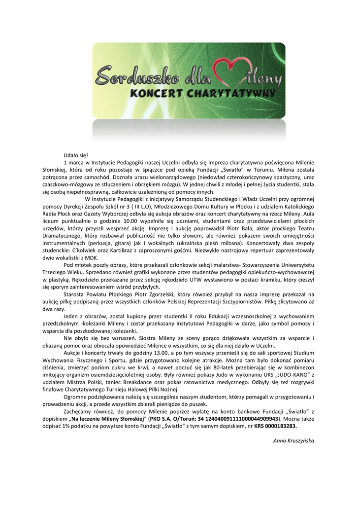 Udało się! 1 marca w Instytucie Pedagogiki naszej Uczelni odbyła się impreza charytatywna poświęcona Milenie Słomskiej, która od roku pozostaje w śpiączce pod opieką Fundacji „Światło” w Toruniu. Milena została potrącona przez samochód. Doznała urazu wielonarządowego (niedowład czterokooczynowy spastyczny, uraz czaszkowo-mózgowy ze stłuczeniem i obrzękiem mózgu). W jednej chwili z młodej i pełnej życia studentki, stała się osobą niepełnosprawną, całkowicie uzależnioną od pomocy innych. W Instytucie Pedagogiki z inicjatywy Samorządu Studenckiego i Władz Uczelni przy ogromnej pomocy Dyrekcji Zespołu Szkół nr 3 ( III L.O), Młodzieżowego Domu Kultury w Płocku i z udziałem Katolickiego Radia Płock oraz Gazety Wyborczej odbyła się aukcja obrazów oraz koncert charytatywny na rzecz Mileny. Aula liceum punktualnie o godzinie 10.00 wypełniła się uczniami, studentami oraz przedstawicielami płockich urzędów, którzy przyszli wesprzed akcję. Imprezę i aukcję poprowadził Piotr Bała, aktor płockiego Teatru Dramatycznego, który rozbawiał publicznośd nie tylko słowem, ale również pokazem swoich umiejętności instrumentalnych (perkusja, gitara) jak i wokalnych (ukraioska pieśo miłosna). Koncertowały dwa zespoły studenckie: C’kolwiek oraz KartiBraz z zaproszonymi gośdmi. Niezwykle nastrojowy repertuar zaprezentowały dwie wokalistki z MDK. Pod młotek poszły obrazy, które przekazali członkowie sekcji malarstwa- Stowarzyszenia Uniwersytetu Trzeciego Wieku. Sprzedano również grafiki wykonane przez studentów pedagogiki opiekuoczo-wychowawczej w plastyką. Rękodzieło przekazane przez sekcję rękodzieło UTW wystawiono w postaci kramiku, który cieszył się sporym zainteresowaniem wśród przybyłych. Starosta Powiatu Płockiego Piotr Zgorzelski, który również przybył na nasza imprezę przekazał na aukcję piłkę podpisaną przez wszystkich członków Polskiej Reprezentacji Szczypiornistów. Piłkę zlicytowano aż dwa razy. Jeden z obrazów, został kupiony przez studentki II roku Edukacji wczesnoszkolnej z wychowaniem przedszkolnym -koleżanki Mileny i został przekazany Instytutowi Pedagogiki w darze, jako symbol pomocy i wsparcia dla poszkodowanej koleżanki. Nie obyło się bez wzruszeo. Siostra Mileny ze sceny gorąco dziękowała wszystkim za wsparcie i okazaną pomoc oraz obiecała opowiedzied Milence o wszystkim, co się dla niej działo w Uczelni. Aukcje i koncerty trwały do godziny 13.00, a po tym wszyscy przenieśli się do sali sportowej Studium Wychowania Fizycznego i Sportu, gdzie przygotowano kolejne atrakcje. Można tam było dokonad pomiaru ciśnienia, zmierzyd poziom cukru we krwi, a nawet poczud się jak 80-latek przebierając się w kombinezon imitujący organizm osiemdziesięcioletniej osoby. Były również pokazy Judo w wykonaniu UKS „JUDO-KANO” z udziałem Mistrza Polski, taniec Breakdance oraz pokaz ratownictwa medycznego. Odbyły się też rozgrywki finałowe Charytatywnego Turnieju Halowej Piłki Nożnej. Ogromne podziękowania należą się szczególnie naszym studentom, którzy pomagali w przygotowaniu i prowadzeniu akcji, a przede wszystkim zbierali pieniądze do puszek. Zachęcamy również, do pomocy Milenie poprzez wpłatę na konto bankowe Fundacji „Światło” z dopiskiem „Na leczenie Mileny Słomskiej” (PKO S.A. O/Toruo: 34 124040091111000044909943). Można także odpisad 1% podatku na powyższe konto Fundacji „Światło” z tym samym dopiskiem, nr KRS 0000183283. Anna Kruszyńska