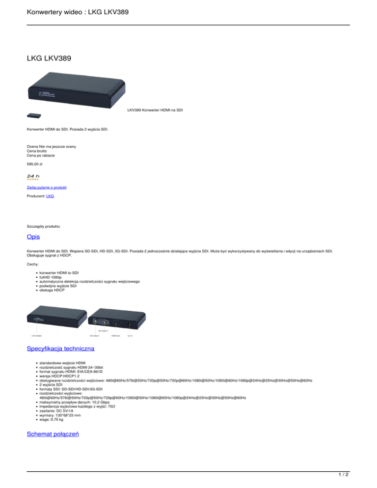 Konwertery wideo : LKG LKV389 LKG LKV389 LKV389 Konwerter HDMI na SDI Konwerter HDMI do SDI. Posiada 2 wyjścia SDI. Ocena Nie ma jeszcze oceny Cena brutto Cena po rabacie 595,00 zł Zadaj pytanie o produkt Producent: LKG Szczegóły produktu Opis Konwerter HDMI do SDI. Wspiera SD-SDI, HD-SDI, 3G-SDI. Posiada 2 jednocześnie działające wyjścia SDI. Może być wykorzystywany do wyświetlania i edycji na urządzeniach SDI. Obsługuje sygnał z HDCP. Cechy: konwerter HDMI to SDI fullHD 1080p automatyczna detekcja rozdzielczości sygnału wejściowego podwójne wyjście SDI obsługa HDCP Specyfikacja techniczna standardowe wejście HDMI rozdzielczość sygnału HDMI 24~30bit format sygnału HDMI: EIA/CEA-861D wersja HDCP:HDCP1.2 obsługiwane rozdzielczości wejściowe: 480i@60Hz/576i@50Hz/720p@50Hz/720p@60Hz/1080i@50Hz/1080i@60Hz/1080p@24Hz@25Hz@30Hz@50Hz@60Hz 2 wyjścia SDI formaty SDI: SD-SDI/HD-SDI/3G-SDI rozdzielczości wyjściowe: 480i@60Hz/576i@50Hz/720p@50Hz/720p@60Hz/1080i@50Hz/1080i@60Hz/1080p@24Hz@25Hz@30Hz@50Hz@60Hz maksymalny przepływ danych: 10,2 Gbps impedancja wyjściowa każdego z wyjść: 75Ω zasilanie: DC 5V/1A wymiary: 130*68*23 mm waga: 0,75 kg Schemat połączeń 1/2 Konwertery wideo : LKG LKV389 English LKV389 HDMI to SDI converter converts HDMI audio/video embedded signal to a broadcastquality SDI signal and analog audio. SD-SDI, HD-SDI, 3G-SDI are supported. Itcan be used to display and edit in SDI devices. HDMI to SDI converter LKV389 converts HDMI to SDI by pass-through basedon LENKENG 10-year technical experience on conversion technology, making thepicture more vivid. FullHD 1080p; bring you into a new frontier LKV389applies LENKENG leading video conversion technology to convert HDMI to SDIsignal, 3G-SDI supported. It’s quitesuitable for professional broadcast editing. Intelligent HDMI to SDI converter LKV389can automatically detect HDMI resolution. Plug and play, no drivers or softwarerequired, making you enjoy the convenience and the visual impact. Dual SDI outputs LKV389 integrates HDMI to SDI converter and SDI splitter into one set. Broadcast-qualityHDMI to SDI converter As an HDMI adaptor, weknow more about HDMI specifications. There’sEDID detected technology on the input, supports all specifications of HDMI1.3. Theoutput can be up to 3G-SDI 1080P 50Hz/60Hz, Max bit rate: 2.97G/S. All of these canmeet the professional requirement of the Radio/Television broadcast room andNon-line edit system. Specifications HDMI Input: HDMI Port: Standard HDMI HDMI bandwidth: 24bit~30bit HDMI Signal format: EIA/CEA-861D HDCP Version: HDCP1.2 SDI Output: SDI format: SD-SDI/HD-SDI/3G-SDI SDI Compliance: SMPTE-259/274/296/372/424/425/292 SDI Port:Standard SDI*2 SDI Impedance: 75Ω SDI Audio: SDI embedded audio up to 8 channels Power: Power In: DC5V/1A Unit: Dimension: 130*68*23 mm Weight:0.75KG 2/2 Powered by TCPDF (www.tcpdf.org)