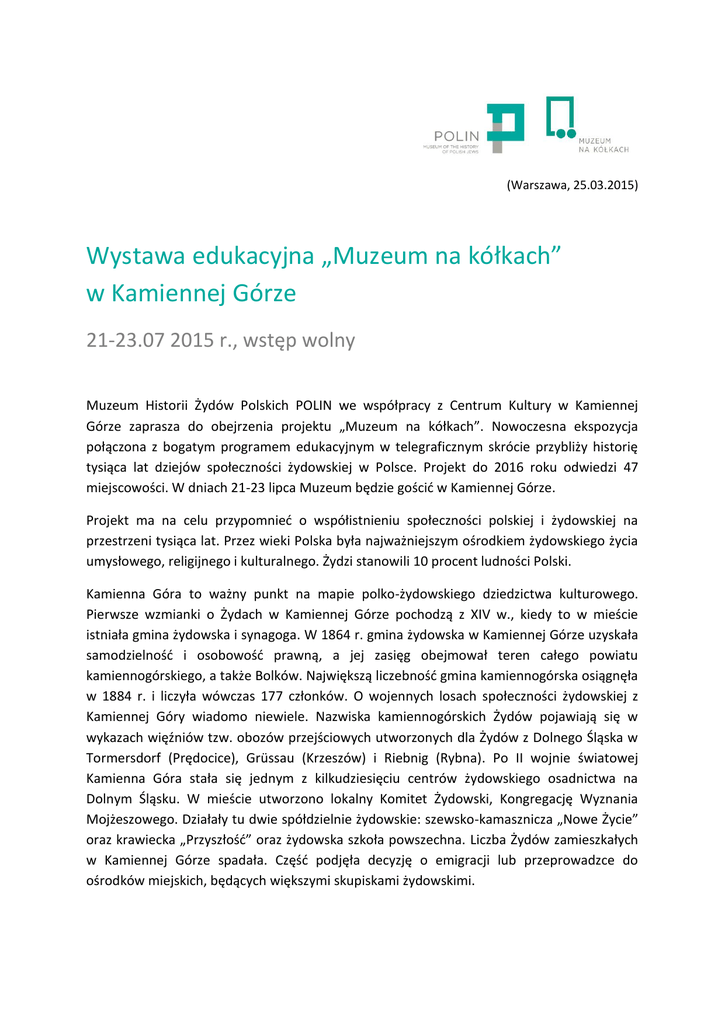(Warszawa, 25.03.2015) Wystawa edukacyjna „Muzeum na kółkach” w Kamiennej Górze 21-23.07 2015 r., wstęp wolny Muzeum Historii Żydów Polskich POLIN we współpracy z Centrum Kultury w Kamiennej Górze zaprasza do obejrzenia projektu „Muzeum na kółkach”. Nowoczesna ekspozycja połączona z bogatym programem edukacyjnym w telegraficznym skrócie przybliży historię tysiąca lat dziejów społeczności żydowskiej w Polsce. Projekt do 2016 roku odwiedzi 47 miejscowości. W dniach 21-23 lipca Muzeum będzie gościć w Kamiennej Górze. Projekt ma na celu przypomnieć o współistnieniu społeczności polskiej i żydowskiej na przestrzeni tysiąca lat. Przez wieki Polska była najważniejszym ośrodkiem żydowskiego życia umysłowego, religijnego i kulturalnego. Żydzi stanowili 10 procent ludności Polski. Kamienna Góra to ważny punkt na mapie polko-żydowskiego dziedzictwa kulturowego. Pierwsze wzmianki o Żydach w Kamiennej Górze pochodzą z XIV w., kiedy to w mieście istniała gmina żydowska i synagoga. W 1864 r. gmina żydowska w Kamiennej Górze uzyskała samodzielność i osobowość prawną, a jej zasięg obejmował teren całego powiatu kamiennogórskiego, a także Bolków. Największą liczebność gmina kamiennogórska osiągnęła w 1884 r. i liczyła wówczas 177 członków. O wojennych losach społeczności żydowskiej z Kamiennej Góry wiadomo niewiele. Nazwiska kamiennogórskich Żydów pojawiają się w wykazach więźniów tzw. obozów przejściowych utworzonych dla Żydów z Dolnego Śląska w Tormersdorf (Prędocice), Grüssau (Krzeszów) i Riebnig (Rybna). Po II wojnie światowej Kamienna Góra stała się jednym z kilkudziesięciu centrów żydowskiego osadnictwa na Dolnym Śląsku. W mieście utworzono lokalny Komitet Żydowski, Kongregację Wyznania Mojżeszowego. Działały tu dwie spółdzielnie żydowskie: szewsko-kamasznicza „Nowe Życie” oraz krawiecka „Przyszłość” oraz żydowska szkoła powszechna. Liczba Żydów zamieszkałych w Kamiennej Górze spadała. Część podjęła decyzję o emigracji lub przeprowadzce do ośrodków miejskich, będących większymi skupiskami żydowskimi. Więcej o historii żydowskiej Kamiennej Górze: http://www.sztetl.org.pl/pl/city/kamiennagora/ W Kamiennej Górze będzie można zobaczyć „Muzeum na kółkach” na Rynku Miasta. Podczas naszej wizyty koordynatorzy lokalni przygotowali specjalny program wydarzeń towarzyszących naszej wizycie: - Wydanie informatora turystycznego "Śladami kamiennogóskiej kultury żydowskiej" - Spacery z przewodnikiem po miejscach związanych z życiem i zabytkami kultury żydowskiej miasta - "Oni tu mieszkali" – wykłady o wybitnych Żydach z Kamiennej Góry - Spotkanie z Rutą Wermuth, autorką książki "Spotkałam Ludzi" Głównym powodem, dla którego chcę uczestniczyć w projekcie jest świadomość, że budowanie postaw tolerancji społecznej wobec różnych grup, wyznań i obyczajów jest w dzisiejszych czasach obowiązkiem instytucji oświatowych i kulturalnych. Odradzającym się ideologiom nacjonalistycznym i obserwowanym aktom agresji wobec „innego” trzeba przeciwstawiać idee poszanowania inności poprzez zapoznawanie społeczności z kulturą, religią i obyczajowością żyjących obok nas ludzi – mówi Anna Przerwa, koordynatorka lokalna „Muzeum na kółkach” w Kamiennej Górze. Centralnym punktem wystawy jest interaktywna mapa każdego miasta, które odwiedza „Muzeum na kółkach”, na której zostały opisane ważne miejsca związane z lokalną historią żydowską. Poprzez trójwymiarową makietę sztetla przybliżamy najważniejsze miejsca typowego polsko-żydowskiego miasteczka. Opowiadamy również o jidysz, hebrajskim i polskim – trzech współistniejących i przenikających się językach, którymi posługiwali się polscy Żydzi. Projekt jest podziękowaniem dla lokalnych liderów i aktywistów, którzy poświęcają swój czas i środki na dbanie o pamięć o polskich Żydach. „Muzeum na kółkach” zaprasza widzów do interakcji, dzielenia się własnymi wspomnieniami oraz odkrywania zapomnianego dziedzictwa. Ekspozycji towarzyszyć będzie szereg działań edukacyjnych i kulturalnych. Zwiedzanie wystawy i udział w zajęciach prowadzonych przez animatorów są bezpłatne. Od maja do sierpnia 2015 roku „Muzeum na kółkach” będzie łącznie w 22 miejscowościach w województwie pomorskim, zachodniopomorskim, lubelskim, dolnośląskim, śląskim, opolskim, świętokrzyskim i wielkopolskim. Inauguracja projektu odbyła się 26 czerwca 2014 roku w Warszawie. Do kwietnia 2016 roku „Muzeum na kółkach” odwiedzi 47 miejscowości Więcej informacji na stronie internetowej Muzeum Historii Żydów Polskich Polin w Warszawie: http://www.polin.pl/pl/muzeumnakolkach oraz na Facebooku „Muzeum na kółkach”: https://www.facebook.com/muzeumnakolkach Zapraszamy Projekt Muzeum na kółkach realizowany jest w ramach programu Żydowskie dziedzictwo kulturowe, dzięki wsparciu udzielonemu z funduszy norweskich i EOG przez Islandię, Liechtenstein i Norwegię.