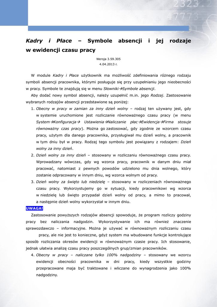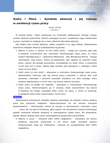Kadry i Płace – Symbole absencji i jej rodzaje w ewidencji czasu pracy Wersja 3.59.305 4.04.2013 r. W module Kadry i Płace użytkownik ma możliwość zdefiniowania różnego rodzaju symboli absencji pracownika, którymi posługuje się przy uzupełnianiu jego nieobecności w pracy. Symbole te znajdują się w menu SłownikiSymbole absencji. Aby dodać nowy symbol absencji, należy uzupełnić m.in. jego Rodzaj. Zastosowanie wybranych rodzajów absencji przedstawione są poniżej: 1. Obecny w pracy w zamian za inny dzień wolny – rodzaj ten używany jest, gdy w systemie uruchomione jest rozliczanie równoważnego czasu pracy (w menu SystemKonfiguracja UstawieniaNaliczanie płacEwidencjaFirma stosuje równoważny czas pracy). Można go zastosować, gdy zgodnie ze wzorcem czasu pracy, użytym dla danego pracownika, przysługiwał mu dzień wolny, a pracownik w tym dniu był w pracy. Rodzaj tego symbolu jest powiązany z rodzajem: Dzień wolny za inny dzień. 2. Dzień wolny za inny dzień – stosowany w rozliczaniu równoważnego czasu pracy. Wprowadzany wówczas, gdy wg wzorca pracy, pracownik w danym dniu miał pracować, natomiast z pewnych powodów udzielono mu dnia wolnego, który zostanie odpracowany w innym dniu, wg wzorca wolnym od pracy. 3. Dzień wolny za święto lub niedzielę – stosowany w rozliczeniach równoważnego czasu pracy. Wykorzystujemy go w sytuacji, kiedy pracownikowi wg wzorca w niedzielę lub święto przypadał dzień wolny od pracy, a mimo to pracował, a następnie dzień wolny wykorzystał w innym dniu. UWAGA! Zastosowanie powyższych rodzajów absencji spowoduje, że program rozliczy godziny pracy bez naliczania nadgodzin. Wykorzystywanie ich ma również znaczenie sprawozdawczo – informacyjne. Można je używać w równoważnym rozliczaniu czasu pracy, ale nie jest to konieczne, gdyż system ma wbudowane funkcje kontrolujące sposób rozliczania okresów ewidencji w równoważnym czasie pracy. Ich stosowanie, jednak ułatwia analizę czasu pracy poszczególnych grup/zmian pracowników. 4. Obecny w pracy – naliczane tylko 100% nadgodziny – stosowany we wzorcu ewidencji obecności pracownika w dni pracy, kiedy wszystkie godziny przepracowane maja być traktowane i wliczane do wynagrodzenia jako 100% nadgodziny. 1 5. Chorobowe bezpłatne – rodzaj ten nie jest już wykorzystywany. Występuje w systemie, ponieważ używany był we wcześniejszych ewidencjach czasu pracy. Dotyczy on stanu prawnego, kiedy wynagrodzenie „krótkoterminowe” (tzn. do 7 dni) było wypłacane za 6 dni, a pierwszy dzień był dniem bezpłatnego chorobowego. 6. Urlop wypoczynkowy – niepełny dzień – stosuje się, gdy pracownikowi z rozliczenia godzin urlopu, pozostała liczba godzin w niepełnym dniu do wykorzystania. Oznacza to, że wg wzorca nie ma takiego dnia, w którym pracownik mógłby wykorzystać pozostały urlop. Jest to jedyny przypadek prawnie przewidziany (Kodeksem pracy), w którym pracodawca może udzielić pracownikowi urlopu w wymiarze niepełnego dnia. Przykład wystąpienia takiej sytuacji: praca w niepełnym wymiarze czasu pracy, praca wg wzorca, gdzie pracownik każdego dnia ma wprowadzony inny wymiar godzin do przepracowania. 7. Urlop „połówkowy” – rodzaj ten nie jest już wykorzystywany. Stosowany był w poprzednim systemie rozliczania urlopu wg dni, a nie godzin. 8. Delegacja (obecny w pracy) – rodzaj absencji stosowany dla celów sprawozdawczych oraz kontrolnych. Służy do wyróżnienia dni przepracowanych przez pracownika w delegacji. 9. Urlop dodatkowy dla I i II gr. niepełnosprawności – wykorzystywany w celach sprawozdawczych i kontrolnych. Stosowany do rozliczania dodatkowych dni urlopu dla osób z orzeczeniem o I lub II grupie niepełnosprawności. 10. Wzorzec – dzień do przepracowania – ten rodzaj absencji wpływa na zmiany normy czasu pracy, czyli na dni do przepracowania i dni przepracowane. Jest on powiązany z przyciskiem Dni wzorca, znajdującym się w menu KadryDane kadroweEwidencja. System posiada funkcje kontrolującą przypisanie tego symbolu do Dni wzorca, dzięki czemu podczas zapisywania Karty ewidencji obecności program zapyta, czy dany symbol z tym rodzajem jest/ma być powiązany, np. z symbolem P – Pracował. Ten rodzaj absencji można stosować, gdy pracownik z pewnych powodów, w dniu wolnym od pracy pracował i w związku z tym zwiększa mu się liczba dni do przepracowania oraz dni przepracowanych, a nie wpływa to na płacę zasadniczą ani podstawową. 11. Wzorzec – dzień wolny – wpływa na zmiany normy czasu pracy, ale nie wpływa na wysokość płacy zasadniczej i podstawowej. Można go zastosować, gdy pracownik wg wzorca miał dzień do przepracowania, ale został mu w tym dniu udzielony dzień wolny od pracy. Program pomniejsza liczbę dni do przepracowania i dni przepracowanych. Tego rodzaju absencji można użyć w przypadku dni świątecznych 2 przypadających w sobotę, kiedy regulamin zakładu stanowi o tym, że każdy pracownik w innym dniu może wykorzystać dzień wolny za święto przypadające w sobotę, np. 1 maja 2010 r. Jeśli regulamin mówi, że zakład udziela wszystkim pracownikom dzień wolny w określonym dniu danego miesiąca, wówczas użytkownik w menu SłownikiWzorce ewidencji obecności-Popraw <F5> w danym dniu usuwa symbol, np. P – Pracował. Taka czynność spowoduje, że pracownikom, którzy mają przypisany dany wzorzec, system automatycznie go zaktualizuje oraz pomniejszy normę czasu pracy. 3