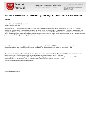 KOLEJE MAZOWIECKIE INFORMUJĄ - POCIĄG 'SŁONECZNY' Z WARSZAWY DO GDYNI Data publikacji: 2013-07-12, 13:51:31 Dodał/a: Dorota Sobotka 29 czerwca 2013 r. po raz dziewiąty na tory wyjechał pociąg „Słoneczny” z Warszawy do Gdyni. To wakacyjne połączenie, stworzone dla mieszkańców Mazowsza corocznie cieszy się niesłabnącym powodzeniem. Połączenie obsługiwane jest wygodnymi, klimatyzowanymi, piętrowymi wagonami o podwyższonym standardzie. W tym roku po raz pierwszy będzie można nabyć bilety także przez telefon komórkowy. Bilet normalny kosztuje 50 zł w jedną stronę, bilet studencki 24,50 zł, a dzieci do lat 4 jadą za darmo. Rozkład jazdy pociągu jest dostępny na stronie www.mazowieckie.com.pl. Na pokładzie pasażerowie mogą skorzystać z cateringu, wygodnych "lotniczych" foteli, toalet przystosowanych dla osób niepełnosprawnych oraz mam z małymi dziećmi. Dodatkowo, w cenie biletu można zabrać ze sobą rower i psa. W tym roku została przygotowana akcja „Słoneczny wysyp rabatowy”. Przy zakupie biletu nad morze podróżny otrzyma w wybranych kasach książeczkę rabatową upoważniającą go do wielu zniżek i promocji w atrakcyjnych miejscach w Trójmieście i okolicach. Książeczkę będzie można również pobrać z oficjalnej strony Kolei Mazowieckich www.mazowieckie.com.pl. Ponadto, Spółka przygotowała konkurs związany z akcją, w którym do wygrania będą atrakcyjne nagrody źródło: powiatpultuski.pl