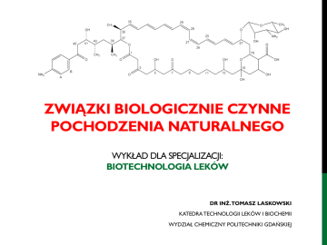 ZWIĄZKI BIOLOGICZNIE CZYNNE POCHODZENIA NATURALNEGO WYKŁAD DLA SPECJALIZACJI: BIOTECHNOLOGIA LEKÓW DR INŻ. TOMASZ LASKOWSKI KATEDRA TECHNOLOGII LEKÓW I BIOCHEMII WYDZIAŁ CHEMICZNY POLITECHNIKI GDAŃSKIEJ CZĘŚĆ VI: TERPENY I TERPENOIDY RANGA ZWIĄZKÓW NATURALNYCH Pod względem rangi, związki naturalne można podzielić na trzy grupy: RANGA ZWIĄZKÓW NATURALNYCH BIOMAKROMOLEKUŁY METABOLITY PIERWOTNE METABOLITY WTÓRNE RNA (mRNA, tRNA, etc.) aminokwasy i peptydy fenole i polifenole DNA cukry flawonoidy białka strukturalne lipidy terpeny i terpenoidy enzymy nukleotydy alkaloidy rybozymy …i inne (?) pochodne poliketydów …oraz wiele ich pochodnych steroidy …oraz niezliczone ilości ich pochodnych „KREW” DRZEWA W miejscach uszkodzenia drzew (głównie iglastych) pojawia się żywica. Jej funkcja polega na zabezpieczaniu „ran” drzewa, pełni więc podobną funkcję, co płytki krwi. Dodatkowo, w celu lepszej ochrony organizmu, jej składniki powinny działać bakteriobójczo. Żywica znajduje się specjalnych przestrzeniach międzykomórkowych lub w dedykowanych kanalikach, które biegną przez cały pień oraz gałęzie drzewa. Destylat z żywicy (destylacja z parą wodną) nazywa się terpentyną. Jednym z głównych składników terpentyny są węglowodory o wzorze sumarycznym (C5H8)n, które na cześć terpentyny nazwano terpenami. Pochodne terpenów, tj. związki zawierające – prócz szkieletu węglowodorowego terpenu – dowolne heteroatomy nazywa się terpenoidami. IZOPREN – JEDNOSTKA BUDULCOWA Ogólny wzór sumaryczny terpenów - (C5H8)n - wyraźne sugeruje, że terpeny zbudowane są z jakiejś jednostki budulcowej.Tą jednostką jest izopren. IZOPREN – JEDNOSTKA BUDULCOWA Izopren, a także pozostałe terpeny są produktami szlaku kwasu mewalonowego, który jest jednym z najstarszych ewolucyjnie szlaków. IZOPREN – JEDNOSTKA BUDULCOWA Izopren, a także pozostałe terpeny są produktami szlaku kwasu mewalonowego, który jest jednym z najstarszych ewolucyjnie szlaków. IZOPREN – JEDNOSTKA BUDULCOWA Izopren, a także pozostałe terpeny są produktami szlaku kwasu mewalonowego, który jest jednym z najstarszych ewolucyjnie szlaków. TERPENY I TERPENOIDY Terpeny i terpenoidy to jedna z najbardziej licznych grup metabolitów wtórnych. Zawiera dosłownie tysiące przedstawicieli, m.in.: monoterpeny: ocymen, myrcen, limonen, p-cymen, α- i β-pinen, karen, sabinen, kamfen; monoterpenoidy: geraniol, cytral, cytronellol, linalool, halomon, mentol, tymol, karwakrol, kamfora, borneol, eukaliptol, tujon; seskwiterpeny: zingiberen, humulen, kariofilen, kadinen, wetiwazulen, gwajazulen, longifolen, kopaen, eudesman; seskwiterpenoidy: paczulol, farnezol, santonina, diktioforyna A i B, knicyna; diterpeny: sklaren, stemaren, taksadien, labdan, cembren A; diterpenoidy: kwas abietynowy, afidiokolina, kafestol, ferruginol, forskolina, guanakastafen A, kahweol, stewiol, tiamulina; triterpeny: skwalen, oleanan, ursan; triterpenoidy: ambreina, kwas ganoderowy, lanosterol, cholesterol, ergosterol, progesteron i wszystkie amiryny, onoceryna, kwas betulinowy, kwas ursolowy… …i wiele, wiele innych. LIMONEN (4R)-(+)-1-metylo-4-(1-metyloetenylo)cykoheksan Skąd: olejek ze słodkich pomarańczy brazylijskich, Citrus sinensis L. (Rutaceae) C10H16, MW 136.23 Bezbarwa ciecz, bp 177-178°C, bp 42-43 °C (900 Pa) [α]25D +114.0° (c 0.264 g/mL, etanol) Limonen jest dostępny komercyjnie. Synonimy: D-(+)-Limonen, (+)-α-Limonen, (+)-Dipenten, (R)-p-Menta-1,8-dien. LIMONEN - IZOLACJA LIMONEN – BADANIA STRUKTURALNE UV-VIS + DICHROIZM KOŁOWY Absoprcja w UV-VIS charakterystyczna dla wiązań C=C. Słaby dodatni efekt Cottona = obecność chiralnie zaburzonego chromoforu. LIMONEN – BADANIA STRUKTURALNE IR (SPEKTROSKOPIA W PODCZERWIENI) Charakterystyczne drgania: rozciągające asymetryczne –CH3. =C-H, -C-H, C=C, nożycowe symetryczne i LIMONEN – BADANIA STRUKTURALNE NMR (MAGNETYCZNY REZONANS JĄDROWY) LIMONEN – BADANIA STRUKTURALNE NMR (MAGNETYCZNY REZONANS JĄDROWY) - GCOSY LIMONEN – BADANIA STRUKTURALNE NMR (MAGNETYCZNY REZONANS JĄDROWY) – DEPT, HSQC, HMBC LIMONEN – BADANIA STRUKTURALNE SPEKTROMETRIA MAS W rozpadach jonów fragmentacyjnych preferowane jest odrzucanie obojętnych cząstek. Odrzucenie izoprenu to główna ścieżka rozpadu limonenu. LIMONEN – BIOGENEZA Limonen występuje w dwóch formach (R i S, zwyczajowo L i D). Ich mieszaninę racemiczną nazywa się często dipentenem. Ekologia chemiczna: limonen odpowiada za zapach owoców cytrusowych i jest uwalniany do atmosfery, gdzie odpowiada za tworzenie „smogu” fotochemicznego. MENTOL (1R,2S,5R)-5-metylo-2-izopropylocykloheksanol Skąd: olejek z mięty pieprzowej, Mentha arvensis var. piperascens L. (Lamiaceae) C10H20O, MW 156.26 Bezbarwne kryształy, mp 40-42 °C, [α]25D –50.7° (c 0.050 g/mL, etanol) Dostępny komercyjnie. Synonimy: alkohol mentylowy, (-)-mentol. MENTOL (1R,2S,5R)-5-metylo-2-izopropylocykloheksanol Istnieje 8 diastereoizomerycznych form mentolu i każda posiada aktywność biologiczną. MENTOL - IZOLACJA MENTOL – BADANIA STRUKTURALNE UV-VIS + IR (SPEKTROSKOPIA W PODCZERWIENI) Brak charakterystycznych pasm absorpcji w UV-VIS. IR: rozciągające O-H, -C-H, -C-O; deformacyjne nożycowe symetryczne i asymetryczne –CH3, -CH2-; prawdopodobnie deformacyjne O-H poza płaszczyznę. MENTOL – BADANIA STRUKTURALNE NMR (MAGNETYCZNY REZONANS JĄDROWY) dublet septetów MENTOL – BADANIA STRUKTURALNE NMR – DQF-COSY (C6D6) 8 9 6a 1 6a 9 8 2 6e 7 1 7 6e 2 MENTOL – BADANIA STRUKTURALNE NMR – EDYTOWANE HSQC (CDCl3) MENTOL – BADANIA STRUKTURALNE NMR – NOESY (CDCl3) MENTOL – BADANIA STRUKTURALNE SPEKTROMETRIA MAS (ESI-MS) + odrzucenie rodnika izoprenowego (?), m/z = 71 MENTOL – BIOGENEZA Generowanie centrum asymetrii na węglu 2 odbywa się na etapie 3, na węglu 1 – na etapie 4, zaś na węglu 5 – na etapie transformacji izopiperitenolu do mentolu. TUJONY (1S,4R,5R)-4-metyl