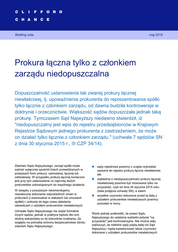 Prokura łączna tylko z członkiem zarządu niedopuszczalna 1 maj 2015 Briefing note Prokura łączna tylko z członkiem zarządu niedopuszczalna Dopuszczalność ustanowienia tak zwanej prokury łącznej niewłaściwej, tj. upoważnienia prokurenta do reprezentowania spółki tylko łącznie z członkiem zarządu, od dawna budziła kontrowersje w doktrynie i orzecznictwie. Większość sądów dopuszczała jednak taką prokurę. Tymczasem Sąd Najwyższy niedawno stwierdził, iż "niedopuszczalny jest wpis do rejestru przedsiębiorców w Krajowym Rejestrze Sądowym jednego prokurenta z zastrzeżeniem, że może on działać tylko łącznie z członkiem zarządu." (uchwała 7 sędziów SN z dnia 30 stycznia 2015 r., III CZP 34/14). Zdaniem Sądu Najwyższego, zarząd spółki może wybrać wyłącznie spośród trzech przewidzianych w przepisach form prokury: samoistnej, łącznej lub oddziałowej. W przypadku prokury łącznej konieczne jest przy tym ustanowienie co najmniej dwóch prokurentów zobowiązanych do wspólnego działania. W związku z powyższym rekomendujemy niezwłoczne dokonanie odpowiednich zmian w prokurach (i ewentualnie w statutach lub umowach spółek) i unikanie do tego czasu składania oświadczeń z udziałem prokurentów niewłaściwych. Uchwała Sądu Najwyższego nie wiąże formalnie innych sądów, jednak w praktyce będzie dla nich istotną wskazówką co do kierunków orzekania. Ze względu na potrzebę ochrony bezpieczeństwa obrotu zdaniem Sądu Najwyższego: sądy rejestrowe powinny z urzędu wykreślać wpisane do rejestru prokury łączne niewłaściwe; ale wykładnia o niedopuszczalności prokury łącznej niewłaściwej powinna być stosowana tylko na przyszłość, czyli od dnia 30 stycznia 2015 roku (data podjęcia uchwały SN); a zatem wszelkie czynności dokonane przed tą datą z udziałem prokurentów niewłaściwych powinny pozostać w mocy. Warto jednak podkreślić, że prawo Sądu Najwyższego do ustalania wykładni jedynie "na przyszłość" jest kontrowersyjne. Nie można więc wykluczyć, że niektóre sądy pójdą dalej niż Sąd Najwyższy i będą kwestionować także czynności dokonane z udziałem prokurentów niewłaściwych 2 Prokura łączna tylko z członkiem zarządu niedopuszczalna przed 30 stycznia 2015 roku. Niemniej praktyczne ryzyko kwestionowania przez drugie strony wcześniejszych czynności dokonywanych z udziałem prokurenta niewłaściwego wydaje się niskie. Aby ograniczyć ryzyko nieważności transakcji dokonanych w przeszłości z udziałem prokurentów niewłaściwych, można próbować te czynności potwierdzić. Potwierdzenie, w szczególności bez odniesienia do konkretnych czynności, nie daje jednak pełnej gwarancji ważności czynności, a potwierdzanie wszystkich transakcji dokonanych w przeszłości może być bardzo uciążliwie. Dlatego w praktyce można zastanowić się nad potwierdzeniem jedynie wybranych umów, których ważność ma kluczowe znaczenie dla danego biznesu, lub tych czynności, których ważność druga strona próbuje na tej podstawie kwestionować. W przypadku sporu można też próbować bronić ważności czynności dokonanych z udziałem prokurentów niewłaściwych (zwłaszcza tych dokonanych po 30 stycznia 2015 roku) za pomocą argumentacji, że sama prokura była ważna, a nieskuteczny był tylko wymóg współdziałania z członkiem zarządu (a zatem prokurent mógł podpisywać sam), choć w świetle orzeczenia Sądu Najwyższego taka argumentacja wydaje się dość ryzykowna. Uchwała Sądu Najwyższego nie oznacza jednak, ze członkowie zarządu nie mogą podpisywać łącznie z prokurentami – jest to nadal możliwe, gdy umowa spółki lub statut przewidują taką możliwość w ramach tzw. reprezentacji mieszanej i to zarówno w przypadku ustanowienia prokury łącznej, jak i samoistnej. W tym pierwszym wypadku umowa spółki lub statut może przewidywać możliwość reprezentacji przez członka zarządu działającego łącznie z jednym lub większą liczbą prokurentów łącznych. Ograniczenie takie odnosi się jednak tylko do członka zarządu, nie zaś do prokurenta. Członek zarządu będzie mógł reprezentować spółkę tylko we współdziałaniu z innym członkiem zarządu lub prokurentem, natomiast prokurent samoistny nadal uprawniony będzie do samodzielnej reprezentacji, a prokurenci łączni do reprezentacji wspólnej (bez udziału członka zarządu). Sąd Najwyższy przypomniał też generalne zasady, jakimi należy się kierować w celu prawidłowego udzielenia i wykonywania prokury, mianowicie: niedopuszczalne jest ustanowienie prokurentem członka rady nadzorczej (zakaz łączenia tych funkcji wynika zresztą wprost z przepisów Kodeksu spółek handlowych); niedopuszczalne jest ustanowienie prokurentem członka zarządu (Sąd wskazał, iż nie ma po temu ani podstawy prawnej, ani racjonalnego uzasadnienia, ponieważ wszystkie czynności, do których dokonywania uprawniony jest prokurent, zawierają się w zakresie uprawnień przysługujących członkowi zarządu); prokurentem spółki osobowej może być jedynie wspólnik, który nie jest uprawniony do jej reprezentacji. Sąd Najwyższy stwierdził też, że do wykonywania prokury łącznej konieczne jest złożenie oświadczenia woli przez każdego z prokurentów łącznych. Nie wydaje się jednak, aby Sąd Najwyższy rzeczywiście chciał wykluczyć możliwość udzielenia takiej prokury łącznej wielu osobom, że każdy prokurent łączny mógłby podpisywać łącznie z dowolną drugą osobą z grona prokurentów łącznych. Dopuszczalność takiej prokury nie była kwestionowana w doktrynie i dotychczasowym orzecznictwie i jest powszechnie przyjętą praktyką. Clifford Chance Prokura łączna tylko z członkiem zarządu niedopuszczalna 3 Kontakt Agnieszka Janicka Partner Tomasz Derda Counsel Krzysztof Hajdamowicz Counsel T: +48 22 627 11 77 E: [email protected] T: +48 22 627 11 77 E: [email