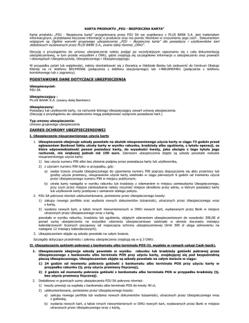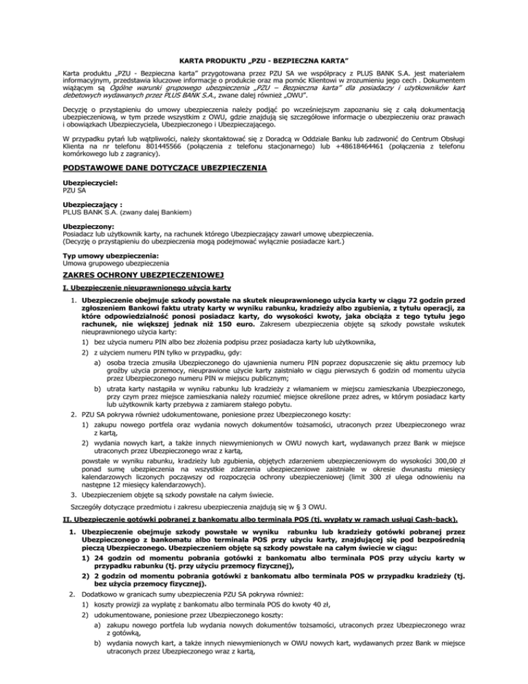 KARTA PRODUKTU „PZU - BEZPIECZNA KARTA” Karta produktu „PZU - Bezpieczna karta” przygotowana przez PZU SA we współpracy z PLUS BANK S.A. jest materiałem informacyjnym, przedstawia kluczowe informacje o produkcie oraz ma pomóc Klientowi w zrozumieniu jego cech . Dokumentem wiążącym są Ogólne warunki grupowego ubezpieczenia „PZU – Bezpieczna karta” dla posiadaczy i użytkowników kart debetowych wydawanych przez PLUS BANK S.A., zwane dalej również „OWU”. Decyzję o przystąpieniu do umowy ubezpieczenia należy podjąć po wcześniejszym zapoznaniu się z całą dokumentacją ubezpieczeniową, w tym przede wszystkim z OWU, gdzie znajdują się szczegółowe informacje o ubezpieczeniu oraz prawach i obowiązkach Ubezpieczyciela, Ubezpieczonego i Ubezpieczającego. W przypadku pytań lub wątpliwości, należy skontaktować się z Doradcą w Oddziale Banku lub zadzwonić do Centrum Obsługi Klienta na nr telefonu 801445566 (połączenia z telefonu stacjonarnego) lub +48618464461 (połączenia z telefonu komórkowego lub z zagranicy). PODSTAWOWE DANE DOTYCZĄCE UBEZPIECZENIA Ubezpieczyciel: PZU SA Ubezpieczający : PLUS BANK S.A. (zwany dalej Bankiem) Ubezpieczony: Posiadacz lub użytkownik karty, na rachunek którego Ubezpieczający zawarł umowę ubezpieczenia. (Decyzję o przystąpieniu do ubezpieczenia mogą podejmować wyłącznie posiadacze kart.) Typ umowy ubezpieczenia: Umowa grupowego ubezpieczenia ZAKRES OCHRONY UBEZPIECZENIOWEJ I. Ubezpieczenie nieuprawnionego użycia karty 1. Ubezpieczenie obejmuje szkody powstałe na skutek nieuprawnionego użycia karty w ciągu 72 godzin przed zgłoszeniem Bankowi faktu utraty karty w wyniku rabunku, kradzieży albo zgubienia, z tytułu operacji, za które odpowiedzialność ponosi posiadacz karty, do wysokości kwoty, jaka obciąża z tego tytułu jego rachunek, nie większej jednak niż 150 euro. Zakresem ubezpieczenia objęte są szkody powstałe wskutek nieuprawnionego użycia karty: 1) bez użycia numeru PIN albo bez złożenia podpisu przez posiadacza karty lub użytkownika, 2) z użyciem numeru PIN tylko w przypadku, gdy: a) osoba trzecia zmusiła Ubezpieczonego do ujawnienia numeru PIN poprzez dopuszczenie się aktu przemocy lub groźby użycia przemocy, nieuprawione użycie karty zaistniało w ciągu pierwszych 6 godzin od momentu użycia przez Ubezpieczonego numeru PIN w miejscu publicznym; b) utrata karty nastąpiła w wyniku rabunku lub kradzieży z włamaniem w miejscu zamieszkania Ubezpieczonego, przy czym przez miejsce zamieszkania należy rozumieć miejsce określone przez adres, w którym posiadacz karty lub użytkownik karty przebywa z zamiarem stałego pobytu. 2. PZU SA pokrywa również udokumentowane, poniesione przez Ubezpieczonego koszty: 1) zakupu nowego portfela oraz wydania nowych dokumentów tożsamości, utraconych przez Ubezpieczonego wraz z kartą, 2) wydania nowych kart, a także innych niewymienionych w OWU nowych kart, wydawanych przez Bank w miejsce utraconych przez Ubezpieczonego wraz z kartą, powstałe w wyniku rabunku, kradzieży lub zgubienia, objętych zdarzeniem ubezpieczeniowym do wysokości 300,00 zł ponad sumę ubezpieczenia na wszystkie zdarzenia ubezpieczeniowe zaistniałe w okresie dwunastu miesięcy kalendarzowych liczonych począwszy od rozpoczęcia ochrony ubezpieczeniowej (limit 300 zł ulega odnowieniu na następne 12 miesięcy kalendarzowych). 3. Ubezpieczeniem objęte są szkody powstałe na całym świecie. Szczegóły dotyczące przedmiotu i zakresu ubezpieczenia znajdują się w § 3 OWU. II. Ubezpieczenie gotówki pobranej z bankomatu albo terminala POS (tj. wypłaty w ramach usługi Cash-back). 1. Ubezpieczenie obejmuje szkody powstałe w wyniku rabunku lub kradzieży gotówki pobranej przez Ubezpieczonego z bankomatu albo terminala POS przy użyciu karty, znajdującej się pod bezpośrednią pieczą Ubezpieczonego. Ubezpieczeniem objęte są szkody powstałe na całym świecie w ciągu: 1) 24 godzin od momentu pobrania gotówki z bankomatu albo terminala POS przy użyciu karty w przypadku rabunku (tj. przy użyciu przemocy fizycznej), 2) 2 godzin od momentu pobrania gotówki z bankomatu albo terminala POS w przypadku kradzieży (tj. bez użycia przemocy fizycznej). 2. Dodatkowo w granicach sumy ubezpieczenia PZU SA pokrywa również: 1) koszty prowizji za wypłatę z bankomatu albo terminala POS do kwoty 40 zł, 2) udokumentowane, poniesione przez Ubezpieczonego koszty: a) zakupu nowego portfela lub wydania nowych dokumentów tożsamości, utraconych przez Ubezpieczonego wraz z gotówką, b) wydania nowych kart, a także innych niewymienionych w OWU nowych kart, wydawanych przez Bank w miejsce utraconych przez Ubezpieczonego wraz z kartą, które Ubezpieczony poniósł w związku z rabunkiem objętym zdarzeniem ubezpieczeniowym do wysokości 300,00 zł ponad sumę ubezpieczenia na wszystkie zdarzenia ubezpieczeniowe zaistniałe w okresie 12 miesięcy kalendarzowych, liczonych począwszy od rozpoczęcia ochrony ubezpieczeniowej (limit 300 zł ulega odnowieniu na następne 12 miesięcy kalendarzowych). Szczegóły dotyczące przedmiotu i zakresu ubezpieczenia znajdują się w § 6 OWU. ŚWIADCZENIA/ODSZKODOWANIA PZU SA Odszkodowanie w przypadku ubezpieczenia nieuprawnionego użycia karty oraz w przypadku ubezpieczenia gotówki pobranej z bankomatu albo terminala POS 1. W przypadku operacji dokonanych na terenie Polski wysokość szkody jest ustalana według wartości nominalnej środków pieniężnych. W przypadku operacji dokonanych zagranicą wysokość szkody jest ustalana według wartości w walucie polskiej, jaką został obciążony przez Bank rachunek posiadacza karty z tytułu dokonania tych operacji. 2. Koszty zakupu nowego portfela, wydania nowych dokumentów i kart oraz pobranych prowizji za wypłatę ustala się na podstawie dokumentów potwierdzających poniesienie tych kosztów przez Ubezpieczonego, , przy czym kwoty wyrażone w walutach obcych s