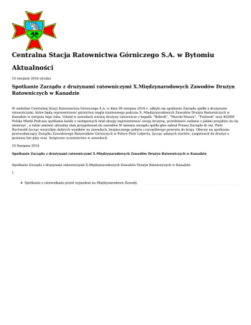 Centralna Stacja Ratownictwa Górniczego S.A. w Bytomiu Aktualności 10 sierpień 2016 (środa) Spotkanie Zarządu z drużynami ratowniczymi X.Międzynarodowych Zawodów Drużyn Ratowniczych w Kanadzie W siedzibie Centralnej Stacji Ratownictwa Górniczego S.A. w dniu 09 sierpnia 2016 r. odbyło się spotkanie Zarządu spółki z drużynami ratowniczymi, które będą reprezentować górnictwo węgla kamiennego podczas X. Międzynarodowych Zawodów Drużyn Ratowniczych w Kanadzie w sierpniu tego roku. Udział w zawodach wezmą drużyny ratownicze z kopalń: "Bobrek", "Murcki-Staszic", "Pniówek" oraz KGHM Polska Miedź.Podczas spotkania każdy z zastępowych miał okazję zaprezentować swoją drużynę, przedstawić zadania z jakimi przyjdzie im się zmierzyć , a także omówić aktualny stan przygotowań do zawodów.W imieniu zarządu spólki głos zabrał Prezes Zarządu dr inż. Piotr Buchwald życząc wszystkim dobrych wyników na zawodach, bezpiecznego pobytu i szczęśliwego powrotu do kraju. Obecny na spotkaniu przewodniczący Związku Zawodowego Ratowników Górniczych w Polsce Piotr Luberta, życząc udanych startów, zaapelował do drużyn o postawę fair-play oraz bezpiczne uczestnictwo w zawodach. 10 Sierpnia 2016 Spotkanie Zarządu z drużynami ratowniczymi X.Międzynarodowych Zawodów Drużyn Ratowniczych w Kanadzie Spotkanie Zarządu z drużynami ratowniczymi X.Międzynarodowych Zawodów Drużyn Ratowniczych w Kanadzie 1 Spotkanie z ratownikami przed wyjazdem na Międzynarodowe Zawody