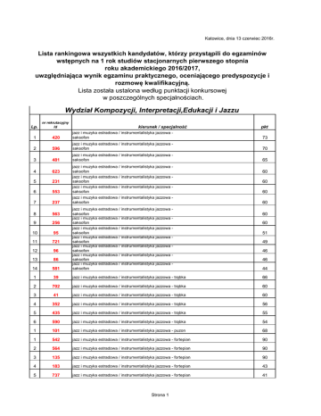 Katowice, dnia 13 czerwiec 2016r. Lista rankingowa wszystkich kandydatów, którzy przystąpili do egzaminów wstępnych na 1 rok studiów stacjonarnych pierwszego stopnia roku akademickiego 2016/2017, uwzględniająca wynik egzaminu praktycznego, oceniającego predyspozycje i rozmowę kwalifikacyjną. Lista została ustalona według punktacji konkursowej w poszczególnych specjalnościach. Wydział Kompozycji, Interpretacji,Edukacji i Jazzu Lp. nr rekrutacyjny Id kierunek / specjalność pkt 420 jazz i muzyka estradowa / instrumentalistyka jazzowa saksofon 73 2 596 jazz i muzyka estradowa / instrumentalistyka jazzowa saksofon 70 3 481 jazz i muzyka estradowa / instrumentalistyka jazzowa saksofon 65 4 623 5 231 6 553 jazz i muzyka estradowa / instrumentalistyka jazzowa saksofon jazz i muzyka estradowa / instrumentalistyka jazzowa saksofon jazz i muzyka estradowa / instrumentalistyka jazzowa saksofon 237 jazz i muzyka estradowa / instrumentalistyka jazzowa saksofon 1 7 60 60 60 60 8 563 9 256 10 95 11 721 12 96 13 86 14 581 jazz i muzyka estradowa / instrumentalistyka jazzowa saksofon jazz i muzyka estradowa / instrumentalistyka jazzowa saksofon jazz i muzyka estradowa / instrumentalistyka jazzowa saksofon jazz i muzyka estradowa / instrumentalistyka jazzowa saksofon jazz i muzyka estradowa / instrumentalistyka jazzowa saksofon jazz i muzyka estradowa / instrumentalistyka jazzowa saksofon jazz i muzyka estradowa / instrumentalistyka jazzowa saksofon 1 39 jazz i muzyka estradowa / instrumentalistyka jazzowa - trąbka 66 2 702 jazz i muzyka estradowa / instrumentalistyka jazzowa - trąbka 60 3 41 jazz i muzyka estradowa / instrumentalistyka jazzowa - trąbka 60 4 352 jazz i muzyka estradowa / instrumentalistyka jazzowa - trąbka 56 5 435 jazz i muzyka estradowa / instrumentalistyka jazzowa - trąbka 55 6 590 jazz i muzyka estradowa / instrumentalistyka jazzowa - trąbka 54 1 101 jazz i muzyka estradowa / instrumentalistyka jazzowa - puzon 68 1 542 jazz i muzyka estradowa / instrumentalistyka jazzowa - fortepian 90 2 564 jazz i muzyka estradowa / instrumentalistyka jazzowa - fortepian 90 3 135 jazz i muzyka estradowa / instrumentalistyka jazzowa - fortepian 90 4 183 jazz i muzyka estradowa / instrumentalistyka jazzowa - fortepian 43 5 737 jazz i muzyka estradowa / instrumentalistyka jazzowa - fortepian 41 Strona 1 60 60 51 49 46 46 44 6 243 jazz i muzyka estradowa / instrumentalistyka jazzowa - fortepian 40 7 528 jazz i muzyka estradowa / instrumentalistyka jazzowa - fortepian 35 8 361 jazz i muzyka estradowa / instrumentalistyka jazzowa - fortepian 31 1 243 jazz i muzyka estradowa / instrumentalistyka jazzowa - eletroniczne instrumenty klawiszowe 40 1 757 jazz i muzyka estradowa / instrumentalistyka jazzowa - akordeon 40 1 738 jazz i muzyka estradowa / instrumentalistyka jazzowa - kontrabas 71 2 582 jazz i muzyka estradowa / instrumentalistyka jazzowa - kontrabas 55 3 476 jazz i muzyka estradowa / instrumentalistyka jazzowa - kontrabas 30 1 240 jazz i muzyka estradowa / instrumentalistyka jazzowa - gitara basowa 60 2 332 jazz i muzyka estradowa / instrumentalistyka jazzowa - gitara basowa 60 1 158 jazz i muzyka estradowa / instrumentalistyka jazzowa - gitara 81 2 241 jazz i muzyka estradowa / instrumentalistyka jazzowa - gitara 60 3 205 jazz i muzyka estradowa / instrumentalistyka jazzowa - gitara 60 4 297 jazz i muzyka estradowa / instrumentalistyka jazzowa - gitara 60 5 102 jazz i muzyka estradowa / instrumentalistyka jazzowa - gitara 60 6 169 jazz i muzyka estradowa / instrumentalistyka jazzowa - gitara 60 7 110 jazz i muzyka estradowa / instrumentalistyka jazzowa - gitara 60 8 556 jazz i muzyka estradowa / instrumentalistyka jazzowa - gitara 55 9 636 jazz i muzyka estradowa / instrumentalistyka jazzowa - gitara 48 10 14 jazz i muzyka estradowa / instrumentalistyka jazzowa - gitara 45 1 671 jazz i muzyka estradowa / instrumentalistyka jazzowa - wibrafon 70 2 682 jazz i muzyka estradowa / instrumentalistyka jazzowa - wibrafon 59 1 344 jazz i muzyka estradowa / instrumentalistyka jazzowa - skrzypce 70 2 74 jazz i muzyka estradowa / instrumentalistyka jazzowa - skrzypce 60 3 495 jazz i muzyka estradowa / instrumentalistyka jazzowa - skrzypce 60 4 366 jazz i muzyka estradowa / instrumentalistyka jazzowa - skrzypce 58 5 718 jazz i muzyka estradowa / instrumentalistyka jazzowa - skrzypce 58 6 75 jazz i muzyka estradowa / instrumentalistyka jazzowa - skrzypce 55 1 594 jazz i muzyka estradowa / instrumentalistyka jazzowa - instrumenty perkusyjne 65 2 97 jazz i muzyka estradowa / instrumentalistyka jazzowa - instrumenty perkusyjne 60 1 89 jazz i muzyka estradowa / instrumentalistyka jazzowa - perkusja 70 2 407 jazz i muzyka estradowa / instrumentalistyka jazzowa - perkusja 70 3 498 jazz i muzyka estradowa / instrumentalistyka jazzowa - perkusja 60 4 624 jazz i muzyka estradowa / instrumentalistyka jazzowa - perkusja 60 5 509 jazz i muzyka estradowa / instrumentalistyka jazzowa - perkusja 60 6 394 jazz i muzyka estradowa / instrumentalistyka jazzowa - perkusja 60 7 350 jazz i muzyka estradowa / instrumentalistyka jazzowa - perkusja 60 8 276 jazz i muzyka estradowa / instrumentalistyka jazzowa - perkusja 60 Strona 2 9 403 jazz i muzyka estradowa / instrumentalistyka jazzowa - perkusja 60 10 159 jazz i muzyka estradowa / instrumentalistyka jazzowa - perkusja 58 11 253 jazz i muzyka estradowa / instrumentalistyka jazzowa - perkusja 32 12 279 jazz i muzyka estradowa / instrumentalistyka jazzowa - perkusja 15 13 296 jazz i muzyka estradowa / instrumentalistyka jazzowa - perkusja 15 Listy osób przyjętych na studia ogłoszone zostaną dnia 18 lipca 2016 r. Strona 3