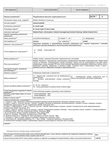 Opis modułu kształcenia / przedmiotu (sylabus) Grupa przedmiotów: Rok akademicki: Numer katalogowy: Nazwa przedmiotu1): Współczesne kierunki użytkowania koni Tłumaczenie nazwy na jęz. angielski3): Modern directions in horse use 4) Kierunek studiów : ECTS 2) 2 Zootechnika/HZ 5) Koordynator przedmiotu : Dr Jacek Łojek Prowadzący zajęcia6): Dr Jacek Łojek, Dr Anna Łojek 7) Wydział Nauk o Zwierzętach, Katedra Szczegółowej Hodowli Zwierząt, Zakład Hodowli Koni Jednostka realizująca : Wydział, dla którego przedmiot jest realizowany8): Status przedmiotu9): a) przedmiot fakultatywny b) stopień II rok I c) stacjonarne Cykl dydaktyczny10): zimowy Jęz. wykładowy11): polski Zapoznanie studentów: z różnorodnością kierunków użytkowania koni, regułami rozgrywania i specyfiką sportowych dyscyplin jeździeckich i innych kierunków wykorzystania koni. 12) Założenia i cele przedmiotu : a) Formy dydaktyczne, liczba godzin13): wykład; liczba godzin 30; b) Metody dydaktyczne14): Wykład, Analiza wybranych kierunków użytkowania koni, konsultacje Pełny opis przedmiotu15): Wykład: Społeczne i ekonomiczne uwarunkowania współczesnych kierunków użytkowania koni. Wpływ jazdy konnej na człowieka. Charakterystyka, zasady rywalizacji i doboru koni do poszczególnych dyscyplin sportu jeździeckiego z grupy dyscyplin FEI oraz innych dyscyplin jeździeckich (jeździectwo westernowe, pokazy konne, jeździectwo naturalne, jeździectwo w damskim siodle). Turystyka konna. Wykorzystanie kuców w grach i zabawach konnych. Regionalne zwyczaje w wykorzystaniu koni. Wymagania formalne (przedmioty wprowadzające)16): Założenia wstępne17): Podstawowe wiadomości o hodowli koni Efekty kształcenia : 01 – objaśnia rolę i znaczenie koni we współczesnym 03 – charakteryzuje zasady użytkowania koni w społeczeństwie różnych dyscyplinach i kierunkach użytkowania 02 – tłumaczy uwarunkowania rozwoju przemysłu konnego Sposób weryfikacji efektów kształcenia19): 01, 02, 03 – kolokwium 03 – ocena prezentacji na ustalony temat w trakcie zajęć 18) Forma dokumentacji osiągniętych efektów Ocena złożonego projektu i prezentacji, ocena kolokwium kształcenia 20): Elementy i wagi mające wpływ na ocenę – ocena prezentacji – 30% końcową21): – ocena kolokwium – 70% Miejsce realizacji zajęć22): Sala dydaktyczna 23) Literatura podstawowa i uzupełniająca : 1. Grange A. i wsp.: Podręcznik instruktora-przewodnika górskiej turystyki jeździeckiej. Warszawa, Mediane-Consult, 1997 2. Łojek J., Łojek A.: Praca zb. pod red. I. Ozimek: Turystyka i rekreacja na obszarach niezurbanizowanych, rozdział 2.4 Konie w rekreacji, turystyce jeździeckiej i agroturystyce :94-127; Wydawnictwo SGGW, Warszawa, 2011 3. Łojek J., Chabinowska N., Łojek A.: Praca zb. pod red. I. Ozimek. Nowe trendy w turystyce. rozdział: Turystyka konna osób niepełnosprawnych. Wydawnictwo SGGW, Warszawa, 2011 4. Łojek J., Kario W., Łojek A.: Praca zb. pod red. I. Ozimek: Współczesna turystyka i rekreacja – nowe wyzwania i trendy, rozdział 2, Turystyka jeździecka w Beskidzie Niskim :105-138; Wydawnictwo SGGW, Warszawa, 2012 red. M. Krzemień: Górska Turystyka Jeździecka. Wyd. Ostoja, 2002 5. Mróz W.: Poradnik - Rekreacja i turystyka konna. FAPA 1999 6. Nowicka-Posłuszna A., Zalewski M.: Sport zaprzęgowy w Polsce. Poznań. 1995 7. Polańska H.: Dama w siodle. Muzeum Łowiectwa i Jeździectwa. Warszawa. 2003 8. Pruchniewicz W.: Akademia jeździecka. Cz. 1. Wyd. Chaber – Akademia Jeździecka. Warszawa 2003 9. Wydawnictwa Polskiego Związku Jeździeckiego (regulaminy poszczególnych dyscyplin sportu konnego) UWAGI24): Wskaźniki ilościowe charakteryzujące moduł/przedmiot 25) : Szacunkowa sumaryczna liczba godzin pracy studenta (kontaktowych i pracy własnej) niezbędna dla osiągnięcia zakładanych efektów kształcenia18) - na tej podstawie należy wypełnić pole ECTS2: 55 h Łączna liczba punktów ECTS, którą student uzyskuje na zajęciach wymagających bezpośredniego udziału nauczycieli akademickich: 1 ECTS Łączna liczba punktów ECTS, którą student uzyskuje w ramach zajęć o charakterze praktycznym, takich jak zajęcia laboratoryjne, projektowe, itp.: Tabela zgodności kierunkowych efektów kształcenia efektami przedmiotu 0,5 ECTS 26) Nr /symbol efektu 01_W Wymienione w wierszu efekty kształcenia: objaśnia rolę i znaczenie koni we współczesnym społeczeństwie Odniesienie do efektów dla programu kształcenia na kierunku K_W05 02_W tłumaczy uwarunkowania rozwoju przemysłu konnego K_W05 03_W charakteryzuje zasady użytkowania koni w różnych dyscyplinach i kierunkach użytkowania K_W05
