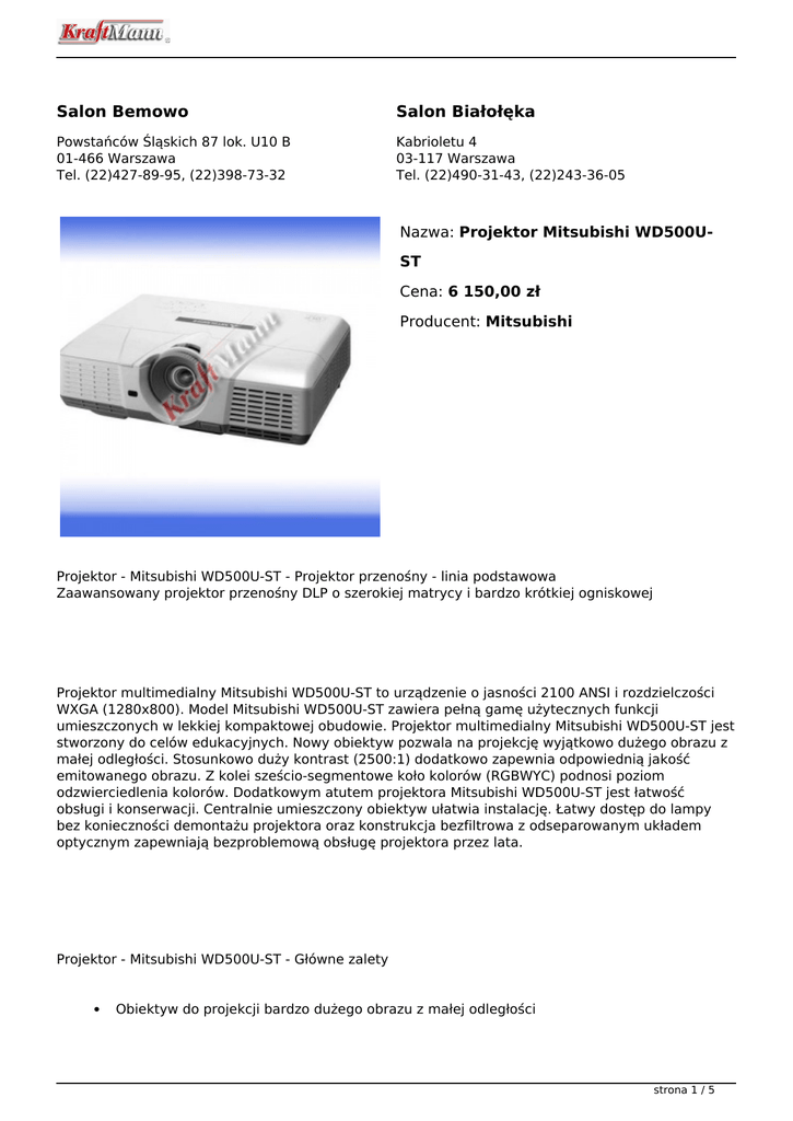 Salon Bemowo Salon Białołęka Powstańców Śląskich 87 lok. U10 B 01-466 Warszawa Tel. (22)427-89-95, (22)398-73-32 Kabrioletu 4 03-117 Warszawa Tel. (22)490-31-43, (22)243-36-05 Nazwa: Projektor Mitsubishi WD500UST Cena: 6 150,00 zł Producent: Mitsubishi Projektor - Mitsubishi WD500U-ST - Projektor przenośny - linia podstawowa Zaawansowany projektor przenośny DLP o szerokiej matrycy i bardzo krótkiej ogniskowej Projektor multimedialny Mitsubishi WD500U-ST to urządzenie o jasności 2100 ANSI i rozdzielczości WXGA (1280x800). Model Mitsubishi WD500U-ST zawiera pełną gamę użytecznych funkcji umieszczonych w lekkiej kompaktowej obudowie. Projektor multimedialny Mitsubishi WD500U-ST jest stworzony do celów edukacyjnych. Nowy obiektyw pozwala na projekcję wyjątkowo dużego obrazu z małej odległości. Stosunkowo duży kontrast (2500:1) dodatkowo zapewnia odpowiednią jakość emitowanego obrazu. Z kolei sześcio-segmentowe koło kolorów (RGBWYC) podnosi poziom odzwierciedlenia kolorów. Dodatkowym atutem projektora Mitsubishi WD500U-ST jest łatwość obsługi i konserwacji. Centralnie umieszczony obiektyw ułatwia instalację. Łatwy dostęp do lampy bez konieczności demontażu projektora oraz konstrukcja bezfiltrowa z odseparowanym układem optycznym zapewniają bezproblemową obsługę projektora przez lata. Projektor - Mitsubishi WD500U-ST - Główne zalety Obiektyw do projekcji bardzo dużego obrazu z małej odległości strona 1 / 5 Sześciosegmentowe koło kolorów (RGBWYC) - wierniejsze odzwierciedlenie barw Wejście USB z funkcją Page Up/Down x 1 Konstrukcja bezfiltrowa z odseparowanym układem optycznym zapewniają bezproblemową obsługę projektora przez lata. Umieszczenie lampy w górnej części obudowy Centralnie umieszczony obiektyw Funkcja Instant Shut down umożliwiająca wyciągnięcie kabla zasilającego zaraz po skończeniu prezentacji, bez ryzyka uszkodzenia lampy O PRODUKCIE: - 100% NOWY - GWARANCJA Producenta 36 Miesięcy - Paragon Fiskalny Lub Faktura VAT - Najniższa Cena Na Rynku ! ! ! strona 2 / 5 - Salon Firmowy Na Terenie M.St. Warszawy - Większość towarów dostępna w naszych magazynach - Fachowe Porady I Szeroki Asortyment - Możliwość Profesjonalnej Instalacji Z Zakresu AV Niesamowity Projektor Multimedialny Mitsubishi model WD500U-ST LCD / WXGA (1280x800) / 2500 ANSI / 2100:1 Gwarancja Producenta Na Projektor 3 Lata Specyfikacje techniczne: Rozdzielczość: WXGA (1280x800) Jasność: 2100 ANSI lumenów Kontrast: 2500:1 Technologia: LCD Właściwości wyświetlania Optyka: F=2,89 / f=7,7 mm Odległość od ekranu: 0,5 - 3,6 m Wielkość obrazu (przekątna): 1,02 - 7,62 m Zoom/Focus: ręczny focus Korekcja efektu Keystone PIONOWA Rozdzielczość maksymalna: (kompresja) SXGA (1280×1024) Gniazda Wejścia / Wyjścia Wejścia komputerowe: mini D-sub15pin x 2, DVI: DVI-D (with HDCP) Wejścia video: RCA x 1 + S-video x 1 Gniazda audio stereo mini jack: (3.5mm) x 1, RCA jack (L/R) x 1 Inne gniazda WYJŚCIA: RGB: mini Dsub15pin x 1, Audio: stereo mini jack ( 3.5mm) x 1 ; INNE: RS-232C (D-sub 9pin) x 1,USB x 1 Właściwości użytkowe Poziom szumu wentylatora: -/29 dB w ECO Moc lampy: 230 W Pobór prądu: 330 W Wbudowany głośnik: 1x2 W Funkcje specjalne: Obiektyw typu: Short Throw umieszczony centralnie, sześcio-segmentowe koło barwne, Wall Screen, programowalne logo startowe. UWAGA : Oferta ważna do wyczerpania zapasów Wyposażenie Przewody Przewód zasilający, kabel VGA , przewód Composite Inne Miękka torba, pilot+baterie, instrukcja obsługi ( CD-ROM), instrukcja szybki start, osłona na obiektyw Opcjonalne Zapasowa lampa, uchwyt sufitowy Pozostałe informacje Waga: 3,4 kg Wymiary: 33,2 x 10,2 x 25,0 cm Żywotność lampy: 2000/4000 h w ECO Zalety: * Projektor jest fabrycznie nowy, nigdy nie otwierany! * POLSKA GWARANCJA! * Wystawiamy faktury VAT 23% lub paragony. * Produkt dostępny najczęściej "od ręki" w naszym nowo-otwartym salonie na Bemowie bądź na Białołęce. Dodatkowo RABAT na dowolny ekran 10%! > > KLIKNIJ < < strona 3 / 5 WYSTAWIAMY POLSKIE RACHUNKI ZAKUPU (FAKTURA VAT, PARAGON) WRAZ Z POLSKĄ KARTĄ GWARANCYJNĄ. CENA ZAWIERA 22% PODATEK VAT. RACHUNEK JEST NIEZBĘDNY DO ZREALIZOWANIA GWARANCJI. TOWAR Z POLSKIEJ DYSTRYBUCJI. Zapraszamy do odwiedzenia naszej siedziby na ul. Kabrioletu 4 (przy ul. Modlińskiej => patrz mapka) oraz sklepu firmowego przy ul. Powst. Śląskich 87 lok. U 10 B (przy skrzyżowaniu ulic Powstańców Śląskich i Górczewskiej => patrz mapka) gdzie istnieje możliwość odbioru osobistego zakupionego towaru. W razie pytań: - zadzwoń: tel. 022-427-89-95 (pn.-pt. 9.00-17.00) kom. 0-501-726-922; 0-512-207-819 (pn.-nd. 8.00-20.00) - napisz: [email protected] [email protected] [email protected] strona 4 / 5 strona 5 / 5 Powered by TCPDF (www.tcpdf.org)