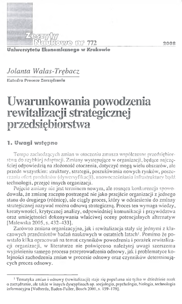 2008 Uniwersytetu Ekonomicznego w Krakowie Jolanta Walas-Trębacz Ka t e d ra P rocesu Z a r z ą d z a n ia Uwarunkowania powodzenia rewitalizacji strategicznej przedsiębiorstwa 1. U w a g i w stę p n e Tempo zachodzących zmian w otoczeniu zmusza współczesne przedsiębior stwa do szybkiej adaptacji. Zmiany występujące w organizacji, będące najczę ściej odpowiedzią na złożoność otoczenia, dotyczyć mogą wielu obszarów, ale przede wszystkim: struktury, strategii, poszukiwania nowych rynków, posze rzania ofert produktów (dywersyfikacji), unowocześniania infrastruktury bądź technologii, przejęć innych organizacji. Pojęcie zmiany nie jest terminem nowym, ale rosnąca konkurencja spowo dowała, że zmianę zaczęto postrzegać niejako przejście organizacji z jednego stanu do drugiego (różnicę), ale ciągły proces, który w odniesieniu do zmiany strategicznej nazywać można odnową strategiczną. Proces ten wymaga wiedzy, kreatywności, krytycznej analizy, odpowiedniej komunikacji i przywództwa oraz umiejętności dokonywania właściwej oceny potencjalnych alternatyw [Malewska 2005, s. 432-433]. Zarówno zmiana organizacyjna, jak i rewitalizacja stały się jednymi z klu czowych przedmiotów badań naukowych w ostatnich latach1. Pomimo że po wstało kilka opracowań na temat czynników powodzenia i porażek rewitaliza cji organizacji, w literaturze nie poświęcono należytej uwagi szerszemu wyjaśnieniu samego procesu przeprowadzenia odnowy, jak i problematyce ko lejności zachodzenia zmian w procesie odnowy oraz czynników determinują cych proces odnowy. 1 Tematyka zmian i odnowy (rewitalizacji) staje się popularna nie tylko w dziedzinie nauk o zarządzaniu, ale także w innych dyscyplinach np. socjologia, psychologia, biologia, technologia informacyjna [Volberda, Baden-Fuller, Bosch 2001, s. 159-178], Jolanta W alas-T rębacz Artykuł ma pozwolić zrozumieć na czym polega rewitalizacja strategiczna przedsiębiorstwa, jakie są powody podejmowania takiego procesu w organizacji, ponadto wskazać czynniki wpływające na przebieg rewitalizacji strategicznej oraz metodykę przeprowadzania rewitalizacji strategicznej w przedsiębiorstwie. 2 . Pojęcie i te o rie w y ja ś n ia ją c e o d n o w ę s t r a te g ic z n ą Termin innovatis - odnowa w języku polskim oznacza innowacje. Odnowa strategiczna (organizacyjna) jest rozumiana zamiennie jako kreatywna „rekon strukcja strategii” rewitalizacja strategiczna przedsiębiorstwa, regeneracja, czy reorientacja albo restrukturyzacja strategiczna i wymaga innowacji w obszarze modelu biznesowego firmy. W opracowaniu terminy odnowa i rewitalizacja bę dą stosowane zamiennie. Rewitalizacja strategiczna w literaturze przedmiotu jest definiowana bardzo różnorodnie (tabela 1). Proces rewitalizacji utożsamiany jest ze strategiczną zmianą [Floyd, Lane 2000, s. 155], dlatego też nakładając na siebie dwa kryteria: ciągłości zmian (bądź nieciągłości) i charakteru zmian w organizacji w stosunku do zmian w otoczeniu, można pojęcie odnowy rozszerzyć na dwie sytuacje, tzn. strate giczny zwrot i strategiczną rewitalizację (rys. 1). Oznacza to, że proces odno wy jest realizowany w dwóch przypadkach: wykształcenia luki strategicznej oraz antycypowania wykształcenia się luki strategicznej pomiędzy kompeten cjami organizacji a wymaganiami otoczenia. Doskonalenie organizacji Strategiczny zwrot Dopasowanie organizacji Strategiczna rewitalizacja Zmiany ciągle Zmiany skokowe o o R y s. 1. K ierunki zm ian strategiczn ych w organizacjach Źródło: [Cyfert 2005, s. 171]. Biorąc pod uwagę głębokość wprowadzanych zmian w przedsiębiorstwie, wyróżnić można zmiany powierzchowne oraz głębokie, przekształcające cały U w arunkow ania pow odzen ia r e w ita liz a c ji ■ T ab ela 1. Interpretacja p ojęcia rew ita liza cja w ed łu g różn ych autorów Autor 1 Pojęcie rewitalizacji 2 H. Hart, A. Berger Zmiana o fundamentalnym charakterze i poważnym wpływie na efektywność organizacji, dotycząca relacji z otoczeniem (klienci, dostawcy), procesów transformacyjnych (konfiguracja technologii), struktur, systemów i rutyny (podejmowanie decyzji, informacje, zasoby ludzkie), jak również wyników finansowych oraz jednostko wych i organizacyjnych zachowań. W.D.Guth, A. Ginseberg Transformacja organizacji aodbywająca się poprzez odnowę jej kluczowych idei (kompetencji). H.W. Volberda, C. Baden-Fuller, F.AJ. Bosch Czynności podejmowane przez organizację w celu zmiany jej „ścieżki” zależności, co przyczynia się do modyfikacji wewnętrznych i zewnętrznych wymiarów organizacji oraz wymaga odpowiedniego dostosowania dotychczasowej strategii, czyli jest to zmiana modelu biznesub prowadząca do przeprojektowania dotychczasowej ścieżki rozwoju przedsiębiorstwa. Leksykon zarządzania Rewitalizacja to proces „ożywiania” starzejących się dziedzin działal ności przedsiębiorstwa w celu utrzymania pozycji konkurencyjnej przedsiębiorstwa. Rewitalizację realizuje się poprzez inwestycje podtrzymujące potencjał wytwórczy i podnoszące jakość wyrobów, zwiększenie aktywności marketingowej przedsiębiorstwa, utrzymy wanie, a nawet podnoszenie konkurencyjności cenowej poprzez obniżkę kosztów. B. Wawrzyniak Tworzenie nowego lub robienie czegoś od nowa (tzw. kuracja dla organizacji). Oznacza przyjęcie odmiennej od opartej na przeszłości orientacji w planowaniu i wdrażaniu zmian. Cechą lej orientacji jest zawarcie przymierza z przyszłością. B. Nogalski, H. Macinkiewicz Jest to zmiana w ukierunkowaniu przedsiębiorstwa, która wymaga nowego spojrzenia na zarządzanie zasobami ludzkimi oraz organizację przedsiębiorstwa (renewing). S.W. Floyd, P.J. Lane, K. Malewska Proces polegający na wyznaczaniu nowych kierunków funkcjonowa nia organizacji oraz na dostosowaniu przedsiębiorstwa do zmiennego otoczenia. G. Hamel, L. Yalikangas Zdolność strategicznej regeneracji nie