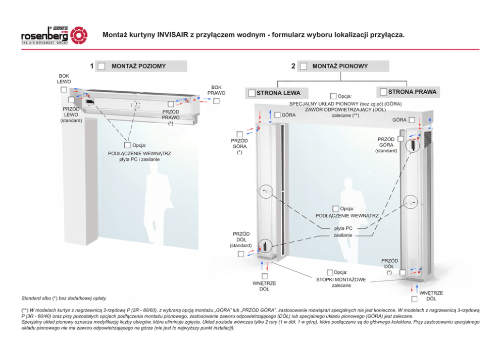 Montaż kurtyny INVISAIR z przyłączem wodnym - formularz wyboru lokalizacji przyłącza. 1 2 MONTAŻ POZIOMY BOK LEWO BOK PRAWO PRZÓD LEWO (standard) STRONA LEWA PODŁĄCZENIE WEWNĄTRZ płyta PC i zasilanie STRONA PRAWA Opcja: SPECJALNY UKŁAD PIONOWY (bez zgięć) (GÓRA) ZAWÓR ODPOWIETRZAJĄCY (DÓŁ) GÓRA zalecane (**) GÓRA PRZÓD PRAWO (*) Opcja: MONTAŻ PIONOWY PRZÓD GÓRA (standard) PRZÓD GÓRA (*) Opcja: PODŁĄCZENIE WEWNĄTRZ płyta PC zasilanie PRZÓD DÓŁ (standard) Opcja: WNĘTRZE DÓŁ Standard albo (*) bez dodatkowej opłaty. PRZÓD DÓŁ (*) STOPKI MONTAŻOWE zalecane WNĘTRZE DÓŁ (**) W modelach kurtyn z nagrzewnicą 2-rzędową P (2R - 80/60), z wybraną opcją montażu „GÓRA” lub „PRZÓD GÓRA”, zastosowanie rozwiązań specjalnych nie jest konieczne. W modelach z nagrzewnicą 3-rzędową P (3R - 60/40) oraz przy pozostałych opcjach podłączenia montażu pionowego, zastosowanie zaworu odpowietrzającego (DÓŁ) lub specjalnego układu pionowego (GÓRA) jest zalecane. Specjalny układ pionowy oznacza modyfikację liczby obiegów, która eliminuje zgięcia. Układ posiada wówczas tylko 2 rury (1 w dół, 1 w górę), które podłączane są do głównego kolektora. Przy zastosowaniu specjalnego układu pionowego nie ma zaworu odpowietrzającego na górze (nie jest to najwyższy punkt instalacji).