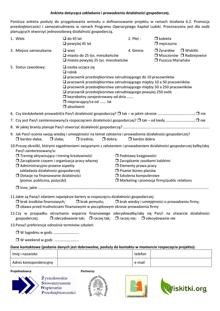 Ankieta dotycząca zakładania i prowadzenia działalności gospodarczej. Poniższa ankieta posłuży do przygotowania wniosku o dofinansowanie projektu w ramach działania 6.2. Promocja przedsiębiorczości i samozatrudnienia w ramach Programu Operacyjnego Kapitał Ludzki. Przeznaczona jest dla osób planujących otworzyć jednoosobową działalność gospodarczą. 1. Wiek: do 45 lat powyżej 45 lat 3. Miejsce zamieszkania: wieś 4. Gmina: miasto do 25 tys. mieszkańców miasto powyżej 25 tys. mieszkańców 5. Status zawodowy: osoba ucząca się rolnik pracownik przedsiębiorstwa zatrudniającego do 10 pracowników pracownik przedsiębiorstwa zatrudniającego między 10 a 50 pracowników pracownik przedsiębiorstwa zatrudniającego między 50 a 250 pracowników pracownik przedsiębiorstwa zatrudniającego powyżej 250 osób bezrobotny zarejestrowany od dnia ……. niepracujący/ca od ……. lat absolwent 2. Płeć : kobieta mężczyzna Żyrardów Wiskitki Mszczonów Radziejowice Puszcza Mariańska 6. Czy kiedykolwiek prowadził/a Pan/i działalność gospodarczą? tak – w jakim okresie …………………………………; nie 7. Czy jest Pan/i zainteresowany/a rozpoczęciem działalności gospodarczej? tak – od kiedy …………………………; nie 8. W jakiej branży planuje Pan/i otworzyć działalność gospodarczą? ……………………………………………………………………………….. 9. Jak Pan/i ocenia swoją wiedzę i umiejętności na temat założenia i prowadzenia działalności gospodarczej? bardzo słaba; słaba; średnia; dobra; bardzo dobra 10.Proszę określić, którymi zagadnieniami związanymi z założeniem i prowadzeniem działalności gospodarczej byłby/aby Pan/i zainteresowany/a: Trening aktywizujący i trening kreatywności Podstawy księgowości Zarządzanie czasem i organizacja pracy własnej Zarządzanie zasobami ludzkimi Administracyjno-prawne aspekty Elementy prawa pracy zakładania działalności gospodarczej Pisanie biznes planów Dotacje na finansowanie działalności Szkolenia komputerowe (pomoc publiczna, pożyczki) Marketing i promocja firmy/public relations Inne, jakie ……………………………………………………………………………………………………………………………………….………………………. 11.Jakie są Pana/i zdaniem największe bariery w rozpoczęciu działalności gospodarczej: brak środków finansowych; brak pomysłu; brak wiedzy i umiejętności o prowadzeniu firmy; obawa przed trudnościami finansowymi w początkowym okresie prowadzenia firmy 12.Czy w przypadku otrzymania wsparcia finansowego zdecydowałby/aby się Pan/i na otwarcie działalności gospodarczej: zdecydowanie tak; raczej tak; raczej nie; zdecydowanie nie 13.Pana/i preferencje odnośnie terminów szkoleń: W tygodniu w godz. ……………………… W weekend w godz. …………………….. Dane kontaktowe (podanie danych jest dobrowolne, posłuży do kontaktu w momencie rozpoczęcia projektu): Imię i nazwisko telefon Adres korespondencyjny e-mail Projektodawca: Partnerzy:
