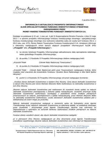 2 grudnia 2016 r. INFORMACJA O AKTUALIZACJI PROSPEKTU INFORMACYJNEGO ALIOR SPECJALISTYCZNEGO FUNDUSZU INWESTYCYJNEGO OTWARTEGO ZARZĄDZANEGO PRZEZ MONEY MAKERS TOWARZYSTWO FUNDUSZY INWESTYCYJNYCH S.A. Działając na podstawie § 22 ust. 1 oraz ust. 4 pkt 5) Rozporządzenia Ministra Finansów z dnia 22 maja 2013 r. w sprawie prospektu informacyjnego funduszu inwestycyjnego otwartego i specjalistycznego funduszu inwestycyjnego otwartego oraz wyliczania wskaźnika zysku do ryzyka tych funduszy (Dz.U. z 2013 roku, poz. 673), Money Makers Towarzystwo Funduszy Inwestycyjnych S.A. niniejszym informuje o dokonaniu następujących zmian danych objętych prospektem informacyjnym ALIOR SFIO („Prospekt” albo „Prospekt Informacyjny”): 1) na stronie tytułowej Prospektu Informacyjnego zaktualizowano datę sporządzenia ostatniego tekstu jednolitego Prospektu Informacyjnego; 2) do punktu 7.2 Rozdziału II Prospektu Informacyjnego dodano następującą treść: „Krzysztof Polak Członek Rady Nadzorczej Towarzystwa”; 3) do punktu 8.2 Rozdziału II Prospektu Informacyjnego dodano następującą treść: „Krzysztof Polak - Członek Rady Nadzorczej pełni poza Towarzystwem następującą funkcję, która mogłaby mieć znaczenie dla Uczestników Funduszu: Dyrektor Biura Maklerskiego w Alior Bank Spółce Akcyjnej”; 4) punkt 6.1.6 Rozdziału III Prospektu Informacyjnego otrzymał następujące brzmienie: „Fundusz zbywa Jednostki Uczestnictwa w każdym Dniu Wyceny. Cena zbycia Jednostki Uczestnictwa w danym Dniu Wyceny jest równa Wartości Aktywów Netto Subfunduszu na Jednostkę Uczestnictwa w tym Dniu Wyceny. Zlecenie nabycia Jednostek Uczestnictwa jest realizowane do wysokości kwoty wpłaty na nabycie Jednostek Uczestnictwa pomniejszonej o pobrane opłaty manipulacyjne. Uczestnik otrzymuje liczbę Jednostek Uczestnictwa Subfunduszu wynikającą z podzielenia kwoty środków pieniężnych przeznaczonych na nabycie, pomniejszonych o opłatę manipulacyjną, przez Wartość Aktywów Netto na Jednostkę Uczestnictwa Subfunduszu. Liczba zbywanych Jednostek Uczestnictwa ustalana jest z dokładnością do trzech miejsc po przecinku. Nabycie Jednostek Uczestnictwa następuje w momencie wpisu do Subrejestru przez Agenta Transferowego liczby nabytych Jednostek Uczestnictwa za dokonaną wpłatę, na podstawie złożonego przez Uczestnika i otrzymanego przez Agenta Transferowego zlecenia oraz informacji od Depozytariusza o wpłynięciu na rachunek bankowy Subfunduszu środków pieniężnych na nabycie Jednostek Uczestnictwa. Fundusz dołoży wszelkich starań, aby zbycie Jednostek Uczestnictwa nastąpiło: a) w pierwszym Dniu Wyceny następującym po dniu otrzymania przez Agenta Transferowego prawidłowo wypełnionego zlecenia nabycia Jednostek Uczestnictwa oraz informacji od Depozytariusza Money Makers Towarzystwo Funduszy Inwestycyjnych S.A., ul. Domaniewska 39A, 02-672 Warszawa T: +48 22 463 8888, F: +48 22 463 8889, E: [email protected], W: www.moneymakers.pl Zarejestrowana w Sądzie Rejonowym dla m.st. Warszawy XIII Wydział Gospodarczy Krajowego Rejestru Sądowego KRS: 0000350402, REGON: 142296921, NIP: 108-000-87-99 Kapitał zakładowy: 1 259 334,40zł w pełni opłacony o wpłynięciu na rachunek bankowy Subfunduszu środków pieniężnych na nabycie Jednostek Uczestnictwa; albo b) w pierwszym Dniu Wyceny następującym po dniu wyjaśnienia nieprawidłowości w wypełnieniu zlecenia otwarcia Subrejestru lub zlecenia nabycia lub dokumentu wpłaty. Termin, w jakim Fundusz zbywa Jednostki Uczestnictwa po dokonaniu przez Uczestnika wpłaty na ich nie może być dłuższy niż 7 dni, chyba że opóźnienie jest następstwem zdarzeń, za które Fundusz nie ponosi odpowiedzialności”; 5) punkt 6.2.4 Rozdziału III Prospektu Informacyjnego otrzymał następujące brzmienie: „Odkupienie Jednostek Uczestnictwa przez Fundusz następuje w każdym Dniu Wyceny. Cena odkupienia jest równa Wartości Aktywów Netto Subfunduszu na Jednostkę Uczestnictwa, ustalonej w Dniu Wyceny, w którym następuje odkupienie Jednostek Uczestnictwa. Odkupienie Jednostek Uczestnictwa Subfunduszu następuje w momencie wpisu do Rejestru przez Agenta Transferowego liczby odkupionych Jednostek Uczestnictwa i kwoty należnej Uczestnikowi z tytułu odkupienia tych Jednostek Uczestnictwa Subfunduszu pomniejszonej o ewentualny podatek oraz opłatę manipulacyjną. Z chwilą odkupienia Jednostki Uczestnictwa są umarzane z mocy prawa. Fundusz dołoży wszelkich starań, aby odkupienie Jednostek Uczestnictwa nastąpiło: a) w pierwszym Dniu Wyceny następującym po dniu otrzymania prawidłowo wypełnionego zlecenia odkupienia Jednostek Uczestnictwa przez Agenta Transferowego; albo b) w pierwszym Dniu Wyceny następującym po dniu wyjaśnienia nieprawidłowości w wypełnieniu zlecenia odkupienia Jednostek Uczestnictwa. Termin, w jakim Fundusz odkupuje Jednostki Uczestnictwa po zgłoszeniu żądania ich odkupienia nie może być dłuższy niż 7 dni, chyba że opóźnienie jest następstwem zdarzeń, za które Fundusz nie ponosi odpowiedzialności. Na podstawie złożonego zlecenia odkupienia, Fundusz odkupuje w pierwszej kolejności Jednostki Uczestnictwa Subfunduszu zapisane na danym Subrejestrze Uczestnika nabyte przez Uczestnika po najwyższej cenie (metoda HIFO). Uczestnik nie ma możliwości wskazania kolejności odkupywania Jednostek Uczestnictwa przez Fundusz. Kwotę do wypłaty z tytułu odkupienia Jednostek Uczestnictwa ustala się jako iloczyn ceny odkupienia Jednostki Uczestnictwa i liczby odkupowanych Jednostek Uczestnictwa pomniejszony o ewentualny podatek, jeżeli przepisy prawa będą nakładały na Fundusz obowiązek pobrania podatku, oraz opłatę manipulacyjną”; 6) z punktu 6.5 Rozdziału III Prospektu Informacyjnego wykreślono akapit w brzmieniu: „Począwszy od dnia 4 maja 2016 r. nie jest możliwe dokonywanie zamiany Jednostek Uczestnictwa danego Subfunduszu na Jednostki Uczestnictwa innego Subfunduszu.