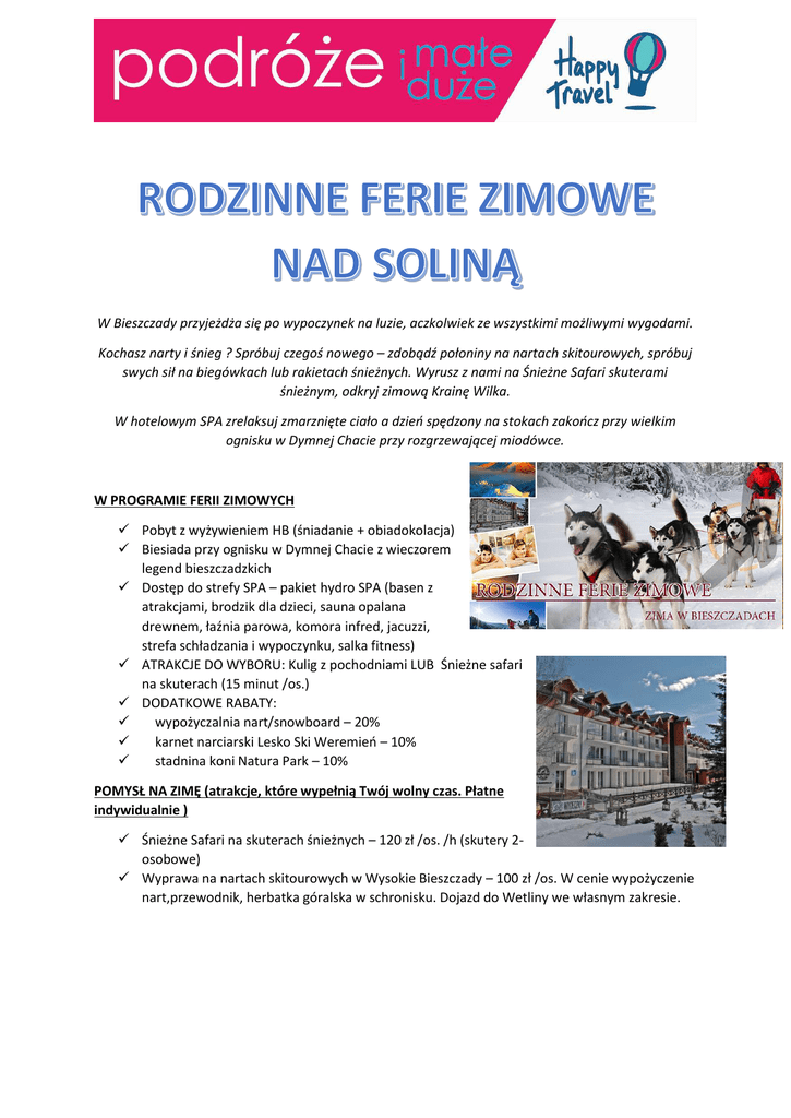 W Bieszczady przyjeżdża się po wypoczynek na luzie, aczkolwiek ze wszystkimi możliwymi wygodami. Kochasz narty i śnieg ? Spróbuj czegoś nowego – zdobądź połoniny na nartach skitourowych, spróbuj swych sił na biegówkach lub rakietach śnieżnych. Wyrusz z nami na Śnieżne Safari skuterami śnieżnym, odkryj zimową Krainę Wilka. W hotelowym SPA zrelaksuj zmarznięte ciało a dzień spędzony na stokach zakończ przy wielkim ognisku w Dymnej Chacie przy rozgrzewającej miodówce. W PROGRAMIE FERII ZIMOWYCH Pobyt z wyżywieniem HB (śniadanie + obiadokolacja) Biesiada przy ognisku w Dymnej Chacie z wieczorem legend bieszczadzkich Dostęp do strefy SPA – pakiet hydro SPA (basen z atrakcjami, brodzik dla dzieci, sauna opalana drewnem, łaźnia parowa, komora infred, jacuzzi, strefa schładzania i wypoczynku, salka fitness) ATRAKCJE DO WYBORU: Kulig z pochodniami LUB Śnieżne safari na skuterach (15 minut /os.) DODATKOWE RABATY: wypożyczalnia nart/snowboard – 20% karnet narciarski Lesko Ski Weremień – 10% stadnina koni Natura Park – 10% POMYSŁ NA ZIMĘ (atrakcje, które wypełnią Twój wolny czas. Płatne indywidualnie ) Śnieżne Safari na skuterach śnieżnych – 120 zł /os. /h (skutery 2osobowe) Wyprawa na nartach skitourowych w Wysokie Bieszczady – 100 zł /os. W cenie wypożyczenie nart,przewodnik, herbatka góralska w schronisku. Dojazd do Wetliny we własnym zakresie. Szlakiem Łemka na rakietach śnieżnych – wyprawa do opuszczonej wioski (50 zł /os) W cenie wypożyczenie rakiet śnieżnych oraz przewodnik) INNE ATRAKCJE W OKOLICY: Narty lub snowboard (możliwość wynajęcia instruktora i sprzętu narciarskiego) Polecamy stoki Weremień Lesko-Ski www.lesko-ski.pl ( 15 minut jazdy) oraz Laworta i Gromadzyń www.ustrzykinarty.pl (30 minut jazdy) Aqua Park Aquarius w Lesku (cena wg cennika www.basen.lesko.pl) Trasa dla narciarzy biegowych – Ustjanowa (możliwość wypożyczenia nart w hotelu) Stadniny koni w Berezce oraz w Stężnicy (Natura Park) Wycieczka do Lwowa (zwiedzanie miasta z przewodnikiem)– dorośli 120 zł, dzieci 100 zł Wycieczka na Węgry (winnice Tokaju z przewodnikiem i degustacją win, baseny termalne)–dorośli 120 zł, dzieci 100 zł PŁATNOŚĆ: 5 dni (4 noclegi) Dorośli: 650 zł, Dzieci 5-14 lat: 450 zł Dopłata za apartament: 100 zł / doba Dzieci do lat 4 śpiące z rodzicami – pobyt bezpłatny ( nocleg, śniadanie ) Dzieci do lat 4 śpiące na dodatkowym łóżku – 50 pln / doba ( nocleg, śniadanie ) 7 dni (6 noclegów) Dorośli: 1050 zł, Dzieci 5-14 lat: 645 zł Dopłata za apartament: 100 zł / doba Dzieci do lat 4 śpiące z rodzicami – pobyt bezpłatny ( nocleg, śniadanie ) Dzieci do lat 4 śpiące na dodatkowym łóżku – 50 pln / doba ( nocleg, śniadanie )