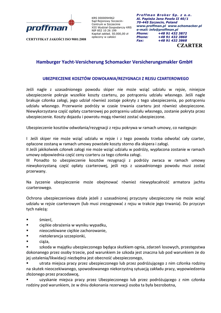 CERTYFIKAT JAKOŚCI ISO 9001:2008 KRS 0000094962 Sąd Rejonowy SzczecinCentrum w Szczecinie XIII Wydział Gospodarczy KRS NIP 852 10 26 199 Kapitał zakład. 50.000,00 zł opłacony w całości Proffman Broker Sp. z o.o. Al. Papieża Jana Pawła II 40/1 70-445 Szczecin, Poland www.proffman.pl www.schomacker.pl e-mail: [email protected] Phone: +48 91 432 3872 Phone: +48 91 432 3860 Fax: +48 91 432 3868 CZARTER Hamburger Yacht-Versicherung Schomacker Versicherungsmakler GmbH UBEZPIECZENIE KOSZTÓW ODWOŁANIA/REZYGNACJI Z REJSU CZARTEROWEGO Jeśli nagle z uzasadnionego powodu skiper nie może wziąd udziału w rejsie, niniejsze ubezpieczenie pokryje wszelkie koszty czarteru, po potrąceniu udziału własnego. Jeśli nagle brakuje członka załogi, jego udział również zostaje pokryty z tego ubezpieczenia, po potrąceniu udziału własnego. Przerwanie podróży w czasie trwania czarteru jest również ubezpieczone. Niewykorzystana częśd opłaty czarterowej po potrąceniu udziału własnego, zostanie pokryta przez ubezpieczenie. Koszty dojazdu i powrotu mogą również zostad ubezpieczone. Ubezpieczenie kosztów odwołania/rezygnacji z rejsu pokrywa w ramach umowy, co następuje: I Jeśli skiper nie może wziąd udziału w rejsie i z tego powodu trzeba odwoład cały czarter, opłacone zostaną w ramach umowy powstałe koszty storno dla skipera i załogi. II Jeśli jakikolwiek członek załogi nie może wziąd udziału w podróży, wypłacona zostanie w ramach umowy odpowiednia częśd ceny czarteru za tego członka załogi. III Ponadto to ubezpieczenie kosztów rezygnacji z podróży zwraca w ramach umowy niewykorzystaną częśd opłaty czarterowej, jeśli rejs z uzasadnionego powodu musi zostad przerwany. Na życzenie ubezpieczenie może obejmowad również niewypłacalnośd armatora jachtu czarterowego. Ochrona ubezpieczeniowa działa jeżeli z uzasadnionej przyczyny ubezpieczony nie może wziąd udziału w rejsie czarterowym (lub musi zrezygnowad z rejsu w trakcie jego trwania). Do przyczyn tych należą: śmierd, ciężkie obrażenia w wyniku wypadku, nieoczekiwane ciężkie zachorowanie, nietolerancja szczepionki, ciąża, szkoda w majątku ubezpieczonego będąca skutkiem ognia, zdarzeo losowych, przestępstwa dokonanego przez osoby trzecie, pod warunkiem że szkoda jest znaczna lub pod warunkiem że do jej ustalenia/likwidacji niezbędna jest obecnośd ubezpieczonego, utrata miejsca pracy przez ubezpieczonego lub przez podróżującego z nim członka rodziny na skutek nieoczekiwanego, spowodowanego niekorzystną sytuacją zakładu pracy, wypowiedzenia złożonego przez pracodawcę, uzyskanie miejsca pracy przez Ubezpieczonego lub przez podróżującego z nim członka rodziny pod warunkiem, że w dniu dokonania rezerwacji osoba ta była bezrobotna, CERTYFIKAT JAKOŚCI ISO 9001:2008 KRS 0000094962 Sąd Rejonowy SzczecinCentrum w Szczecinie XIII Wydział Gospodarczy KRS NIP 852 10 26 199 Kapitał zakład. 50.000,00 zł opłacony w całości Proffman Broker Sp. z o.o. Al. Papieża Jana Pawła II 40/1 70-445 Szczecin, Poland www.proffman.pl www.schomacker.pl e-mail: [email protected] Phone: +48 91 432 3872 Phone: +48 91 432 3860 Fax: +48 91 432 3868 CZARTER w przypadku, gdy podróż/rejs zarezerwowana była dla dwóch osób, ubezpieczyciel wypłaci ubezpieczonemu odszkodowanie także wówczas, gdy powyższe zdarzenia będą dotyczyły drugiej osoby, zakładając że ta osoba również posiada takie ubezpieczenie. Ubezpieczenie należy zawrzed w przeciągu 14 dni od dokonania rezerwacji czarteru. Jeśli okres pomiędzy rezerwacją a początkiem czarteru jest krótszy niż 30 dni, ubezpieczenie winno byd zawarte natychmiast po dokonaniu rezerwacji. Niedotrzymanie powyższych warunków zawsze skutkuje odmową wypłaty świadczenia przez Ubezpieczyciela. UBEZPIECZENIE OD NIEWYPŁACALNOŚCI FIRMY CZARTEROWEJ Wiele firm czarterowych zawiera umowy czarteru, jednakże nie przedstawia Klientom zabezpieczenia z tego tytułu. Firmy czarterowe nie są bowiem objęte obowiązkiem ubezpieczenia w taki sposób jak jest to wymagane np.: w odniesieniu do biur podróży czy organizatorów turystyki. Tę lukę można wypełnid wykorzystując ubezpieczenie od niewypłacalności firmy czarterowej (armatora). Ubezpieczenie to jest produktem dodatkowym, który można dokupid do ubezpieczenia kosztów rezygnacji z rejsu. Ubezpieczenie należy zawrzed w przeciągu 14 dni od dokonania rezerwacji czarteru. Jeśli okres pomiędzy rezerwacją a początkiem czarteru jest krótszy niż 30 dni, ubezpieczenie winno byd zawarte natychmiast po dokonaniu rezerwacji. Niedotrzymanie powyższych warunków zawsze skutkuje odmową wypłaty świadczenia przez Ubezpieczyciela. Cena rejsu czarterowego Rezygnacja z rejsu (w Euro) Przerwanie rejsu do 1000,41,- Euro Powyżej 1000,- do 1500,59,- Euro Powyżej 1500,- do 2000,78,- Euro Powyżej 2000,- do 3000,115,- Euro Powyżej 3000,- do 4000,151,- Euro Powyżej 4000,- do 5000,186,- Euro Powyżej 5000,- do 6000,219,- Euro Powyżej 6000,- do 8000,286,- Euro Powyżej 8000,- do 10000,351,- Euro Rezygnacja/przerwanie rejsu z rozszerzeniem ochrony o ubezp. niewypłacalności armatora 55,- Euro 83,- Euro 102,- Euro 147,- Euro 190,- Euro 230,- Euro 268,- Euro 355,- Euro 440,- Euro Uwaga: suma ubezpieczenia zawsze powinna odpowiadad pełnej wartości rejsu/wycieczki wynikającej z umowy. Jeśli np. suma ubezpieczenia wynosi EUR 1000,- ale wycieczka kosztowała EUR 1050,- ubezpieczenie nie działa. Powyższe składki obowiązują dla maksymalnie 8 osób. O ile w rejsie bierze udział więcej osób może zostad naliczona dodatkowa składka.