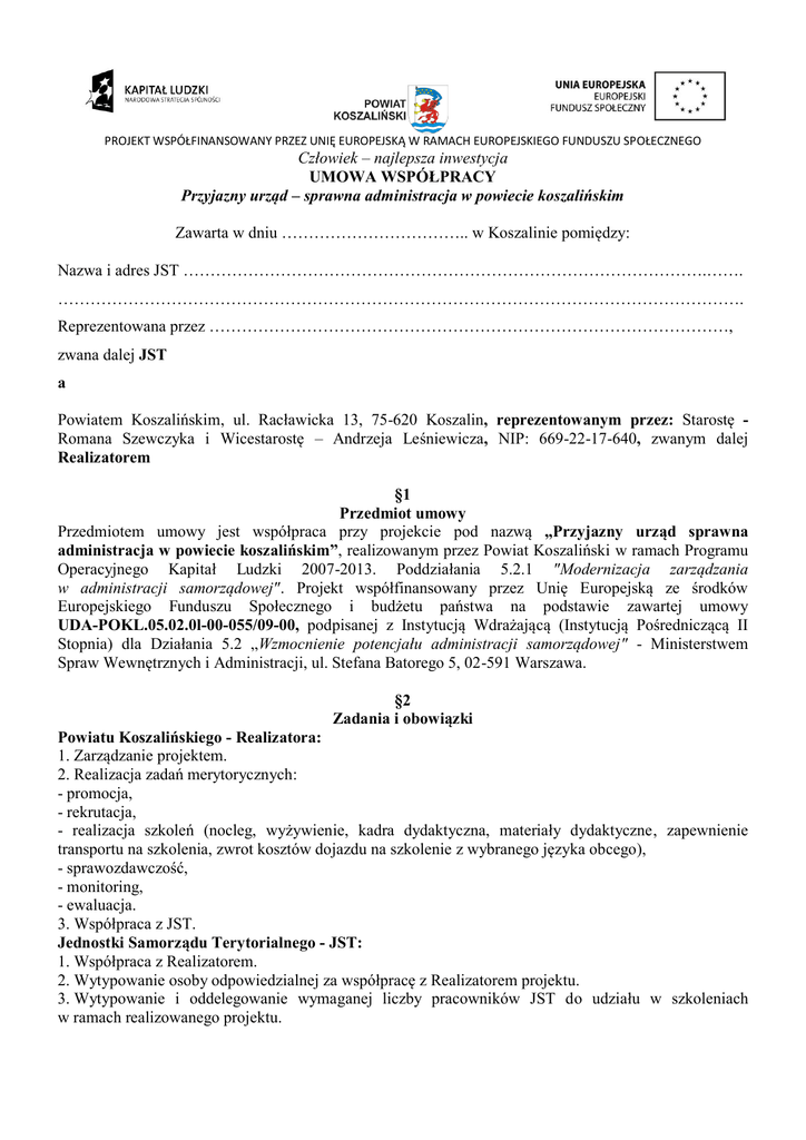 PROJEKT WSPÓŁFINANSOWANY PRZEZ UNIĘ EUROPEJSKĄ W RAMACH EUROPEJSKIEGO FUNDUSZU SPOŁECZNEGO Człowiek – najlepsza inwestycja UMOWA WSPÓŁPRACY Przyjazny urząd – sprawna administracja w powiecie koszalińskim Zawarta w dniu …………………………….. w Koszalinie pomiędzy: Nazwa i adres JST …………………………………………………………………………………….……. ………………………………………………………………………………………………………………. Reprezentowana przez ……………………………………………………………………………………, zwana dalej JST a Powiatem Koszalińskim, ul. Racławicka 13, 75-620 Koszalin, reprezentowanym przez: Starostę Romana Szewczyka i Wicestarostę – Andrzeja Leśniewicza, NIP: 669-22-17-640, zwanym dalej Realizatorem §1 Przedmiot umowy Przedmiotem umowy jest współpraca przy projekcie pod nazwą „Przyjazny urząd sprawna administracja w powiecie koszalińskim”, realizowanym przez Powiat Koszaliński w ramach Programu Operacyjnego Kapitał Ludzki 2007-2013. Poddziałania 5.2.1 "Modernizacja zarządzania w administracji samorządowej". Projekt współfinansowany przez Unię Europejską ze środków Europejskiego Funduszu Społecznego i budżetu państwa na podstawie zawartej umowy UDA-POKL.05.02.0l-00-055/09-00, podpisanej z Instytucją Wdrażającą (Instytucją Pośredniczącą II Stopnia) dla Działania 5.2 „Wzmocnienie potencjału administracji samorządowej" - Ministerstwem Spraw Wewnętrznych i Administracji, ul. Stefana Batorego 5, 02-591 Warszawa. §2 Zadania i obowiązki Powiatu Koszalińskiego - Realizatora: 1. Zarządzanie projektem. 2. Realizacja zadań merytorycznych: - promocja, - rekrutacja, - realizacja szkoleń (nocleg, wyżywienie, kadra dydaktyczna, materiały dydaktyczne, zapewnienie transportu na szkolenia, zwrot kosztów dojazdu na szkolenie z wybranego języka obcego), - sprawozdawczość, - monitoring, - ewaluacja. 3. Współpraca z JST. Jednostki Samorządu Terytorialnego - JST: 1. Współpraca z Realizatorem. 2. Wytypowanie osoby odpowiedzialnej za współpracę z Realizatorem projektu. 3. Wytypowanie i oddelegowanie wymaganej liczby pracowników JST do udziału w szkoleniach w ramach realizowanego projektu. PROJEKT WSPÓŁFINANSOWANY PRZEZ UNIĘ EUROPEJSKĄ W RAMACH EUROPEJSKIEGO FUNDUSZU SPOŁECZNEGO Człowiek – najlepsza inwestycja 4. Przesyłanie aktualnych formularzy zgłoszeniowych z wykazem pracowników przypisanych do szkoleń i terminów realizacji (wzór formularza w załączeniu oraz do pobrania ze strony Internetowej projektu). 5. Poświadczanie na formularzu zgłoszeniowym faktu spełnienia przez pracowników JST kryteriów rekrutacyjnych. 6. Współpraca w tworzeniu ostatecznych list uczestników szkoleń oraz list rezerwowych. 8. Zgłaszanie o fakcie rezygnacji wytypowanej osoby z udziału w szkoleniu. 9. Zabezpieczenie 5% wkładu własnego do projektu w formie niepieniężnej (tj.: udostępnienie dokumentów poświadczających wypłacenie pracownikowi wynagrodzenia za czas uczestniczenia w szkoleniu). Przesyłanie do Realizatora dokumentów poświadczających 5% wkładu własnego JST: 9.1. Zestawienie wynagrodzeń. (wzór do pobrania ze strony internetowej projektu www.powiat.koszalin.pl) 9.2. Kserokopia listy wynagrodzenia z poświadczeniem zapłaty. 9.3. Opłacona składka do ZUS z poświadczeniem zapłaty. 9.4. Opłacona składka do US z poświadczeniem zapłaty. Poświadczenia muszą zostać przekazane w terminie 5 dni roboczych po opłaceniu ostatniej składowej wynagrodzenia za miesiąc w którym brał udział w szkoleniu pracownik JST. §3 Uczestnicy Projektu Grupę docelową projektu stanowią urzędy gmin (Manowo, Biesiekierz, Będzino, Bobolice, Mielno, Sianów, Polanów, Świeszyno) i Starostwo Powiatowe w Koszalinie oraz ich pracownicy - 98 osób (w tym min. 60% kobiet). Są to pracownicy wydziałów lub komórek działających w obszarach kluczowych z punktu widzenia rozwoju gospodarczego i wyzwań stawianych samorządom, tj.: zarządzanie projektami, zarządzanie nieruchomościami, ochrona środowiska, e-administracja, zarządzanie rozwojem gmin i powiatu, kontakt z klientem zagranicznym w różnych dziedzinach, z uwagi na ich zasadnicze i strategiczne znaczenie oraz bezpośredni wpływ na podniesienie jakości usług publicznych, oraz poprawę jakości polityk i programów JST. §4 Kryteria uczestnictwa w projekcie Kryteria wyboru pracowników/uczestników: 1. Kryterium dostępu: pracownik należy do grupy docelowej określonej w projekcie 2. Kryterium wykonywanych obowiązków: pracownik wykonuje lub będzie wykonywał czynności w obszarze: zarządzanie projektami, zarządzanie nieruchomościami. opracowanie i wdrażanie dokumentacji strategicznych, ochrony środowiska, e-administracji, kontakt z klientem zagranicznym w różnych dziedzinach. 3. Kryterium równościowe (na podstawie analizy liczby pracowników urzędów) liczba kobiet stanowi co najmniej 60% łącznej liczby uczestników. 4. Kryterium równego udziału przedstawicieli poszczególnych JST w projekcie: wnioskodawca zadba aby w projekcie wzięła udział możliwie równa liczba przedstawicieli gmin i starostwa. W przypadku mniejszej liczby osób z danej JST (jednoosobowe stanowisko), dopuszcza się większy udział osób z innej JST (wieloosobowe stanowiska czy zespół w wybranej komórce). Rekrutacja uczestników projektu odbywać się będzie zgodnie z zasadą równości szans. PROJEKT WSPÓŁFINANSOWANY PRZEZ UNIĘ EUROPEJSKĄ W RAMACH EUROPEJSKIEGO FUNDUSZU SPOŁECZNEGO Człowiek – najlepsza inwestycja §5 Organizacja szkoleń l. Realizator Projektu zabezpiecza uczestnikom szkoleń: noclegi, wyżywienie, materiał dydaktyczny oraz dowóz uczestników na miejsce szkoleń. Zwrot kosztów dojazdu na szkolenia językowe, tylko za korzystanie z komunikacji publicznej, na podstawie biletów. Dojazd na szko