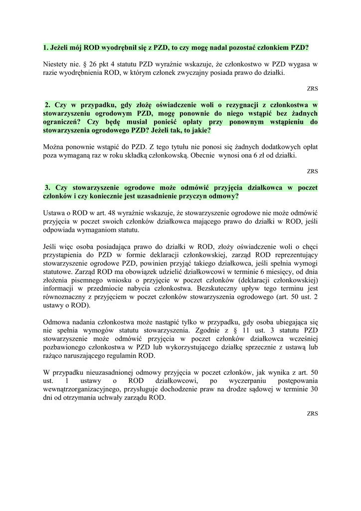 1. Jeżeli mój ROD wyodrębnił się z PZD, to czy mogę nadal pozostać członkiem PZD? Niestety nie. § 26 pkt 4 statutu PZD wyraźnie wskazuje, że członkostwo w PZD wygasa w razie wyodrębnienia ROD, w którym członek zwyczajny posiada prawo do działki. ZRS 2. Czy w przypadku, gdy złożę oświadczenie woli o rezygnacji z członkostwa w stowarzyszeniu ogrodowym PZD, mogę ponownie do niego wstąpić bez żadnych ograniczeń? Czy będę musiał ponieść opłaty przy ponownym wstąpieniu do stowarzyszenia ogrodowego PZD? Jeżeli tak, to jakie? Można ponownie wstąpić do PZD. Z tego tytułu nie ponosi się żadnych dodatkowych opłat poza wymaganą raz w roku składką członkowską. Obecnie wynosi ona 6 zł od działki. ZRS 3. Czy stowarzyszenie ogrodowe może odmówić przyjęcia działkowca w poczet członków i czy koniecznie jest uzasadnienie przyczyn odmowy? Ustawa o ROD w art. 48 wyraźnie wskazuje, że stowarzyszenie ogrodowe nie może odmówić przyjęcia w poczet swoich członków działkowca mającego prawo do działki w ROD, jeśli odpowiada wymaganiom statutu. Jeśli więc osoba posiadająca prawo do działki w ROD, złoży oświadczenie woli o chęci przystąpienia do PZD w formie deklaracji członkowskiej, zarząd ROD reprezentujący stowarzyszenie ogrodowe PZD, powinien przyjąć takiego działkowca, jeśli spełnia wymogi statutowe. Zarząd ROD ma obowiązek udzielić działkowcowi w terminie 6 miesięcy, od dnia złożenia pisemnego wniosku o przyjęcie w poczet członków (deklaracji członkowskiej) informacji w przedmiocie nabycia członkostwa. Bezskuteczny upływ tego terminu jest równoznaczny z przyjęciem w poczet członków stowarzyszenia ogrodowego (art. 50 ust. 2 ustawy o ROD). Odmowa nadania członkostwa może nastąpić tylko w przypadku, gdy osoba ubiegająca się nie spełnia wymogów statutu stowarzyszenia. Zgodnie z § 11 ust. 3 statutu PZD stowarzyszenie może odmówić przyjęcia w poczet członków działkowca wcześniej pozbawionego członkostwa w PZD lub wykorzystującego działkę sprzecznie z ustawą lub rażąco naruszającego regulamin ROD. W przypadku nieuzasadnionej odmowy przyjęcia w poczet członków, jak wynika z art. 50 ust. 1 ustawy o ROD działkowcowi, po wyczerpaniu postępowania wewnątrzorganizacyjnego, przysługuje dochodzenie praw na drodze sądowej w terminie 30 dni od otrzymania uchwały zarządu ROD. ZRS 4. Czy na terenie jednego ogrodu może funkcjonować kilka stowarzyszeń ogrodowych, które będą nim zarządzały? Zgodnie z art. 11 ustawy o ROD rodzinny ogród działkowy może być prowadzony przez jedno stowarzyszenie ogrodowe. Tak więc zarządzać ogrodem może tylko i wyłącznie jedno stowarzyszenie ogrodowe. WZ 5. Czy będąc członkiem PZD mogę być jednocześnie członkiem innego związku, np. wędkarskiego czy pszczelarskiego? Tak, można być jednocześnie członkiem PZD i członkiem innego związku, np. wędkarskiego czy pszczelarskiego. Konstytucja RP zapewnia wolność zrzeszania się. W związku z tym członkowie PZD mają prawo być również członkami innych stowarzyszeń. WZ 6. Czy osoba, która nie ma prawa do działki w ROD może zostać wybrana do zarządu ROD? Zgodnie z § 34 ust. 1 statutu PZD członkiem organu PZD może być jedynie członek PZD. Osoba, która nie posiada prawa do działki w ROD nie może być członkiem stowarzyszenia, a co za tym idzie, nie ma prawa uczestniczenia w walnym zebraniu sprawozdawczowyborczym i nie posiada ani biernego, ani czynnego prawa wyborczego. zarząd ROD przed walnym zebranie ma obowiązek przygotowania imiennej listy obecności członków PZD w ROD, którzy mają prawo uczestniczenia w walnym zebraniu. ZRS 7. Nie mogę być obecny na walnym zebraniu. Czy może na nie pójść za mnie członek mojej rodziny? Niestety nie. W walnym zebraniu można brać udział tylko osobiście. Niedopuszczalne jest zatem ustanowienie do tej czynności pełnomocnika, nawet, jeżeli jest to osoba bliska. Zgodnie ze statutem PZD prawa członkowskie wykonuje się osobiście. WZ 8. Czy w razie wygaśnięcia prawa do działki mogę być nadal członkiem PZD i uczestniczyć w walnych zebraniach? Członkiem PZD może być osoba fizyczna mająca prawo do działki w ROD. Zgodnie z § 26 statutu PZD członkostwo w PZD wygasa w razie wygaśnięcia prawa do działki. Użytkownik, którego prawo do działki wygasło przestaje być członkiem PZD, nie może więc uczestniczyć w walnych zebraniach i nie ma żadnego prawa wyborczego. WZ