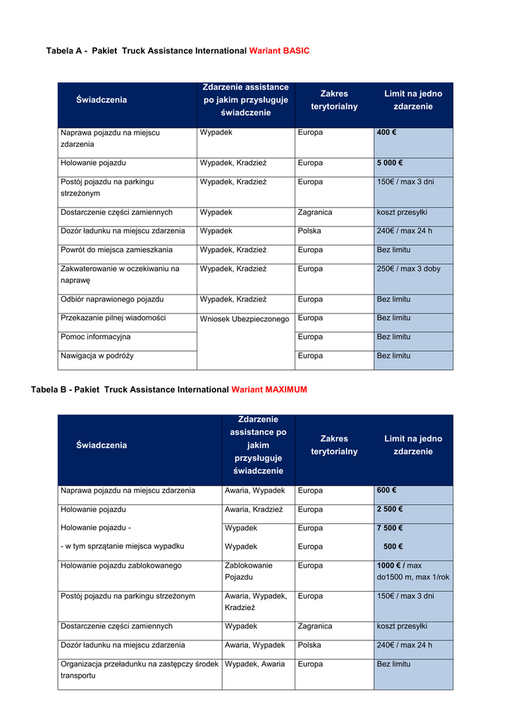 Tabela A - Pakiet Truck Assistance International Wariant BASIC Świadczenia Zdarzenie assistance po jakim przysługuje świadczenie Zakres Limit na jedno terytorialny zdarzenie Naprawa pojazdu na miejscu zdarzenia Wypadek Europa 400 € Holowanie pojazdu Wypadek, Kradzież Europa 5 000 € Postój pojazdu na parkingu strzeżonym Wypadek, Kradzież Europa 150€ / max 3 dni Dostarczenie części zamiennych Wypadek Zagranica koszt przesyłki Dozór ładunku na miejscu zdarzenia Wypadek Polska 240€ / max 24 h Powrót do miejsca zamieszkania Wypadek, Kradzież Europa Bez limitu Zakwaterowanie w oczekiwaniu na naprawę Wypadek, Kradzież Europa 250€ / max 3 doby Odbiór naprawionego pojazdu Wypadek, Kradzież Europa Bez limitu Przekazanie pilnej wiadomości Wniosek Ubezpieczonego Europa Bez limitu Pomoc informacyjna Europa Bez limitu Nawigacja w podróży Europa Bez limitu Tabela B - Pakiet Truck Assistance International Wariant MAXIMUM Zdarzenie assistance po Świadczenia jakim przysługuje Zakres Limit na jedno terytorialny zdarzenie świadczenie Naprawa pojazdu na miejscu zdarzenia Awaria, Wypadek Europa 600 € Holowanie pojazdu Awaria, Kradzież Europa 2 500 € Holowanie pojazdu - Wypadek Europa 7 500 € - w tym sprzątanie miejsca wypadku Wypadek Europa 500 € Holowanie pojazdu zablokowanego Zablokowanie Pojazdu Europa Postój pojazdu na parkingu strzeżonym Awaria, Wypadek, Kradzież Europa 150€ / max 3 dni Dostarczenie części zamiennych Wypadek Zagranica koszt przesyłki Dozór ładunku na miejscu zdarzenia Awaria, Wypadek Polska 240€ / max 24 h Organizacja przeładunku na zastępczy środek Wypadek, Awaria transportu Europa Bez limitu 1000 € / max do1500 m, max 1/rok Organizacja zastępczego środka transportu Wypadek, Awaria Złomowanie pojazdu Wypadek, Kradzież Europa Powrót do miejsca zamieszkania Awaria, Wypadek, Kradzież Europa Bez limitu Zakwaterowanie w oczekiwaniu na naprawę Awaria, Wypadek, Kradzież Europa 250€ / max 3 doby Odbiór naprawionego pojazdu Awaria, Wypadek, Kradzież Europa Bez limitu Pomoc tłumacza przez telefon Awaria, Wypadek, Kradzież, NZ, NW Zagranica Bez limitu Pomoc w tłumaczeniu formularzy Awaria, Wypadek, Kradzież, NZ, NW Zagranica Bez limitu Organizacja tłumacza Wypadek, Kradzież Zagranica Bez limitu Dostarczenie brakujących dokumentów Wniosek Ubezpieczonego Europa koszt przesyłki / max 2/rok Organizacja udziału prawnika reprezentującego Uprawnionego Wypadek Zagranica Bez limitu Wpłata kaucji Wypadek Zagranica 2 000 € (zwrotna) Zaliczkowe dostarczenie gotówki w celu opłacenia mandatu Konieczność opłacenia mandatu gotówką Zagranica Organizacja dostarczenia przedpłaconej Europa Bez limitu 500 € gotówki w łącznej kwocie z kosztami dostarczenia do 1000 € Pierwsza informacja medyczna NZ, NW Zagranica Bez limitu Wizyta lekarza NZ, NW Zagranica 200 € Transport medyczny NZ, NW Zagranica Bez limitu Pokrycie kosztów hospitalizacji NZ, NW Zagranica 3 000 € Transport zwłok NZ, NW Zagranica Bez limitu Dostarczenie niezbędnych leków NZ, NW Zagranica koszt przesyłki Kierowca zastępczy NZ, NW Zagranica Bez limitu Przekazanie pilnej wiadomości Wniosek Ubezpieczonego Europa Bez limitu Pomoc informacyjna Wniosek Ubezpieczonego Europa Bez limitu Nawigacja w podróży Wniosek Ubezpieczonego Europa Bez limitu „Bez limitu” – oznacza iż świadczenie realizowane jest do wysokości kosztów ponoszonych przez Centrum Alarmowe Assistance IPAP