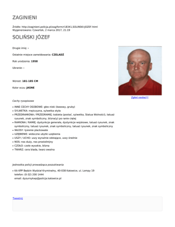 ZAGINIENI Źródło: http://zaginieni.policja.pl/zag/form/r18341,SOLINSKI-JOZEF.html Wygenerowano: Czwartek, 2 marca 2017, 21:19 SOLIŃSKI JÓZEF Drugie imię: Ostatnie miejsce zameldowania: CZELADŹ Rok urodzenia: 1958 Ubranie: - Wzrost: 181-185 CM Kolor oczu: JASNE Zgłoś osobę!!! Cechy rysopisowe ● INNE CECHY OSOBOWE: głos niski (basowy, gruby) ● SYLWETKA: mężczyzna, sylwetka otyła ● PRZEDRAMIONA / PRZEDRAMIĘ: kobieta (postać, sylwetka, Statua Wolności), tatuaż rysunek, znak symboliczny, blizna(y) po ranie ciętej ● RAMIONA / RAMIĘ: dystynkcje generała, dystynkcje wojskowe, tatuaż rysunek, znak symboliczny, tatuaż rysunek, znak symboliczny, tatuaż rysunek, znak symboliczny ● WŁOSY: łysienie plackowate ● UZĘBIENIE: widoczne ubytki uzębienia ● USZY / UCHO: uszy wyraźnie odstające, uszy średnie ● NOS: nos duży, nos prostolinijny ● CZOŁO: czoło wysokie, blizna ● TWARZ: cera blada, twarz owalna Jednostka policji prowadząca poszukiwania ● KA KPP Będzin Wydział Kryminalny, 40-038 Katowice, ul. Lompy 19 telefon: (0-32) 200 1444 email: [email protected] Tweetnij