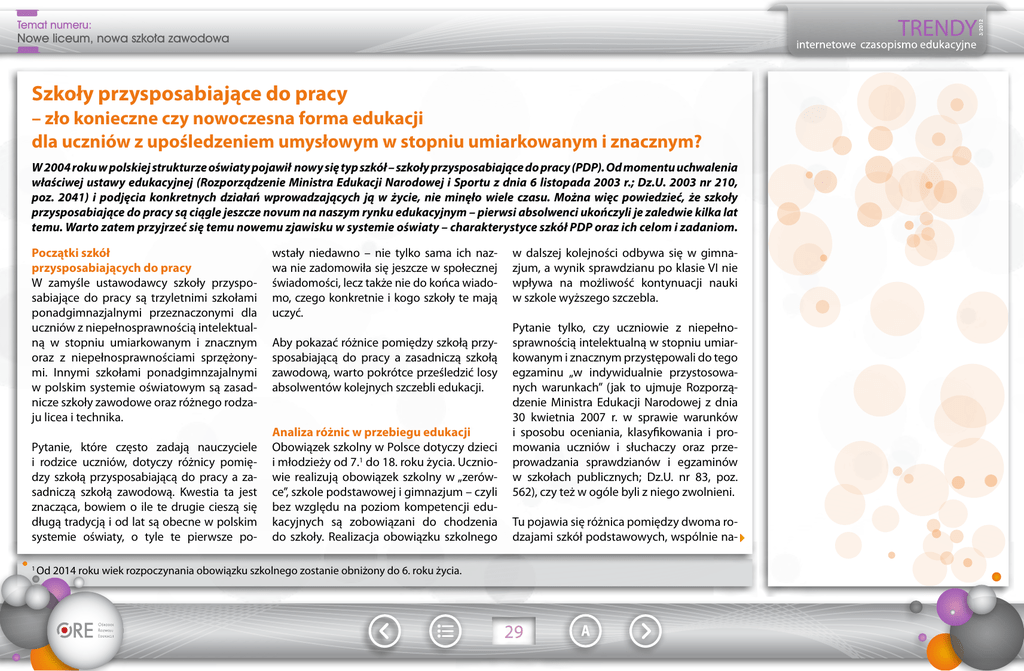 3/2012 Temat numeru: Nowe liceum, nowa szkoła zawodowa Szkoły przysposabiające do pracy – zło konieczne czy nowoczesna forma edukacji dla uczniów z upośledzeniem umysłowym w stopniu umiarkowanym i znacznym? W 2004 roku w polskiej strukturze oświaty pojawił nowy się typ szkół – szkoły przysposabiające do pracy (PDP). Od momentu uchwalenia właściwej ustawy edukacyjnej (Rozporządzenie Ministra Edukacji Narodowej i Sportu z dnia 6 listopada 2003 r.; Dz.U. 2003 nr 210, poz. 2041) i podjęcia konkretnych działań wprowadzających ją w życie, nie minęło wiele czasu. Można więc powiedzieć, że szkoły przysposabiające do pracy są ciągle jeszcze novum na naszym rynku edukacyjnym – pierwsi absolwenci ukończyli je zaledwie kilka lat temu. Warto zatem przyjrzeć się temu nowemu zjawisku w systemie oświaty – charakterystyce szkół PDP oraz ich celom i zadaniom. Początki szkół przysposabiających do pracy W zamyśle ustawodawcy szkoły przysposabiające do pracy są trzyletnimi szkołami ponadgimnazjalnymi przeznaczonymi dla uczniów z niepełnosprawnością intelektualną w stopniu umiarkowanym i znacznym oraz z niepełnosprawnościami sprzężonymi. Innymi szkołami ponadgimnzajalnymi w polskim systemie oświatowym są zasadnicze szkoły zawodowe oraz różnego rodzaju licea i technika. Pytanie, które często zadają nauczyciele i rodzice uczniów, dotyczy różnicy pomiędzy szkołą przysposabiającą do pracy a zasadniczą szkołą zawodową. Kwestia ta jest znacząca, bowiem o ile te drugie cieszą się długą tradycją i od lat są obecne w polskim systemie oświaty, o tyle te pierwsze po1 wstały niedawno – nie tylko sama ich nazwa nie zadomowiła się jeszcze w społecznej świadomości, lecz także nie do końca wiadomo, czego konkretnie i kogo szkoły te mają uczyć. Aby pokazać różnice pomiędzy szkołą przysposabiającą do pracy a zasadniczą szkołą zawodową, warto pokrótce prześledzić losy absolwentów kolejnych szczebli edukacji. Analiza różnic w przebiegu edukacji Obowiązek szkolny w Polsce dotyczy dzieci i młodzieży od 7.1 do 18. roku życia. Uczniowie realizują obowiązek szkolny w „zerówce”, szkole podstawowej i gimnazjum – czyli bez względu na poziom kompetencji edukacyjnych są zobowiązani do chodzenia do szkoły. Realizacja obowiązku szkolnego w dalszej kolejności odbywa się w gimnazjum, a wynik sprawdzianu po klasie VI nie wpływa na możliwość kontynuacji nauki w szkole wyższego szczebla. Pytanie tylko, czy uczniowie z niepełnosprawnością intelektualną w stopniu umiarkowanym i znacznym przystępowali do tego egzaminu „w indywidualnie przystosowanych warunkach” (jak to ujmuje Rozporządzenie Ministra Edukacji Narodowej z dnia 30 kwietnia 2007 r. w sprawie warunków i sposobu oceniania, klasyfikowania i promowania uczniów i słuchaczy oraz przeprowadzania sprawdzianów i egzaminów w szkołach publicznych; Dz.U. nr 83, poz. 562), czy też w ogóle byli z niego zwolnieni. Tu pojawia się różnica pomiędzy dwoma rodzajami szkół podstawowych, wspólnie na- Od 2014 roku wiek rozpoczynania obowiązku szkolnego zostanie obniżony do 6. roku życia. 29 3/2012 Temat numeru: Nowe liceum, nowa szkoła zawodowa zywanych „szkołami specjalnymi”. Specjalna szkoła podstawowa dla uczniów z lekką niepełnosprawnością intelektualną niejako naśladuje szkołę masową. Na świadectwie ukończenia danej klasy znajdują się przedmioty i oceny zgodne ze standardowym systemem oceniania. Natomiast szkoła specjalna dla uczniów z umiarkowaną i znaczną niepełnosprawnością intelektualną, nazywana nieformalnie „szkołą życia”, nie stosuje podziału na przedmioty (w standardowym rozumieniu), świadectwo ukończenia klasy ma charakter opisowy, a po ukończeniu VI klasy uczniowie nie przystępują do sprawdzianu, nawet na specjalnych warunkach. sprawdzane przez egzaminatorów okręgowych komisji egzaminacyjnych. Natomiast uczniowie szkół przysposabiających do pracy są przyjmowani do szkoły po ukończeniu gimnazjum, na podstawie orzeczenia o potrzebie kształcenia specjalnego wydanego z tytułu niepełnosprawności intelektualnej w stopniu umiarkowanym i znacznym, bez konieczności przystępowania do egzaminu. Podobna sytuacja ma miejsce na kolejnym etapie obowiązku szkolnego, czyli w gimnazjum. Uczniowie z lekką niepełnosprawnością intelektualną przystępują do egzaminu gimnazjalnego na specjalnych warunkach, co uprawnia ich do ubiegania się o przyjęcie do szkoły ponadgimnazjalnej. W tym przypadku prawie zawsze mamy na myśli zasadniczą szkołę zawodową. Uczniowie „szkół życia” do takiego egzaminu nie przystępują. Zatem jeśli uczeń chodzi do zasadniczej szkoły zawodowej, musiał uprzednio przystąpić do sprawdzianu w VI klasie szkoły podstawowej oraz do egzaminu w III klasie gimnazjum. Wyniki nie decydują o przyjęciu do szkoły na wyższym etapie edukacji, jednak egzaminy muszą być Nauka w zasadniczej szkole zawodowej w dotychczasowym systemie edukacji trwała nie mniej niż dwa i nie więcej niż trzy lata. Uczęszczający do niej uczniowie realizują program nauczania ogólnego oraz kształcenia zawodowego. Kształcenie zawodowe odbywa się na poziomie czeladniczym, to znaczy w szkole można zdobyć kwalifikacje do wykonywania konkretnego zawodu, zgodnie z profilem danej placówki. Dokumentem świadczącym o ukończeniu zasadniczej szkoły zawodowej jest świadectwo lub dyplom. Uczeń otrzymuje dyplom, jeśli przystępuje do nieobowiązkowego egzaminu końcowego. Ukończenie zasadniczej szkoły zawodowej bez przystąpienia do egzaminu – jedynie na podstawie świadectwa Dwie różne szkoły Na czym polegają różnice w funkcjonowaniu zasadniczej szkoły zawodowej i szkoły przysposabiającej do pracy? – kończy uczestnictwo ucznia w systemie edukacyjnym. Natomiast zdanie egzaminu przed daną okręgową komisją egzaminacyjną i otrzymanie dyplomu upowa