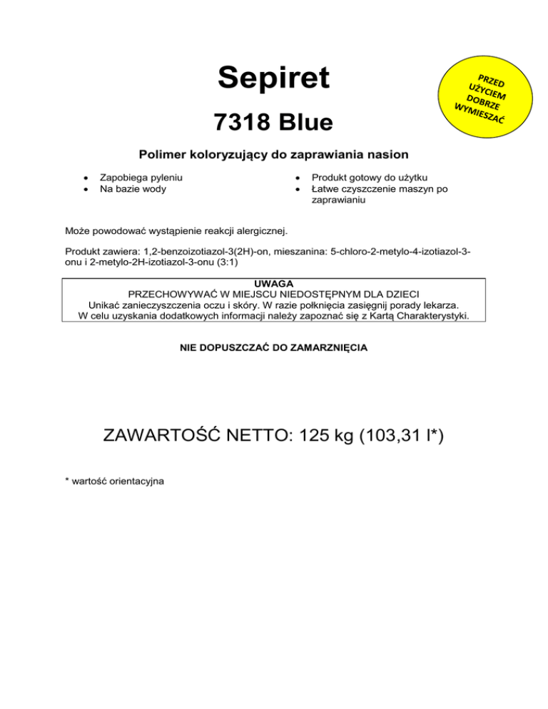 Sepiret 7318 Blue Polimer koloryzujący do zaprawiania nasion • • Zapobiega pyleniu Na bazie wody • • Produkt gotowy do użytku Łatwe czyszczenie maszyn po zaprawianiu Może powodować wystąpienie reakcji alergicznej. Produkt zawiera: 1,2-benzoizotiazol-3(2H)-on, mieszanina: 5-chloro-2-metylo-4-izotiazol-3onu i 2-metylo-2H-izotiazol-3-onu (3:1) UWAGA PRZECHOWYWAĆ W MIEJSCU NIEDOSTĘPNYM DLA DZIECI Unikać zanieczyszczenia oczu i skóry. W razie połknięcia zasięgnij porady lekarza. W celu uzyskania dodatkowych informacji należy zapoznać się z Kartą Charakterystyki. NIE DOPUSZCZAĆ DO ZAMARZNIĘCIA ZAWARTOŚĆ NETTO: 125 kg (103,31 l*) * wartość orientacyjna WSKAZÓWKI DOTYCZĄCE STOSOWANIA: 1. Przed użyciem dobrze wymieszać. 2. W celu poznania zalecanej dawki należy skontaktować się z producentem. 3. Barwnik należy zawsze dodawać do wody, a nie do koncentratu chemicznego. 4. Przed mieszaniem na dużą skalę należy zawsze sprawdzać zgodność wszystkich składników w zawiesinie użytkowej. 5. Po dodaniu barwnika roztwór użytkowy należy mieszać przez co najmniej 10 minut. Nie należy stosować do żywności lub pasz. ŚRODKI OSTROŻNOŚCI Zdjąć zanieczyszczoną odzież. Wdychanie: spokój, świeże powietrze. Kontakt ze skórą: Zmyć dokładnie wodą z mydłem. Kontakt z oczami: Płukać przez 15 min pod bieżącą wodą przy szeroko otwartych oczach. Połknięcie: Wypłukać usta i popić dużą ilością wody. Leczenie objawowe (detoksykacja, podtrzymywanie funkcji życiowych). Nie jeść i nie pić oraz nie palić tytoniu podczas stosowania produktu. Przed przerwami lub po zakończeniu pracy umyć ręce i/lub twarz. Przechowywać z dala od źródeł ciepła. Chronić przed bezpośrednim nasłonecznieniem. Chronić przed spadkiem temperatury poniżej: 0 °C. Chronić przed wzrostem temperatury powyżej: 45 °C. Adres producenta: BASF Agricultural Specialties SAS 10, Chemin de la Plaine Z.I. En Jacca 31770 Colomiers - France Tel.: +33 (0)5 34 50 86 50, Fax: +33 (0)5 61 15 55 72
