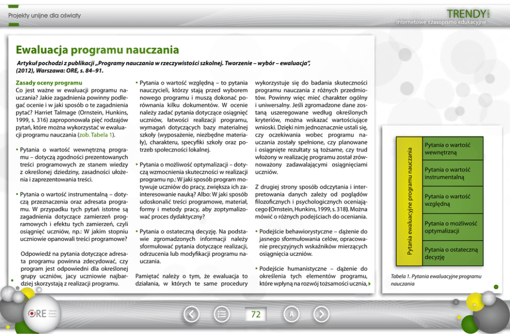 2/2012 Projekty unijne dla oświaty Ewaluacja programu nauczania Zasady oceny programu Co jest ważne w ewaluacji programu nauczania? Jakie zagadnienia powinny podlegać ocenie i w jaki sposób o te zagadnienia pytać? Harriet Talmage (Ornstein, Hunkins, 1999, s. 316) zaproponowała pięć rodzajów pytań, które można wykorzystać w ewaluacji programu nauczania (zob. Tabela 1). • Pytania o wartość wewnętrzną programu – dotyczą zgodności prezentowanych treści programowych ze stanem wiedzy z określonej dziedziny, zasadności ułożenia i zaprezentowania treści. • Pytania o wartość instrumentalną – doty- czą przeznaczenia oraz adresata programu. W przypadku tych pytań istotne są zagadnienia dotyczące zamierzeń programowych i efektu tych zamierzeń, czyli osiągnięć uczniów, np.: W jakim stopniu uczniowie opanowali treści programowe? Odpowiedź na pytania dotyczące adresata programu powinna zdecydować, czy program jest odpowiedni dla określonej grupy uczniów, jacy uczniowie najbardziej skorzystają z realizacji programu. • Pytania o wartość względną – to pytania nauczycieli, którzy stają przed wyborem nowego programu i muszą dokonać porównania kilku dokumentów. W ocenie należy zadać pytania dotyczące osiągnięć uczniów, łatwości realizacji programu, wymagań dotyczących bazy materialnej szkoły (wyposażenie, niezbędne materiały), charakteru, specyfiki szkoły oraz potrzeb społeczności lokalnej. • Pytania o możliwość optymalizacji – doty- czą wzmocnienia skuteczności w realizacji programu np.: W jaki sposób program motywuje uczniów do pracy, zwiększa ich zainteresowanie nauką? Albo: W jaki sposób udoskonalić treści programowe, materiał, formy i metody pracy, aby zoptymalizować proces dydaktyczny? wykorzystuje się do badania skuteczności programu nauczania z różnych przedmiotów. Powinny więc mieć charakter ogólny i uniwersalny. Jeśli zgromadzone dane zostaną uszeregowane według określonych kryteriów, można wskazać wartościujące wnioski. Dzięki nim jednoznacznie ustali się, czy oczekiwania wobec programu nauczania zostały spełnione, czy planowane i osiągnięte rezultaty są tożsame, czy trud włożony w realizację programu został zrównoważony zadawalającymi osiągnięciami uczniów. Z drugiej strony sposób odczytania i interpretowania danych zależy od poglądów filozoficznych i psychologicznych oceniającego (Ornstein, Hunkins, 1999, s. 318). Można mówić o różnych podejściach do oceniania. • Pytania o ostateczną decyzję. Na podsta- • Podejście behawiorystyczne – dążenie do wie zgromadzonych informacji należy sformułować pytania dotyczące realizacji, odrzucenia lub modyfikacji programu nauczania. Pamiętać należy o tym, że ewaluacja to działania, w których te same procedury jasnego sformułowania celów, opracowanie precyzyjnych wskaźników mierzących osiągnięcia uczniów. • Podejście humanistyczne – dążenie do określenia tych elementów programu, które wpłyną na rozwój tożsamości ucznia, 72 Pytania ewaluacyjne programu nauczania Artykuł pochodzi z publikacji „Programy nauczania w rzeczywistości szkolnej. Tworzenie – wybór – ewaluacja”, (2012), Warszawa: ORE, s. 84–91. Pytania o wartość wewnętrzną Pytania o wartość instrumentalną Pytania o wartość względną Pytania o możliwość optymalizacji Pytania o ostateczną decyzję Tabela 1. P ytania ewaluacyjne programu nauczania 2/2012 Projekty unijne dla oświaty rozwiną jego możliwości intelektualne, emocjonalne. Prowadząc proces ewaluacyjny, należy również uwzględnić wymiar organizacyjny i decyzyjny działań. Planowanie – dotyczące sposobu przeprowadzenia ewaluacji, sposobu gromadzenia danych, sposobu kontaktowania się z nauczycielami i uczniami – powinno być precyzyjnie określone. Działania ewaluacyjne mogą dotyczyć oceny programu nauczania w trakcie jego wdrażania lub po wdrożeniu. W związku z tym możemy mówić o ewaluacji formatywnej i sumatywnej. W przypadku ewaluacji sumatywnej chodzi o jednoznaczną i całościową ocenę, która ma doprowadzić do podjęcia decyzji o kontynuowaniu programu lub rezygnacji z jego realizacji. Natomiast ewaluacja formatywna pozwala na dokonywanie zmian w trakcie realizacji programu. Zmiany dotyczyć mogą: • udoskonalenia form i metod pracy z uczniami, tak aby proces dydaktyczny stał się bardziej efektywny; • wybranych aspektów programu; • wprowadzenia lub usunięcia wskazanych (na podstawie danych z oceny) treści itp. Celem ewaluacji formatywnej jest ustalenie źródeł zmiany w zachowaniu uczniów lub nauczycieli czy też wskazanie zmian, jakie pojawiają się przy realizacji programu w zakresie wiedzy i umiejętności uczniów. Działania ewaluacyjne nie muszą prowadzić do całościowej oceny programu. W zależności od celu analizie i opisowi podlegać może wybrany aspekt wdrożonego programu nauczania. Hanna Komorowska (1999) podaje sześć rodzajów zadań, jakie może stawiać sobie ewaluacja programu nauczania – należy pamiętać jednak, że nie jest to lista zamknięta. Cel ewaluacji może być dostosowany do wymagań osób zlecających ocenianie (zob. Rysunek 1). • Ewaluacja celów programowych – ma charakter teoretyczny, dotyczy oceny zasadności (racjonalności) budowania celów programu. • Ewaluacja szansy realizacji ustanowionych celów nauczania – ma charakter empiryczny, dotyczy oceny zakresu celów, czyli określenia stopnia trudności programu, możliwości realizacji celów w szkołach masowych i elitarnych. W tym przypadku istotna jest również ocena dostosowania zaproponowanych przez autora metod nauczania do predyspozycji uczniów, rodzaju szkoły. • Ewaluacja spójności treści nauczania z celami – dotyczy oceny stopnia korelacji celów i treści, przykładem braku takiej spójności może być sytuacja, gdy autor programu języka polskiego formułuje cel w 