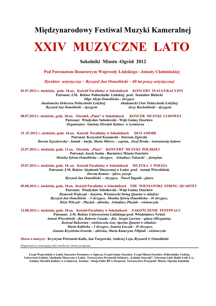 Międzynarodowy Festiwal Muzyki Kameralnej XXIV MUZYCZNE LATO Sokolniki Miasto -Ogród 2012 Pod Patronatem Honorowym Wojewody Łódzkiego - Jolanty Chełmińskiej Dyrektor artystyczny – Ryszard Jan Osmoliński – 40 lat pracy artystycznej 01.07.2012 r. niedziela, godz. 18.oo, Kościół Parafialny w Sokolnikach KONCERT INAUGURACYJNY Patronat: J.M. Rektor Politechniki Łódzkiej prof. Stanisław Bielecki Olga Alicja Osmolińska - skrzypce Akademicka Orkiestra Politechniki Łódzkiej Akademicki Chór Politechniki Łódzkiej Ryszard Jan Osmoliński – dyrygent Jerzy Rachubiński – dyrygent 08.07.2012 r. niedziela, godz. 18.oo, Ośrodek „Pinia” w Sokolnikach KONCER MUZYKI LUDOWEJ Patronat: Władysław Sobolewski - Wójt Gminy Ozorków Organizator: Gminny Ośrodek Kultury w Leśmierzu 15 .07.2012 r. niedziela, godz. 18.oo, Kościół Parafialny w Sokolnikach DUO AMORE Patronat: Krzysztof Kozanecki - Starosta Zgierski Dorota Szyszkowska - Janiak – harfa, Maria Mitrosz – sopran, Józef Broda – instrumenty ludowe 22.07.2012 r. niedziela, godz. 13.oo, Ośrodek „Pinia” KONCERT MUZYKI POLSKIEJ Patronat: Jacek Socha - Burmistrz Miasta Ozorków Monika Sylwia Osmolińska – skrzypce, Arkadiusz Tokarski – fortepian 29.07.2012 r. niedziela, godz. 18..oo, Kościół Parafialny w Sokolnikach MUZYKA I POEZJA Patronat: J.M. Rektor Akademii Muzycznej w Łodzi prof. Antoni Wierzbiński Dorota Koman – śpiew, poezja Ryszard Jan Osmoliński – skrzypce, Paweł Stępnik - gitara 05.08.2012 r. niedziela, godz. 18.oo, Kościół Parafialny w Sokolnikach THE WIENIAWSKI STRING QUARTET Patronat: Władysław Sobolewski - Wójt Gminy Ozorków Ziemowit Wojtczak – baryton, Wieniawski String Quartet w składzie: Ryszard Jan Osmoliński – I skrzypce, Monika Sylwia Osmolińska – II skrzypce, RóŜa Wilczak – Plaziuk - altówka, Arkadiusz Płaziuk – wiolonczela 12.08.2012 r. niedziela, godz. 18.oo, Kościół Parafialny w Sokolnikach ZAKOŃCZENIE FESTIWALU Patronat: J.M. Rektor Uniwersytetu Łódzkiego prof. Włodzimierz Nykiel Antoni Wierzbiński - flet, Roberto Casado – flet, Sergio Larrion – gitara (Hiszpania), Konrad Bukowian - wiolonczela oraz Apertus Quartet w składzie: Marta Kalińska – I skrzypce, Joanna Łuczak – II skrzypce, Joanna Krysińska-Gwarda – altówka, Maria Katarzyna Filipiak - wiolonczela Słowo o muzyce: Krystyna Pietranek-Kulis, Jan Targowski, Andrzej Leja, Ryszard J. Osmoliński Organizatorzy zastrzegają sobie moŜliwość zmiany programu Urząd Wojewódzki w Łodzi, Starostwo Powiatowe w Zgierzu, Urząd Gminy Ozorków, Urząd Miasta Ozorków, Politechnika Łódzka, Uniwersytet Łódzki, Akademia Muzyczna w Łodzi, Towarzystwo Przyjaciół Orkiestry „Łódzkie Smyczki”, Telewizja Łódź, Radio Łódź S.A., Gminny Ośrodek Kultury w Leśmierzu, Katmar - Stacja Paliw BP w Sierpowie, Towarzystwo Przyjaciół Miasta -Ogrodu Sokolniki