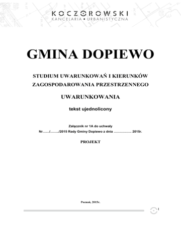 GMINA DOPIEWO STUDIUM UWARUNKOWAŃ I KIERUNKÓW ZAGOSPODAROWANIA PRZESTRZENNEGO UWARUNKOWANIA tekst ujednolicony Załącznik nr 1A do uchwały Nr……/……../2015 Rady Gminy Dopiewo z dnia ……………. 2015r. PROJEKT Poznań, 2015r. 1 SPORZĄDZAJĄCY STUDIUM UWARUNKOWAŃ I KIERUNKÓW ZAGOSPODAROWANIA PRZESTRZENNEGO GMINY DOPIEWO WÓJT GMINY DOPIEWO ADRIAN NAPIERAŁA Opracowanie studium: Filip KOCZOROWSKI Kancelaria Urbanistyczna ul. Tęczowa 8, 60-275 Poznań mgr inż. arch. Filip Koczorowski mgr inż. Łukasz Ślisiński mgr Łukasz Bartoszewski mgr Anna Bilska inż. Karolina Chudy inż. Bartosz Wojtyra Do opracowania Studium Uwarunkowań i Kierunków Zagospodarowania Przestrzennego w 2014r. wykorzystano materiały opracowane przez: Zespół autorski studium: 1999r. mgr inż. arch. Krzysztof Wiza mgr Anna Zielińska mgr Maria Kicińska inż. Ewa Schwermer inż. Gabriela Łosiewicz Zespół autorski zmiany studium 2002 r. mgr inż. arch. Piotr Kozłowski mgr Michał Dudziński mgr inż. Bartosz Burzyński Zespół autorski zmiany studium 2013 r. mgr inż. Krzysztof Cesar - główny projektant (członek ZOIU nr Z-436) mgr Jędrzej Cesar (członek ZOIU nr Z-503) mgr Arkadiusz Gursztyn opracowanie graficzne: Jędrzej Cesar, Arkadiusz Gursztyn 2 I. WSTĘP 1. Podstawa opracowania Ustawa z dnia 27 marca 2003 r. o planowaniu i zagospodarowaniu przestrzennym (Dz. U. z 2012 r. poz. 647 z późn. zmianami). Uchwała Nr XLVI/327/13 Rady Gminy Dopiewo z dnia 27 maja 2013r. w sprawie przystąpienia do sporządzenia studium uwarunkowań i kierunków zagospodarowania przestrzennego gminy Dopiewo. 2. Materiały składające się na całość opracowania Końcowy dokument studium zawiera: − uchwałę Rady Gminy Dopiewo o uchwaleniu studium, − części tekstowej studium, w formie jednolitego tekstu, stanowiącej załącznik nr 1A i 1B do uchwały, − części graficznej stanowiącej załącznik nr 2A i 2B do uchwały, na którą składają się plansze: Uwarunkowania, skala 1:10 000 (2A) Kierunki zagospodarowania przestrzennego, skala 1:10 000 (2B) - materiały inwentaryzacyjne oraz analityczne i studialne wykonane w ramach prac nad studium w WBPP, na które składają się: mapa użytkowania terenu (1:10 000) mapa klasyfikacji gleb + grunty komunalne (1:10 000) plansza ograniczeń (1:10 000) inwentaryzacja stanu istniejącego w zakresie: demografii, rolnictwa, przemysłu i usług studium układu komunikacyjnego gminy (1:25 000) uzbrojenie wod.-kan. (1:25 000) uwarunkowania przyrodnicze (1:10 000) przyrodnicze powiązania funkcjonalno-przestrzenne z elementami ochrony i kształtowania środowiska (1:50 000). „Strategia rozwoju społeczno - gospodarczego gminy Dopiewo”- raport, październik 2001r. „Ocena aktualności Studium uwarunkowań i kierunków zagospodarowania przestrzennego gminy Dopiewo”, wykonane w WBPP w Poznaniu w 2005r., „Opracowanie ekofizjograficzne podstawowe” wykonane w WBPP w Poznaniu w 2007r. składające się z części tekstowej oraz map: - ocena ekofizjograficzne 1:10 000, - struktura przyrodniczo - funkcjonalna 1:20 000, - zagrożenia i degradacje środowiska - identyfikacja większych konfliktów 1:20 000. 3. Materiały wejściowe - Podkłady sytuacyjno - wysokościowe: opracowanie topograficzne z 1987 r., wykonawca -Okręgowe Przedsiębiorstwo Geodezji Kartografii w Poznaniu. - Obowiązujący miejscowy plan ogólny zagospodarowania przestrzennego gm. Dopiewo. - Miejscowe plany zagospodarowania przestrzennego wykonane przed 1995 r. i od tego roku oraz wykaz terenów objętych uchwałami o podjęciu prac nad planem. - Wytyczne z koncepcji studium zagospodarowania przestrzennego województwa poznańskiego. - Materiały statystyczne publikowane i wykonane na zlecenie dla potrzeb WBPP. - „Katalog gmin woj. poznańskiego” - oprac. Urząd Wojewódzki w Poznaniu. - Materiały inwentaryzacyjne do studium zagospodarowania przestrzennego woj. poznańskiego w zakresie: demografii, rolnictwa, działalności produkcyjnej i usług (wykonanie - WBPP). - Wykaz obiektów objętych ochroną konserwatorską (wykonanie - Państwowa Służba Ochrony Zabytków w Poznaniu) 3 - - - - „Miasta i gminy woj. poznańskiego” Józef Pietrzyk, wyd. Wielkopolskie Towarzystwo Kulturalne, 1978 r. Wykaz obiektów archeologicznych objętych ochroną (Archeolog Wojewódzki). Koncepcja trasy linii kolejowej dla dużych prędkości - Centralne Biuro Projektowo -Badawcze Budownictwa Kolejowego, Warszawa. Modernizacja linii kolejowej E-20 w obrębie gminy Dopiewo - Biuro Projektów Kolejowych, Poznań. Koncepcja przebiegu „Obwodnicy Zachodniej” w ciągu drogi nr 11, oprac. w skali 1:10 000, WBPP, 1998 r. Dokumentacja hydrogeologiczna zasobów eksploatacyjnych wód podziemnych piętra czwartorzędowego poziomu wielkopolskiej doliny kopalnej, ujęcia „Joanka” - „Hydroconsult” Sp. z o.o., Biuro Studiów i Badań Hydrogeologicznych i Geofizycznych, Poznań,1997 r. Analityczne i studialne materiały przyrodnicze wykonane do miejscowego planu ogólnego zagospodarowania przestrzennego gm. Dopiewo, WBPP. „Strategia rozwoju społeczno-gospodarczego gminy Dopiewo”- raport, październik 2001r; mapy syt - wys w skali 1:10 000, otrzymane w roku 2006, wykonawca Okręgowe Przedsiębiorstwo Geodezji i Kartografii w Poznaniu; Inwentaryzacja złóż surowców mineralnych województwa poznańskiego, w układzie gminnym. Gmina Dopiewo. PG PROXIMA, O/Poznań 1996; Dokumentacja hydrogeologiczna Regionu Poznańskiego Dorzecza Warty zawierająca ocenę zasobów dyspozycyjnych wód podziemnych z utworów czwartorzędowych i trzeciorzędowych, Hydroconsult Sp. z o.o. Biuro Studiów i Badań Hydrogeologicznych i Geofizycznych w Warszawie, Oddział w Poznaniu, Poznań 1999; Plan zagospodarowania przestrzennego województwa wielkopolskiego Uwarunkowania rozwoju przestrzennego. Kierunki polityki przestrzennej. - WBPP - Poznań 2010; Program ochrony środowiska gminy Dopiewo na lata 2004 - 2007 z uwzględni