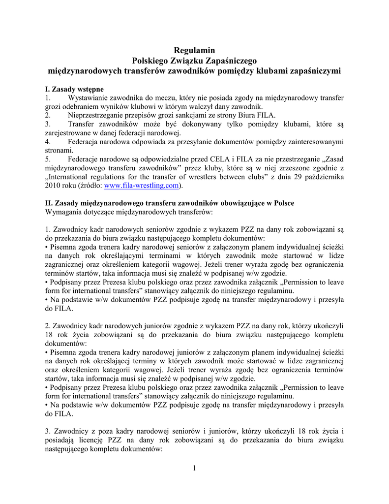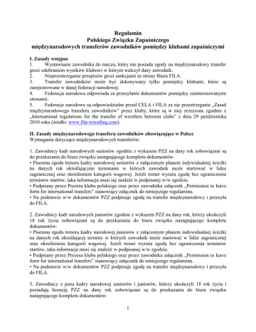 Regulamin Polskiego Związku Zapaśniczego międzynarodowych transferów zawodników pomiędzy klubami zapaśniczymi I. Zasady wstępne 1. Wystawianie zawodnika do meczu, który nie posiada zgody na międzynarodowy transfer grozi odebraniem wyników klubowi w którym walczył dany zawodnik. 2. Nieprzestrzeganie przepisów grozi sankcjami ze strony Biura FILA. 3. Transfer zawodników może być dokonywany tylko pomiędzy klubami, które są zarejestrowane w danej federacji narodowej. 4. Federacja narodowa odpowiada za przesyłanie dokumentów pomiędzy zainteresowanymi stronami. 5. Federacje narodowe są odpowiedzialne przed CELA i FILA za nie przestrzeganie „Zasad międzynarodowego transferu zawodników” przez kluby, które są w niej zrzeszone zgodnie z „International regulations for the transfer of wrestlers between clubs” z dnia 29 października 2010 roku (źródło: www.fila-wrestling.com). II. Zasady międzynarodowego transferu zawodników obowiązujące w Polsce Wymagania dotyczące międzynarodowych transferów: 1. Zawodnicy kadr narodowych seniorów zgodnie z wykazem PZZ na dany rok zobowiązani są do przekazania do biura związku następującego kompletu dokumentów: • Pisemna zgoda trenera kadry narodowej seniorów z załączonym planem indywidualnej ścieżki na danych rok określającymi terminami w których zawodnik może startować w lidze zagranicznej oraz określeniem kategorii wagowej. Jeżeli trener wyraża zgodę bez ograniczenia terminów startów, taka informacja musi się znaleźć w podpisanej w/w zgodzie. • Podpisany przez Prezesa klubu polskiego oraz przez zawodnika załącznik „Permission to leave form for international transfers” stanowiący załącznik do niniejszego regulaminu. • Na podstawie w/w dokumentów PZZ podpisuje zgodę na transfer międzynarodowy i przesyła do FILA. 2. Zawodnicy kadr narodowych juniorów zgodnie z wykazem PZZ na dany rok, którzy ukończyli 18 rok życia zobowiązani są do przekazania do biura związku następującego kompletu dokumentów: • Pisemna zgoda trenera kadry narodowej juniorów z załączonym planem indywidualnej ścieżki na danych rok określającej terminy w których zawodnik może startować w lidze zagranicznej oraz określeniem kategorii wagowej. Jeżeli trener wyraża zgodę bez ograniczenia terminów startów, taka informacja musi się znaleźć w podpisanej w/w zgodzie. • Podpisany przez Prezesa klubu polskiego oraz przez zawodnika załącznik „Permission to leave form for international transfers” stanowiący załącznik do niniejszego regulaminu. • Na podstawie w/w dokumentów PZZ podpisuje zgodę na transfer międzynarodowy i przesyła do FILA. 3. Zawodnicy z poza kadry narodowej seniorów i juniorów, którzy ukończyli 18 rok życia i posiadają licencję PZZ na dany rok zobowiązani są do przekazania do biura związku następującego kompletu dokumentów: 1 • Podpisany przez Prezesa klubu polskiego oraz przez zawodnika załącznik „Permission to leave form for international transfers” stanowiący załącznik do niniejszego regulaminu. • Na podstawie w/w dokumentów PZZ podpisuje zgodę na transfer międzynarodowy i przesyła do FILA. 4. Osobą uprawnioną do podpisywania zgody na transfer międzynarodowy jest Prezes Polskiego Związku Zapaśniczego i osoba przez niego upoważniona Sekretarz Generalny PZZ. 5. W biurze związku transfery międzynarodowe prowadzone są przez osobę zatrudnioną na stanowisku ds. kontaktów międzynarodowych. Kontakt email: [email protected]. 6. Zgoda na transfer między narodowy trafia do klubu zagranicznego z Biura FILA / CELA po przesłaniu załącznika „Request for international transfers” oraz opłaceniu kwoty transferowej określonej w art. 45 Regulaminu dla międzynarodowego transferu zawodników FILA. 7. Międzynarodowe zezwolenia na transfer wydawane są w Europie przez CELA. 8. Prawomocność zezwolenia na międzynarodowy transfer jest ważna od dnia podpisania do końca roku kalendarzowego. 9. PZZ przechowuje wszystkie kopie pozwoleń na międzynarodowy transfer zawodników wraz z załącznikami. 10. Środki finansowe z tytułu transferów międzynarodowych przekazanych od CELA dla PZZ są przeznaczane w całości na zakup licencji zawodniczych FILA zawodników kadry narodowej. 11. Polski Związek Zapaśniczy nie udziela zgody na transfer międzynarodowy zawodnikom nie posiadającym licencji zawodniczej na dany rok kalendarzowy, a tym samym nie zrzeszonym w klubach. III. Procedury dla realizacji międzynarodowych transferów 1. Klub zainteresowany podpisaniem umów z zawodnikiem zagranicznym powinien przesłać wniosek o międzynarodowy transfer do zapaśników którymi jest zainteresowany i do ich klubów. 2. Powyższy wniosek zostaje podany do wiadomości zainteresowanych z dwóch federacji krajowych na odpowiedzialność klubu z prośbą o przeniesienie. 3. Klub, który otrzymał wniosek w sprawie przeniesienia przesyła pisemne odpowiedzi w ciągu miesiąca od daty otrzymania od klubu i do krajowej federacji. W przypadku negatywnej odpowiedzi, pismem z dnia odmowy są przekazywane do klubu wnioskującego i jego federacji. 4. W wypadku porozumienia dla międzynarodowego transferu CELA formularz TIL-1 powinien być wypełniony i podpisany przez zainteresowanego zapaśnika, przez prezydenta jego klubu i prezydenta odpowiedniej Federacji Narodowej. Ostatnie dwa podpisy powinny być uwierzytelnione przez pieczęci klubu i federacji. 5. Formularz TIL-1 powinien być wysłany do klubu i Narodowej Federacji. 6. Po otrzymaniu formularza TIL-1 zainteresowany klub i federacja wypełnia prośbę o międzynarodowe przekazanie formularza TIL-2 który musi być podpisany i opieczętowany przez prezydenta narodowej federacji. 7. Zainteresowana strona powinna wysłać formularze TIL-1 i TIL-2 do urzędu CELA, razem z kopią dokumentu bankowego, potwierdzając wpłatę przekazania zgodnie z przepisami FILA, Artykuł 45. 8. Następnie Komi