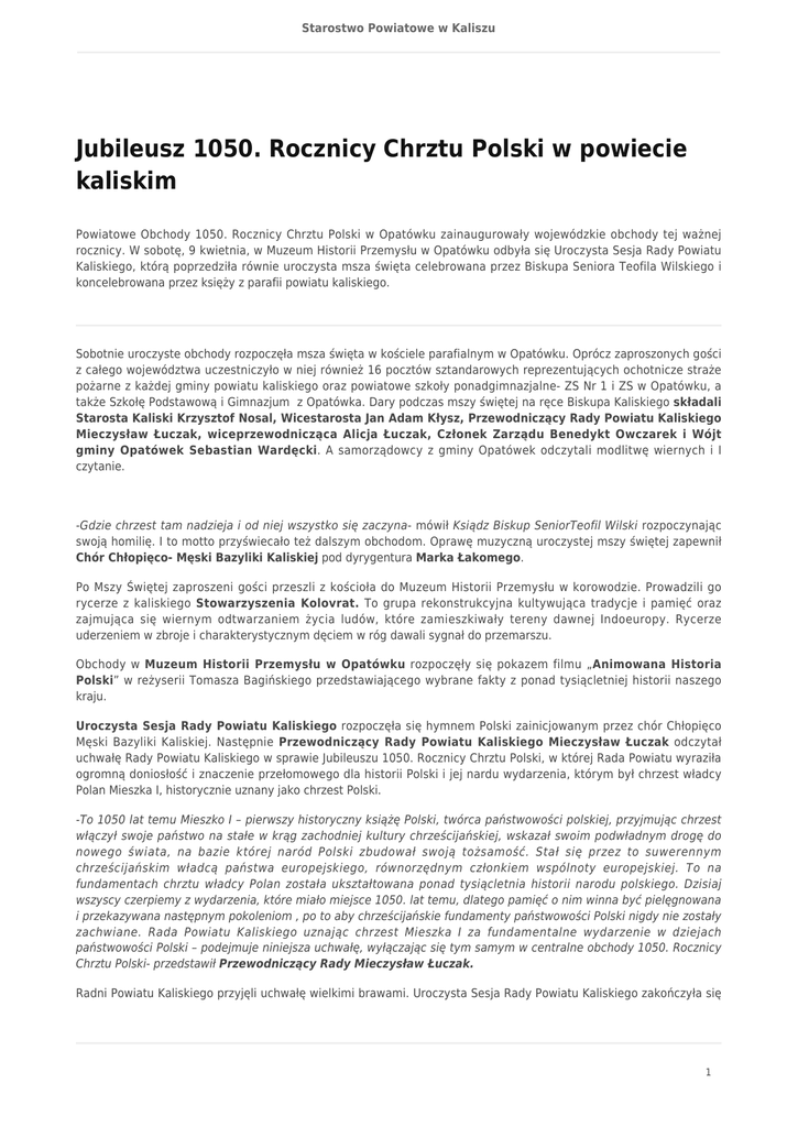 Starostwo Powiatowe w Kaliszu Jubileusz 1050. Rocznicy Chrztu Polski w powiecie kaliskim Powiatowe Obchody 1050. Rocznicy Chrztu Polski w Opatówku zainaugurowały wojewódzkie obchody tej ważnej rocznicy. W sobotę, 9 kwietnia, w Muzeum Historii Przemysłu w Opatówku odbyła się Uroczysta Sesja Rady Powiatu Kaliskiego, którą poprzedziła równie uroczysta msza święta celebrowana przez Biskupa Seniora Teofila Wilskiego i koncelebrowana przez księży z parafii powiatu kaliskiego. Sobotnie uroczyste obchody rozpoczęła msza święta w kościele parafialnym w Opatówku. Oprócz zaproszonych gości z całego województwa uczestniczyło w niej również 16 pocztów sztandarowych reprezentujących ochotnicze straże pożarne z każdej gminy powiatu kaliskiego oraz powiatowe szkoły ponadgimnazjalne- ZS Nr 1 i ZS w Opatówku, a także Szkołę Podstawową i Gimnazjum z Opatówka. Dary podczas mszy świętej na ręce Biskupa Kaliskiego składali Starosta Kaliski Krzysztof Nosal, Wicestarosta Jan Adam Kłysz, Przewodniczący Rady Powiatu Kaliskiego Mieczysław Łuczak, wiceprzewodnicząca Alicja Łuczak, Członek Zarządu Benedykt Owczarek i Wójt gminy Opatówek Sebastian Wardęcki. A samorządowcy z gminy Opatówek odczytali modlitwę wiernych i I czytanie. -Gdzie chrzest tam nadzieja i od niej wszystko się zaczyna- mówił Ksiądz Biskup SeniorTeofil Wilski rozpoczynając swoją homilię. I to motto przyświecało też dalszym obchodom. Oprawę muzyczną uroczystej mszy świętej zapewnił Chór Chłopięco- Męski Bazyliki Kaliskiej pod dyrygentura Marka Łakomego. Po Mszy Świętej zaproszeni gości przeszli z kościoła do Muzeum Historii Przemysłu w korowodzie. Prowadzili go rycerze z kaliskiego Stowarzyszenia Kolovrat. To grupa rekonstrukcyjna kultywująca tradycje i pamięć oraz zajmująca się wiernym odtwarzaniem życia ludów, które zamieszkiwały tereny dawnej Indoeuropy. Rycerze uderzeniem w zbroje i charakterystycznym dęciem w róg dawali sygnał do przemarszu. Obchody w Muzeum Historii Przemysłu w Opatówku rozpoczęły się pokazem filmu „Animowana Historia Polski” w reżyserii Tomasza Bagińskiego przedstawiającego wybrane fakty z ponad tysiącletniej historii naszego kraju. Uroczysta Sesja Rady Powiatu Kaliskiego rozpoczęła się hymnem Polski zainicjowanym przez chór Chłopięco Męski Bazyliki Kaliskiej. Następnie Przewodniczący Rady Powiatu Kaliskiego Mieczysław Łuczak odczytał uchwałę Rady Powiatu Kaliskiego w sprawie Jubileuszu 1050. Rocznicy Chrztu Polski, w której Rada Powiatu wyraziła ogromną doniosłość i znaczenie przełomowego dla historii Polski i jej nardu wydarzenia, którym był chrzest władcy Polan Mieszka I, historycznie uznany jako chrzest Polski. -To 1050 lat temu Mieszko I – pierwszy historyczny książę Polski, twórca państwowości polskiej, przyjmując chrzest włączył swoje państwo na stałe w krąg zachodniej kultury chrześcijańskiej, wskazał swoim podwładnym drogę do nowego świata, na bazie której naród Polski zbudował swoją tożsamość. Stał się przez to suwerennym chrześcijańskim władcą państwa europejskiego, równorzędnym członkiem wspólnoty europejskiej. To na fundamentach chrztu władcy Polan została ukształtowana ponad tysiącletnia historii narodu polskiego. Dzisiaj wszyscy czerpiemy z wydarzenia, które miało miejsce 1050. lat temu, dlatego pamięć o nim winna być pielęgnowana i przekazywana następnym pokoleniom , po to aby chrześcijańskie fundamenty państwowości Polski nigdy nie zostały zachwiane. Rada Powiatu Kaliskiego uznając chrzest Mieszka I za fundamentalne wydarzenie w dziejach państwowości Polski – podejmuje niniejsza uchwałę, wyłączając się tym samym w centralne obchody 1050. Rocznicy Chrztu Polski- przedstawił Przewodniczący Rady Mieczysław Łuczak. Radni Powiatu Kaliskiego przyjęli uchwałę wielkimi brawami. Uroczysta Sesja Rady Powiatu Kaliskiego zakończyła się 1 Starostwo Powiatowe w Kaliszu wspólny odśpiewaniem Roty. Podczas tak ważnych obchodów upamiętniających Chrzest Polski nie mogło zabraknąć również wykonania " Bogurodzicy", polskiej pieśni religijnej i rycerskiej. Popularność i wymowa Bogurodzicy sprawiły, iż uznano ją za pierwszy hymn Polski. W uroczystości udział wzięli Biskup Kaliski Senior Teofil Wilski, europoseł Andrzej Grzyb, poseł Andżelika Możdżanowska, Poseł Piotr Kaleta, poseł Tomasz Ławniczak, wieloletni poseł Józef Racki, wicewojewoda Wielkopolski Marlena Maląg, Marzena Wodzińska Członkini Zarządu Województwa Wielkopolskiego, Prezydent Miasta Kalisza Grzegorz Sapiński wraz z wiceprzewodniczącym Rady Miejskiej Zbigniewem Włodarkiem, Radni Sejmiku Województwa Wielkopolskiego: Mikołaj Grzyb i Jan Grzesiek, samorządowcy z sąsiednich powiatów, burmistrz i wójtowie powiatu kaliskiego, radni powiatu i radni gmin, powiatowe służby i straże oraz zaproszeni goście. Podczas sobotnich obchodów naukowcy z Muzeum Historii Przemysłu w Opatówku przygotowali dwa wykłady. Dr Jarosław Dolat przedstawił wykład pn. „Kościół w początkach Państwa Polskiego”, a dr Ewa Kłysz zaprezentowała wykład pn. „Chrześcijaństwo, a Kultura Polska”. Wykłady przedzielił pokaz filmu „Ukryte gniazdo dynastii”. To pierwsza część serii fabularyzowanych filmów dokumentalnych Zdzisława Cozaca „TAJEMNICE POCZĄTKÓW POLSKI”. To nowocześnie zrealizowana filmowa panorama początków naszego państwa, dedykowana na jubileusz 1050-lecia Chrztu Polski. Film prezentuje najnowsze ustalenia naukowców nt. początków Polski, obejmując okres od czasów przedchrześcijańskich, po koronację Bolesława Chrobrego na króla Polski w 1025 r. Ten mało jeszcze rozpoznany okres naszych dziejów jest od niedawna na nowo interpretowany przez naukowców. „Tajemnice początków Polski” to projekt autorski scenarzysty, reżysera i producenta filmów dokumentalnych Zdzisława Cozaca, zrealizo