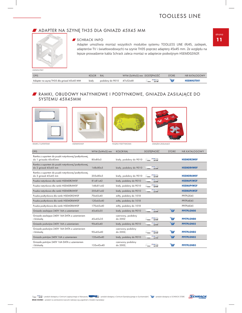 TOOLLESS LINE W ADAPTER NA SZYNĘ TH35 DLA GNIAZD 45X45 MM strona 11 W SCHRACK INFO Adapter umożliwia montaż wszystkich modułów systemu TOOLLESS LINE (RJ45, zaślepek, adapterów TV i światłowodowych) na szynie TH35 poprzez adaptery 45x45 mm. Ze względu na lepsze prowadzenie kabla Schrack zaleca montaż w adapterze podwójnym HSEMD02W2F. HSEMHUT001 OPIS KOLOR RAL WYM (SxWxG) mm DOSTĘPNOŚĆ Adapter na szynę TH35 dla gniazd 45x45 MM biały podobny do 9010 47x52x68 STORE NR KATALOGOWY HSEMHUT001 W RAMKI, OBUDOWY NATYNKOWE I PODTYNKOWE, GNIAZDA ZASILAJĄCE DO SYSTEMU 45X45MM RAMKI Z SUPORTAMI HSEMAP2W3F OPIS PUSZKA PODTYNKOWA GNIAZDA ZASILAJĄCE WYM (SxWxG) mm KOLOR RAL Ramka z suportem do puszki natynkowej/podtynkowej, do 1 gniazda 45x45mm 80x80x5 biały, podobny do 9010 HSEMDR2W0F Ramka z suportem do puszki natynkowej/podtynkowej, do 2 gniazd 45x45 mm 148x80x5 biały, podobny do 9010 HSEMDR4W0F Ramka z suportem do puszki natynkowej/podtynkowej, do 3 gniazd 45x45 mm 205x80x5 biały, podobny do 9010 HSEMDR6W0F Puszka natynkowa dla ramki HSEMDR2W0F 81x81x42 biały, podobny do 9010 HSEMAP2W3F Puszka natynkowa dla ramki HSEMDR4W0F 148x81x42 biały, podobny do 9010 HSEMAP4W3F Puszka natynkowa dla ramki HSEMDR6W0F 205x81x42 biały, podobny do 9010 HSEMAP6W3F Puszka podtynkowa dla ramki HSEMDR2W0F 70x65x40 żółty, podobny do 1018 PPITPL2E45 Puszka podtynkowa dla ramki HSEMDR4W0F 120x65x40 żółty, podobny do 1018 PPITPL4E45 Puszka podtynkowa dla ramki HSEMDR6W0F 170x65x40 żółty, podobny do 1018 PPITPL6E45 Gniazdo zasilające 240V 16A z uziemieniem 45x45x35 biały, podobny do 9010 PPITPLGN00 Gniazdo zasilające 240V 16A DATA z uziemieniem i blokadą 45x45x35 czerwony, podobny do 2002 PPITPLGNB0 Gniazdo podwójne 240V 16A z uziemieniem 90x45x40 biały, podobny do 9010 PPITPLGN02 Gniazdo podwójne 240V 16A DATA z uziemieniem i blokadą 90x45x40 czerwony podobny do 2002, PPITPLGNB2 Gniazdo potrójne 240V 16A z uziemieniem 135x45x40 biały, podobny do 9010 PPITPLGN03 135x45x40 czerwony podobny do 2002, PPITPLGNB3 Gniazdo potrójne 240V 16A DATA z uziemieniem i blokadą – produkt dostępny z Centrum Logistycznego w Warszawie, DOSTĘPNOŚĆ – produkt dostępny z Centrum Dystrybucyjnego w Guntramsdorf, BRAK IKONKI – produkt na zamówienie (warunki realizacji wg uzgodnień z Działem Sprzedaży) STORE NR.KATALOGOWY – produkt dostępny w SCHRACK STORE