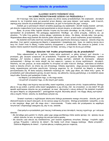 Przygotowanie dziecka do przedszkola DLACZEGO WARTO POŚWIĘCIĆ CZAS NA DOBRE PRZYGOTOWANIE DZIECKA DO PRZEDSZKOLA ? Od trzeciego roku życia dziecka zaczyna się okres zwany przedszkolnym. Dla większości dorosłych oznacza to, że trzylatek może już pozostać przez dłuższy czas poza domem i pod opieką osób trzecich, zapisują więc dziecko do przedszkola w przekonaniu, że jest to korzystne dla jego rozwoju. Jednak już w pierwszych dniach września pojawiają się wątpliwości: dorośli muszą bowiem patrzeć, jak dziecko rozpaczliwie broni się przed pozostaniem w obcym miejscu, w oderwaniu od najbliższych. Bywa, że przez kilka tygodni dziecko trzyma się kurczowo dorosłego, że siłą trzeba je odrywać i wprowadzać do przedszkola. Nie pomagają zapewnienia: Niedługo po ciebie przyjdę... Zabiorę cię po obiedzie... To tylko trzy godziny, zrobię zakupy i pójdziemy do domu... Im dłużej dorosły mówi, tym gorzej. Wypowiadane słowa mają bowiem dla dziecka jedno znaczenie - strach przed rozstaniem, przed nieznanym. Na dodatek nietrudno dostrzec narastające koszty psychiczne dziecięcej rozpaczy: dziecko staje się płaczliwe, traci apetyt, pojawiają się kłopoty z zasypianiem i niespokojny sen, bywa, że częściej moczy się w nocy itd. Jeżeli trwa to dłużej, trzeba niestety zrezygnować z przedszkola. Nie oznacza to jednak, iż nie będzie równie wysokich kosztów adaptacyjnych do klasy zerowej, a tego nie da się już uniknąć. Dlaczego dzieciom tak trudno przystosować się do przedszkola? Żeby odpowiedzieć na to pytanie, trzeba sobie wyobrazić, w jakiej sytuacji jest dziecko i co przeżywa, gdy zaczyna uczęszczać do przedszkola. Trzylatek ma jeszcze słabo ukształtowany system własnego „Ja" (wiedza o samym sobie, poczucie własnej wartości, zdolność do kierowania własnym zachowaniem) i dlatego nie może obejść się bez wsparcia i pomocy ze strony najbliższych dorosłych. Niestety, nie wie jeszcze, że może wszystko to otrzymać od osób trzecich. Dlatego oderwanie od bliskich budzi w dziecku strach, że stanie się coś strasznego. Silnemu zagrożeniu ulega poczucie bezpieczeństwa, bodaj najważniejsza potrzeba psychiczna. Sytuację pogarsza to, że trzylatek ma kłopoty w słownym porozumiewaniu się. W domu wszyscy doskonale rozumieją nie tylko jego słowa, ale także miny i gesty. W przedszkolu jest zdecydowanie gorzej, bo pani inaczej się uśmiecha, inaczej gestykuluje, a na dodatek używa innych słów. Dziecku jest podwójnie trudno, bo: • ma kłopoty z przekazaniem tego, co dla niego ważne, • nie potrafi zrozumieć tego, co dla innych jest ważne. Przez długi czas kojarzy nauczycielkę, nawet najmilszą, z poczuciem utraty bezpieczeństwa. Dlatego płacze na jej widok, a potem unika nawet spoglądania w jej stronę. Jak ma zrozumieć, co ona mówi? W jaki sposób wystraszone dziecko ma jej przekazać, że musi skorzystać z obcej ubikacji? Na dodatek trzylatek ma spore kłopoty ze zdejmowaniem i podciąganiem majtek. Bezradny płacze i nie mogąc dłużej wytrzymać sika w majtki. Potem szlocha, bo dodatkowo wstydzi się. Dramat rozstania z najbliższymi skutecznie blokuje poznawanie nowego otoczenia: dziecko jest tak skoncentrowane na swych emocjach, że nie zwraca uwagi na otoczenie. Dlatego przedszkole i wszystko, co się w nim znajduje; długo jest dla niego obce i niezrozumiałe. Trzeba wielu dni przebywania na wspólnym terytorium i stopniowego oswajania się, aby to się zmieniło. Czas pobytu w przedszkolu jest inaczej traktowany przez dorosłych, inaczej rejestruje go i odczuwa dziecko: • dla dorosłego parę godzin to chwila, gdyż jego uwagę pochłaniają różne ważne sprawy; nie spieszy się po odbiór dziecka, bo wie, że znajduje się ono pod dobrą opieką; • dla dziecka czas wlecze się niemiłosiernie, jest bowiem wypełniony strachem. Dlatego trzylatki ciągle pytają: Przyjdzie i zabierze do domu?... Na każdy ruch drzwi reagują nadzieją: Mama przyszła?... Zabierze Magdusię do domu?... A potem płaczą z większą jeszcze rozpaczą. Przygotowanie dziecka do przedszkola Trzylatki same usiłują opanować swój strach, aby jakoś wytrzymać dramat rozstania i bezpieczeństwa. Mówią do siebie głośno w taki, na przykład, sposób: Magdusia nie płacze... Magdusia grzeczna... Magdusia czeka... Dziewczynka powtarzała słowa babci, bo pomagały jej powstrzymać się od płaczu. Krzyś dodawał sobie otuchy szepcząc: Tatuś przyjdzie... Zabierze.. Marysia przez cały czas pobytu w przedszkolu ściskała w rączce swój kocyk, bo w ten sposób mogła choć odrobinę poczuć się pewniej. Żeby zmniejszyć strach, trzylatki chcą przebywać blisko siebie, a jeżeli jedno płacze, pozostałe takie zaczynają szlochać. Jest im raźniej, ale odnosi się wrażenie, że wprost zarażają się płaczem. Najgorsze są poniedziałki: w domu było bezpiecznie, a teraz znowu źle. Dlatego w poniedziałkowe ranki dzieci mocno protestują przeciw zmianie na gorsze. W następnych dniach tygodnia jest nieco lepiej, ale w kolejny poniedziałek wszystko zaczyna się od nowa. Rozpacz trzylatków trwa całe tygodnie, bywa że od września do grudnia, a zaburzenie potrzeby bezpieczeństwa kładzie się cieniem na rozwoju bodaj każdego dziecka. Wyniki badań nad adaptacją dzieci do przedszkola. • Nie ma wyraźnego związku pomiędzy wiekiem dziecka a kosztami psychicznymi przystosowania się do przedszkola. Równie silnie mogą rozpaczać pięcio-, sześciolatki, a nawet pierwszoklasiści. • Dziewczynki na ogół lepiej przystosowują się do przedszkola i szkoły niż chłopcy. Nie oznacza to jednak, że wśród dziewczynek nie będzie takich, które szczególnie silnie przeżywają rozstanie z bliskimi. Ponieważ kłopoty adaptacyjne chłopców występują częściej i mają trudniejszy przebieg, warto pomyśleć nad ich złagodzeniem. • Istnieje silny związek pomiędzy przystosowaniem się dzieci do p