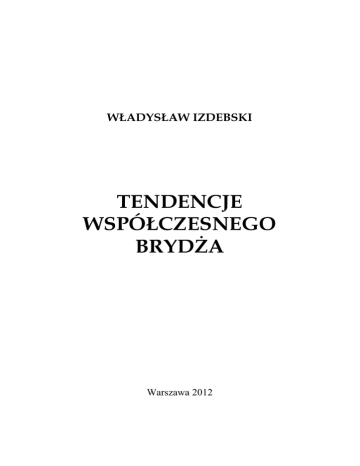 WŁADYSŁAW IZDEBSKI TENDENCJE WSPÓŁCZESNEGO BRYDŻA Warszawa 2012 Kontry bilansowe (1) 3 Kontry bilansowe (1) Uważni obserwatorzy zmagań profesjonalnych brydżystów (transmisje na BBO) zapewne zauważyli, jak bardzo zmienia się znaczenie odzywki „kontra”. Coraz rzadziej odzywka ta służy karceniu przeciwnika, a coraz częściej ma charakter wywoławczy. We współczesnym brydżu agresywność licytacji walczących stron bardzo się zwiększyła. Otwarcia z 11(10) PC, odpowiedzi z 4+ miltonami oraz wejścia z „kotem w galarecie” nie są w dzisiejszym brydżu niczym nadzwyczajnym. W coraz mniejszym stopniu możemy polegać na tzw. bilansie stolika. Bywa on tak rozchwiany, że niekiedy trudno jest określić, po czyjej stronie jest przewaga siły, kto jest w ataku, a kto w obronie. Jako antidotum na ten stan rzeczy pojawiły się kontry bilansowe. Pisałem o tym w artykułach: „Czyja wina, czyli jaka kontra?” (ŚB 11-12/2008) oraz „Kontra bilansowa” (ŚB 3-4/2010). Pora temat ten nieco rozwinąć. Jako E posiadasz kartę: ♠ AD75 ♥98 ♦ AKD82 ♣32 Licytacja: W N E S 1♦ pas 1♥ pas 1♠ ? 3♥ Co licytujesz? 4 W. Izdebski, Tendencje współczesnego brydża Popatrz na całe rozdanie (final Rosenblum Cup, Montreal 2002, Włochy – Indonezja): Obie po, rozd. W. ♠ 8 4 3 2 ♥ AKDW82 ♦ 10 ♣W4 ♠K96 ♠AD75 N ♥ 10 ♥94 W E ♦ W9765 ♦AKD82 S ♣ A K D 10 ♣32 ♠ W 10 ♥7652 ♦ 43 ♣98765 Stół pierwszy 1 W Duboin N Karwar E Bocchi S Sacul 1♦ pas 4♣ 4♥ 5♣ 1♥ pas pas pas pas ktr. ktr. 4♦ 4♠ 6♦ 3 ♥1 pas pas pas pas... szaleńczy blok. Krzysztof Martens tak komentuje licytację Włochów (WE): Kluczem do tej pięknej licytacji była powtórna kontra Bocchiego. Pozwoliła ona na dwustronną wymianę informacji. Seria cue-bidów i 5♣, które mówiło – mamy wszystkie cue-bidy, ale co z atutami? Wreszcie 6♦ - o atuty się nie martw. Stół drugi W Lasut 1♦ ktr. N Versace 1♥ 3♥ E Manoppo S Lauria ktr. 5♦ 2♥ pas... Kontry bilansowe (1) 5 Manoppo (Indonezja) zapewne obawiał się kontrować 3♥ z tak dużym fitem karowym. Oznacza to, że Lasut często ukarnia kontrę w takich pozycjach licytacyjnych. Odzywka 5♦ jest z tego punktu widzenia bezpieczna, ale bardzo obniża poziom licytacji pary. Blokujące uzgodnienie koloru, a więc tego typu: W N E S 1♦ pas 1♥ pas ktr. ktr. 3♥ z założenia ujawnia dziewięć lub więcej atutów u przeciwnika, co jednocześnie gwarantuje naszej stronie także posiadanie koloru uzgodnionego. Zgodnie z zasadą lew łącznych, 9 atutów daje opłacalną licytację na poziomie trzech. Jeśli tak, to rozsądek podpowiada nam, iż kontra E na 3♥ nie może być karna, jest zdecydowanie wywoławczą. Na przykład w sekwencji: W N E S 1♦ ktr. 3♦ ktr. nikomu nie przyjdzie do głowy, iż kontra S jest karna, jest jedynie poszukiwaniem koloru uzgodnionego, który niewątpliwie mamy. Dlatego dziś, zwłaszcza w profesjonalnym brydżu, większość par stosuje zasadę: Kontra na blokujące uzgodnienie koloru na poziomie trzech wskazuje siłę i jest niemal obligatoryjnie wywoławczą. Chcąc silnie uzgodnić kolor partnera, poprzedź to kontrą na uzgodniony kolor przeciwników. W sytuacjach „przepychowych” uzgodnienie koloru partnera jest tylko walką o zapis w strefie częściówki. Taki mechanizm pozwala znaleźć drogę do właściwego kontraktu, np. w takim rozdaniu: 6 W. Izdebski, Tendencje współczesnego brydża ♠96 ♥K7 ♦ D 10 7 6 5 ♣AKW5 1 W N 1♦ pas 3 BA 1♥ pas pas... N W E S ♠AD85 ♥98 ♦AK32 ♣8 3 2 E 1 ♠/ktr.1 ktr. S 3 ♥2 pas w zależności od ustaleń; 2 blokujące. Już standardem stało się ustalenie, iż kontra na swobodnie uzgodniony kolor na poziomie dwóch jest nie jest karna. Poniższe rozdanie prezentowane było we francuskim Le Bridgeur. Turniej par, obie po partii, rozd. W. ♠A76 ♥A ♦ A864 ♣A9764 N W E S ♠63 ♥ D 10 7 6 5 4 ♦ K D 10 7 3 ♣— Zaledwie 23 miltony na linii. Jednak niezwykle układowy charakter rąk pozwala myśleć o wzięciu 12-13 lew przy grze w kara. Sekwencja, która miała miejsce przy stole (system naturalny): W N E S 1♣ 2♦ 2 BA 3♠ 5♣ pas 2♠ pas pas pas 1♥ ktr. 3♦ 4 BA 6♦ 1♠ pas pas pas pas... Rewers 2♦ jest niewielki, ale jego zaletą są 4 asy (asy są więcej warte niż 4 punkty). Po 2♠, 3♦ E byłoby walką o częściówkę, nie forsowałoby licytacji. Natomiast 3♦, poprzedzone kontrą, forsuje. Blackwood po cuebidzie 3♠ nie był typowy ze względu na renons treflowy, ale okazał się niezwykle skuteczny. Choć wychodził szlem, to szlemik już był w tym turnieju znakomitym wynikiem. Rozrzut kontraktów był ogromny, niektórzy poprzestali na częściówce, ci co próbowali 3BA – brali 8 lew. Kontry bilansowe (1) 7 Kilka przykładowych sekwencji (licytacja naturalna, np. systemem SAYC) a) W N E S 1♣ 2 ♦2 pas 2♠ 1 ♥1 3 ♣/♦3 1♠ 1 w systemach o pełnej strefie otwarć, może być słabe, 4+ PC; 2 rewers (w licytacji dwustronnej może być nieco słabszy niż zwykle); 3 nie forsuje. b) W N 1♣ 2 ♦1 2 BA pas 2♠ pas 1 rewers; 2 c) E 1♥ ktr.2 3 ♣/♦3 S 1♠ pas wskazanie siły; 3 forsuje. W N E 1 BA pas pas pas 3 ♣1 ktr.2 S 3♠ 1 transfer na kara, może być bardzo słaby; 2 wskazanie siły dającej bilans na końcówkę, nie obiecuje żadnej opozycji w pikach, wręcz pyta o zatrzymanie w tym kolorze. d) 1 W N E 1 BA pas pas pas 3 ♣1 4 ♦2 S 3♠ transfer na kara, może być bardzo słaby; 2 długie kara, słaba ręka, nie forsuje. 8 W. Izdebski, Tendencje współczesnego brydża Na zakończenie przykład na pierwszy rzut oka dosyć szokujący: 1 W N E 1♥ 3♥ ktr. ? 2 ♥1 S 2♠ słabe podniesienie. Ręka N: ♠ AKW5 ♥4 ♦ A643 ♣KDW3 Czy przyszłoby Ci do głowy kontrować z tą ręką? Na pewno NIE! A jednak niektórzy eksperci uważają, iż kontra N powinna być forsująca, gdyż przeciwnicy blokując, posiadają 9 atutów. Taka forsująca k