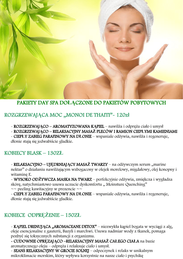 PAKIETY DAY SPA DOŁĄCZONE DO PAKIETÓW POBYTOWYCH ROZGRZEWAJĄCA MOC „MONOI DE THAITI”- 120zł - ROZGRZEWAJĄCO – AROMATYZOWANA KĄPIEL – nawilża i odpręża ciało i umysł - ROZGRZEWAJĄCO – RELAKSACYJNY MASAŻ PLECÓW I RAMION CIEPŁYMI KAMIENIAMI - CIEPŁY ZABIEG PARAFINOWY NA DŁONIE – wspaniale odżywia, nawilża i regeneruje, dłonie stają się jedwabiście gładkie. KOBIECY BLASK – 130ZŁ - RELAKSACYJNO – UJĘDRNIAJĄCY MASAŻ TWARZY – na odżywczym serum „marine nektar” o działaniu nawilżającym wzbogacony w olejek morelowy, migdałowy, olej konopny i witaminę E. - WYSOKO ODŻYWCZA MASKA NA TWARZ – perfekcyjnie odżywia, zmiękcza i wygładza skórę, natychmiastowo usuwa uczucie dyskomfortu „ Moinsture Quenching” ~~ peeling kawitacyjny w prezencie ~~ - CIEPŁY ZABIEG PARAFINOWY NA DŁONIE – wspaniale odżywia, nawilża i regeneruje, dłonie stają się jedwabiście gładkie. KOBIECE ODPRĘŻENIE – 150ZŁ - KĄPIEL DRENUJĄCA „AROMACEANE DETOX” – niezwykła kąpiel bogata w wyciągi z alg, oleje esencjonalne z gauterii, Bazyli i marchwi. Usuwa nadmiar wody z tkanek, pomaga pozbyć się toksycznych substancji z organizmu. - CUDOWNIE OPRĘZAJĄCO –RELAKSACYJNY MASAŻ CAŁEGO CIAŁA na bazie aromatycznego oleju – odpręża i relaksuje ciało i umysł. - SEANS RELAKSACYJNY W GROCIE SOLNEJ – odpoczynek i relaks w unikalnym mikroklimacie morskim, który wpływa korzystnie na nasze ciało i psychikę
