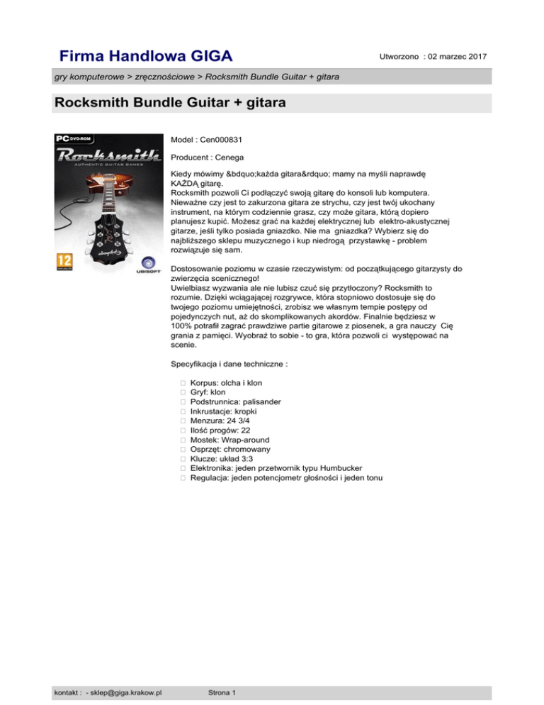 Firma Handlowa GIGA Utworzono : 02 marzec 2017 gry komputerowe > zręcznościowe > Rocksmith Bundle Guitar + gitara Rocksmith Bundle Guitar + gitara Model : Cen000831 Producent : Cenega Kiedy mówimy „każda gitara” mamy na myśli naprawdę KAŻDĄ gitarę. Rocksmith pozwoli Ci podłączyć swoją gitarę do konsoli lub komputera. Nieważne czy jest to zakurzona gitara ze strychu, czy jest twój ukochany instrument, na którym codziennie grasz, czy może gitara, którą dopiero planujesz kupić. Możesz grać na każdej elektrycznej lub elektro-akustycznej gitarze, jeśli tylko posiada gniazdko. Nie ma gniazdka? Wybierz się do najbliższego sklepu muzycznego i kup niedrogą przystawkę - problem rozwiązuje się sam. Dostosowanie poziomu w czasie rzeczywistym: od początkującego gitarzysty do zwierzęcia scenicznego! Uwielbiasz wyzwania ale nie lubisz czuć się przytłoczony? Rocksmith to rozumie. Dzięki wciągającej rozgrywce, która stopniowo dostosuje się do twojego poziomu umiejętności, zrobisz we własnym tempie postępy od pojedynczych nut, aż do skomplikowanych akordów. Finalnie będziesz w 100% potrafił zagrać prawdziwe partie gitarowe z piosenek, a gra nauczy Cię grania z pamięci. Wyobraź to sobie - to gra, która pozwoli ci występować na scenie. Specyfikacja i dane techniczne : � Korpus: olcha i klon � Gryf: klon � Podstrunnica: palisander � Inkrustacje: kropki � Menzura: 24 3/4 � Ilość progów: 22 � Mostek: Wrap-around � Osprzęt: chromowany � Klucze: układ 3:3 � Elektronika: jeden przetwornik typu Humbucker � Regulacja: jeden potencjometr głośności i jeden tonu kontakt : - [email protected] Strona 1 Firma Handlowa GIGA gry komputerowe > zręcznościowe > Rocksmith Bundle Guitar + gitara Rocksmith Bundle Guitar + gitara kontakt : - [email protected] Strona 2 Utworzono : 02 marzec 2017 Firma Handlowa GIGA Utworzono : 02 marzec 2017 gry komputerowe > zręcznościowe > Rocksmith Bundle Guitar + gitara Rocksmith Bundle Guitar + gitara Moc hitów Rocksmith zawiera niesamowitą bibliotekę światowych przebojów, z różnych gatunków. Jeśli lubisz klasyczne, rockowe kapele jak The Rolling Stones, The Cure, Lynyrd Skynyrd lub wolisz raczej świeższe hity takich zespołów jak The Strokes, Muse, Sigur Rós - mamy je dla Ciebie przygotowane. Z naszą, gotową do ściągnięcia, powiększającą się listą utworów od metalu po indie rock, zawsze znajdziesz taki, który Ci odpowiada! Zawsze znajdzie się sposób na rozwinięcie swoich umiejętności oraz przezwyciężenie trudności. Masz problem z solówką z ulubionej piosenki? Opcja powtarzania riffów to pomoc dla Ciebie. Wyodrębnia ona wybraną część utworu i pozwala Ci powtarzać ją w nieskończoność… do czasu aż ją opanujesz! Chcesz nauczyć się akordów? Poprawić skale? Specjalnie w tym celu stworzyliśmy minigry, które pomogą Ci w nauce, zamieniając gitarę w kontroler! Zamień swój telewizor lub komputer we wzmacniacz! Nie potrzebujesz już więcej wzmacniacza. W Rocksmith twój telewizor albo komputer JEST twoim wzmacniaczem i pozwala Ci grać z mnóstwem wbudowanych w grę efektów, pedałów i innych opcji. Połącz ze sobą efekty na nieskończenie wiele sposobów i podrasuj swój dźwięk. Trzeszczące sprzężenia, oldschoolowe tremola lub psychodeliczne pogłosy - są wbudowane w grę abyś mógł osiągnąć swój wymarzony dźwięk. Graj w trybie multiplayer Podłącz drugą gitarę aby grać równocześnie z przyjaciółmi. Sprawdźcie kto potrafi zdobyć największą ilość punktów, albo po prostu urządźcie sobie zabawę i grajcie wspólnie jako gitara rytmiczna i prowadząca. ��� Przedstawiamy następny etap w ewolucji gitarowych gier muzycznych. Rocksmith to pierwsza i jedyna gra, w której możesz podłączyć KAŻDĄ gitarę do swojej konsoli i naprawdę UCZYĆ SIĘ podczas gdy GRASZ. ��� Zero plastiku. Zero udawania. Po prostu najprawdziwsze granie na gitarze w grze muzycznej. Przez podłączenie gitary do konsoli rozwiniesz swoje umiejętności i nauczysz się grać w różnych stylach muzycznych. ��� Rocksmith dzięki automatycznemu dostosowaniu się do możliwości gracza, a także innowacyjnemu zaprojektowaniu gry zaabsorbuje zarówno doświadczonych gitarzystów, jak i tych, którzy nigdy nie mieli instrumentu w rękach. ��� Odblokuj minigry aby doskonalić specyficzne umiejętności. Możesz wybierać spośród piosenek z ogromnego katalogu. Pozwoli Ci na to najzwyklejsza gitara elektryczna. Nic nie może się równać z grą na prawdziwej gitarze. Z wyjątkiem grania w Rocksmith. Cena : 699,90 zł Brutto ( 699,90 zł Netto) kontakt : - [email protected] Strona 3