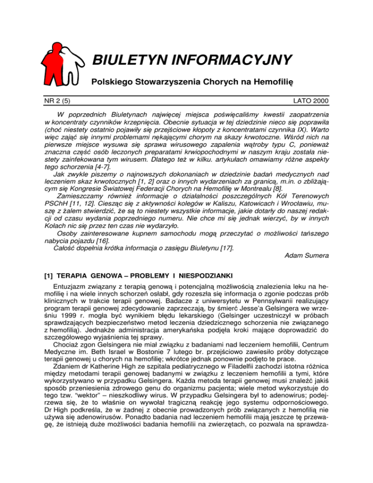 BIULETYN INFORMACYJNY Polskiego Stowarzyszenia Chorych na Hemofilię NR 2 (5) LATO 2000 W poprzednich Biuletynach najwięcej miejsca poświęcaliśmy kwestii zaopatrzenia w koncentraty czynników krzepnięcia. Obecnie sytuacja w tej dziedzinie nieco się poprawiła (choć niestety ostatnio pojawiły się przejściowe kłopoty z koncentratami czynnika IX). Warto więc zająć się innymi problemami nękającymi chorym na skazy krwotoczne. Wśród nich na pierwsze miejsce wysuwa się sprawa wirusowego zapalenia wątroby typu C, ponieważ znaczna część osób leczonych preparatami krwiopochodnymi w naszym kraju została niestety zainfekowana tym wirusem. Dlatego też w kilku. artykułach omawiamy różne aspekty tego schorzenia [4-7]. Jak zwykle piszemy o najnowszych dokonaniach w dziedzinie badań medycznych nad leczeniem skaz krwotocznych [1, 2] oraz o innych wydarzeniach za granicą, m.in. o zbliżającym się Kongresie Światowej Federacji Chorych na Hemofilię w Montrealu [8]. Zamieszczamy również informacje o działalności poszczególnych Kół Terenowych PSChH [11, 12]. Ciesząc się z aktywności kolegów w Kaliszu, Katowicach i Wrocławiu, muszę z żalem stwierdzić, że są to niestety wszystkie informacje, jakie dotarły do naszej redakcji od czasu wydania poprzedniego numeru. Nie chce mi się jednak wierzyć, by w innych Kołach nic się przez ten czas nie wydarzyło. Osoby zainteresowane kupnem samochodu mogą przeczytać o możliwości tańszego nabycia pojazdu [16]. Całość dopełnia krótka informacja o zasięgu Biuletynu [17]. Adam Sumera [1] TERAPIA GENOWA – PROBLEMY I NIESPODZIANKI Entuzjazm związany z terapią genową i potencjalną możliwością znalezienia leku na hemofilię i na wiele innych schorzeń osłabł, gdy rozeszła się informacja o zgonie podczas prób klinicznych w trakcie terapii genowej. Badacze z uniwersytetu w Pennsylwanii realizujący program terapii genowej zdecydowanie zaprzeczają, by śmierć Jesse’a Gelsingera we wrześniu 1999 r. mogła być wynikiem błędu lekarskiego (Gelsinger uczestniczył w próbach sprawdzających bezpieczeństwo metod leczenia dziedzicznego schorzenia nie związanego z hemofilią). Jednakże administracja amerykańska podjęła kroki mające doprowadzić do szczegółowego wyjaśnienia tej sprawy. Chociaż zgon Gelsingera nie miał związku z badaniami nad leczeniem hemofilii, Centrum Medyczne im. Beth Israel w Bostonie 7 lutego br. przejściowo zawiesiło próby dotyczące terapii genowej u chorych na hemofilię; wkrótce jednak ponownie podjęto te prace. Zdaniem dr Katherine High ze szpitala pediatrycznego w Filadelfii zachodzi istotna różnica między metodami terapii genowej badanymi w związku z leczeniem hemofilii a tymi, które wykorzystywano w przypadku Gelsingera. Każda metoda terapii genowej musi znaleźć jakiś sposób przeniesienia zdrowego genu do organizmu pacjenta; wiele metod wykorzystuje do tego tzw. “wektor” – nieszkodliwy wirus. W przypadku Gelsingera był to adenowirus; podejrzewa się, że to właśnie on wywołał tragiczną reakcję jego systemu odpornościowego. Dr High podkreśla, że w żadnej z obecnie prowadzonych prób związanych z hemofilią nie używa się adenowirusów. Ponadto badania nad leczeniem hemofilii mają jeszcze tę przewagę, że istnieją duże możliwości badania hemofilii na zwierzętach, co pozwala na sprawdza- nie bezpieczeństwa i skuteczności poszczególnych metod jeszcze przed rozpoczęciem prób u ludzi. (opr. as na podst. czasopisma HEMALOG 2/2000) [2] NIESPODZIEWANA POPRAWA Niespodziewanie dobre wiadomości nadeszły z ośrodka, w którym prowadzone są próby nad zastosowaniem terapii genowej w leczeniu hemofilii B. Po podaniu prawidłowej postaci genu odpowiedzialnego za wytwarzanie czynnika IX u dwóch z trzech pacjentów odnotowano zauważalną poprawę – chociaż naukowcy zakładali, że podane dawki są zbyt małe, by okazać się skuteczne. Ku zaskoczeniu lekarzy prowadzących próby organizmy obu pacjentów zaczęły wytwarzać tyle czynnika IX, że dało się to wykryć w badaniu ich krwi. Zdaniem dr. Arthura Beaudeta, genetyka z Baylor College of Medicine, potwierdzenie skuteczności terapii genowej możemy uzyskać być może już za rok. (opr. as na podst. czasopisma HEMALOG 2/2000) [3] SKAZY KRWOTOCZNE U KOBIET Niestety, nadal bardzo często skazy krwotoczne u kobiet pozostają niewykryte – a przez to nieleczone. Szansę na zmianę tej sytuacji, na razie w USA, daje dotacja firmy Aventis Behring w wysokości 1,5 mln dolarów. Dzięki niej w czerwcu br. rozpocznie się zaplanowana na pięć lat kampania skierowana zarówno do szerokich kręgów społeczeństwa, jak i do lekarzy. Kampania obejmie takie kwestie, jak częstość występowania skaz krwotocznych u kobiet, typy schorzeń, jakość życia chorych oraz informacje o leczeniu. Specjalnie wydane publikacje amerykańskiego stowarzyszenia chorych na hemofilię oraz strony w Internecie mają zwracać uwagę kobiet na sygnały skaz krwotocznych: silne krwawienia miesięczne, nadmierne krwawienie po usunięciu zęba lub urazie, częste krwawienia z nosa, łatwo powstające siniaki. Dla wsparcia kampanii stowarzyszenie zamierza wykorzystać pomoc pewnej znanej osobistości, której nazwiska jednak jeszcze nie ujawniono. (opr. as na podst. czasopisma HEMALOG, 2/2000) [4] WIRUSOWE ZAPALENIE WĄTROBY TYPU C W czerwcowym numerze miesięcznika “Wiedza i Życie” ukazał się artykuł Arkadiusza Millera zatytułowany Żółta fala, poświęcony wirusowym zapaleniom wątroby. Przedstawiamy omówienie tego materiału. Kilkanaście lat temu problemem w naszym kraju była żółtaczka – “choroba brudnych rąk”, jak wtedy mówiono. Wówczas chodziło o wirusowe zapalenie wątroby typu A. Dzięki poprawie warunków higienicznych i upowszechnieniu szczepionek udało się znacznie zmniejszyć liczbę zachorowań tego rodzaju. Wkrótce jednak okazało się, że wirusowe zapalenie 