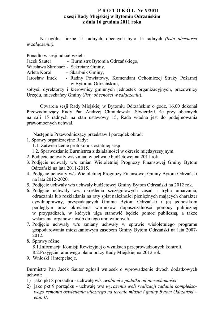 P R O T O K Ó Ł Nr X/2011 z sesji Rady Miejskiej w Bytomiu Odrzańskim z dnia 16 grudnia 2011 roku Na ogólną liczbę 15 radnych, obecnych było 15 radnych (lista obecności w załączeniu). Ponadto w sesji udział wzięli: Jacek Sauter - Burmistrz Bytomia Odrzańskiego, Wiesława Skrobacz - Sekretarz Gminy, Arleta Korol - Skarbnik Gminy, Jarosław Intek - Radny Powiatowy, Komendant Ochotniczej Straży Pożarnej w Bytomiu Odrzańskim, sołtysi, dyrektorzy i kierownicy gminnych jednostek organizacyjnych, pracownicy Urzędu, mieszkańcy Gminy (listy obecności w załączeniu). Otwarcia sesji Rady Miejskiej w Bytomiu Odrzańskim o godz. 16.00 dokonał Przewodniczący Rady Pan Andrzej Chmielewski. Stwierdził, że przy obecnych na sali 15 radnych na stan ustawowy 15, Rada władna jest do podejmowania prawomocnych uchwał. Następnie Przewodniczący przedstawił porządek obrad: 1. Sprawy organizacyjne Rady: 1.1. Zatwierdzenie protokołu z ostatniej sesji. 1.2. Sprawozdanie Burmistrza z działalności w okresie międzysesyjnym. 2. Podjęcie uchwały w/s zmian w uchwale budżetowej na 2011 rok. 3. Podjęcie uchwały w/s zmian Wieloletniej Prognozy Finansowej Gminy Bytom Odrzański na lata 2011-2015. 4. Podjęcie uchwały w/s Wieloletniej Prognozy Finansowej Gminy Bytom Odrzański na lata 2012-2020. 5. Podjęcie uchwały w/s uchwały budżetowej Gminy Bytom Odrzański na 2012 rok. 6. Podjęcie uchwały w/s określenia szczegółowych zasad i trybu umarzania, odraczania lub rozkładania na raty spłat należności pieniężnych mających charakter cywilnoprawny, przypadających Gminie Bytom Odrzański i jej jednostkom podległym oraz określenia warunków dopuszczalności pomocy publicznej w przypadkach, w których ulga stanowić będzie pomoc publiczną, a także wskazania organów i osób do tego uprawnionych. 7. Podjęcie uchwały w/s zmiany uchwały w sprawie wieloletniego programu gospodarowania mieszkaniowym zasobem Gminy Bytom Odrzański na lata 20072012. 8. Sprawy różne: 8.1.Informacja Komisji Rewizyjnej o wynikach przeprowadzonych kontroli. 8.2.Przyjęcie ramowego planu pracy Rady Miejskiej na 2012 rok. 9. Wnioski i interpelacje. Burmistrz Pan Jacek Sauter zgłosił wniosek o wprowadzenie dwóch dodatkowych uchwał: 1) jako pkt 8 porządku - uchwałę w/s zwolnień z podatku od nieruchomości, 2) jako pkt 9 porządku - uchwałę w/s wyrażenia woli realizacji zadania kompleksowego remontu oświetlenia ulicznego na terenie miasta i gminy Bytom Odrzański – etap II. -2- Przewodniczący Rady poinformował, iż zgodnie z art.20 ust.1a ustawy o samorządzie gminnym: „Rada gminy może wprowadzić zmiany w porządku bezwzględną większością głosów ustawowego składu rady.”. Rada Miejska jednogłośnie (15 głosów za) przyjęła porządek obrad z w/w zmianami. Ostateczny porządek obrad przedstawiał się następująco: 1. Sprawy organizacyjne Rady: 1.1. Zatwierdzenie protokołu z ostatniej sesji. 1.2. Sprawozdanie Burmistrza z działalności w okresie międzysesyjnym. 2. Podjęcie uchwały w/s zmian w uchwale budżetowej na 2011 rok. 3. Podjęcie uchwały w/s zmian Wieloletniej Prognozy Finansowej Gminy Bytom Odrzański na lata 2011-2015. 4. Podjęcie uchwały w/s Wieloletniej Prognozy Finansowej Gminy Bytom Odrzański na lata 2012-2020. 5. Podjęcie uchwały w/s uchwały budżetowej Gminy Bytom Odrzański na 2012 rok. 6. Podjęcie uchwały w/s określenia szczegółowych zasad i trybu umarzania, odraczania lub rozkładania na raty spłat należności pieniężnych mających charakter cywilnoprawny, przypadających Gminie Bytom Odrzański i jej jednostkom podległym oraz określenia warunków dopuszczalności pomocy publicznej w przypadkach, w których ulga stanowić będzie pomoc publiczną, a także wskazania organów i osób do tego uprawnionych. 7. Podjęcie uchwały w/s zmiany uchwały w sprawie wieloletniego programu gospodarowania mieszkaniowym zasobem Gminy Bytom Odrzański na lata 20072012. 8. Podjęcie uchwały w/s zwolnień z podatku od nieruchomości. 9. Podjęcie uchwały w/s wyrażenia woli realizacji zadania kompleksowego remontu oświetlenia ulicznego na terenie miasta i gminy Bytom Odrzański – etap II. 10.Sprawy różne: 10.1.Informacja Komisji Rewizyjnej o wynikach przeprowadzonych kontroli. 10.2.Przyjęcie ramowego planu pracy Rady Miejskiej na 2012 rok. 11. Wnioski i interpelacje. Ad.1. 1.1. W wyniku głosowania Rada Miejska jednogłośnie (15 głosów za) zatwierdziła protokół nr IX/2011 z sesji Rady Miejskiej w Bytomiu Odrzańskim, odbytej w dniu 18 listopada 2011 roku. 1.2. Burmistrz Pan Jacek Sauter przedstawił sprawozdanie ze swojej działalności w okresie międzysesyjnym (w załączeniu). Ad.2. Projekt uchwały w sprawie zmian w uchwale budżetowej na 2011 rok odczytała Pani Arleta Korol – Skarbnik Gminy. Radny Pan Ryszard Rapke poinformował o pozytywnym (jednogłośnym) zaopiniowaniu projektu uchwały na wspólnym posiedzeniu przedsesyjnym komisji stałych Rady Miejskiej odbytym w dniu 13 grudnia 2011 roku. -3- W wyniku głosowania jawnego Rada jednogłośnie (15 głosów za) przyjęła projekt uchwały w sprawie zmian w uchwale budżetowej na 2011 rok. UCHWAŁA Nr X/87/2011 /w załączeniu/ Ad.3. Projekt uchwały w sprawie zmian Wieloletniej Prognozy Finansowej Gminy Bytom Odrzański na lata 2011-2015 odczytała Pani Arleta Korol – Skarbnik Gminy. Radny Pan Ryszard Rapke poinformował o pozytywnym (jednogłośnym) zaopiniowaniu projektu uchwały na wspólnym posiedzeniu przedsesyjnym komisji stałych Rady Miejskiej odbytym w dniu 13 grudnia 2011 roku. W wyniku głosowania jawnego Rada jednogłośnie (15 głosów za) przyjęła projekt uchwały w sprawie zmian Wieloletniej Prognozy Finansowej Gminy Bytom Odrzański na lata 2011-2015. UCHWAŁA Nr X/88/2011 /w załączeniu/ Ad.4 Projekt uchwały w sprawie Wieloletniej Prognozy Finansowej Gminy Bytom Odrzański na lata 2012-2020 odczytała Pani Arleta Korol – Skarbnik Gminy. Następnie 
