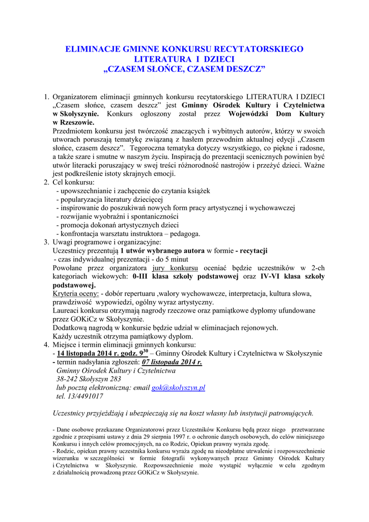 ELIMINACJE GMINNE KONKURSU RECYTATORSKIEGO LITERATURA I DZIECI „CZASEM SŁOŃCE, CZASEM DESZCZ” 1. Organizatorem eliminacji gminnych konkursu recytatorskiego LITERATURA I DZIECI „Czasem słońce, czasem deszcz” jest Gminny Ośrodek Kultury i Czytelnictwa w Skołyszynie. Konkurs ogłoszony został przez Wojewódzki Dom Kultury w Rzeszowie. Przedmiotem konkursu jest twórczość znaczących i wybitnych autorów, którzy w swoich utworach poruszają tematykę związaną z hasłem przewodnim aktualnej edycji „Czasem słońce, czasem deszcz”. Tegoroczna tematyka dotyczy wszystkiego, co piękne i radosne, a także szare i smutne w naszym życiu. Inspiracją do prezentacji scenicznych powinien być utwór literacki poruszający w swej treści różnorodność nastrojów i przeżyć dzieci. Ważne jest podkreślenie istoty skrajnych emocji. 2. Cel konkursu: - upowszechnianie i zachęcenie do czytania książek - popularyzacja literatury dziecięcej - inspirowanie do poszukiwań nowych form pracy artystycznej i wychowawczej - rozwijanie wyobraźni i spontaniczności - promocja dokonań artystycznych dzieci - konfrontacja warsztatu instruktora – pedagoga. 3. Uwagi programowe i organizacyjne: Uczestnicy prezentują 1 utwór wybranego autora w formie - recytacji - czas indywidualnej prezentacji - do 5 minut Powołane przez organizatora jury konkursu oceniać będzie uczestników w 2-ch kategoriach wiekowych: 0-III klasa szkoły podstawowej oraz IV-VI klasa szkoły podstawowej. Kryteria oceny: - dobór repertuaru ,walory wychowawcze, interpretacja, kultura słowa, prawdziwość wypowiedzi, ogólny wyraz artystyczny. Laureaci konkursu otrzymają nagrody rzeczowe oraz pamiątkowe dyplomy ufundowane przez GOKiCz w Skołyszynie. Dodatkową nagrodą w konkursie będzie udział w eliminacjach rejonowych. Każdy uczestnik otrzyma pamiątkowy dyplom. 4. Miejsce i termin eliminacji gminnych konkursu: - 14 listopada 2014 r. godz. 930 – Gminny Ośrodek Kultury i Czytelnictwa w Skołyszynie - termin nadsyłania zgłoszeń: 07 listopada 2014 r. Gminny Ośrodek Kultury i Czytelnictwa 38-242 Skołyszyn 283 lub pocztą elektroniczną: email [email protected] tel. 13/4491017 Uczestnicy przyjeżdżają i ubezpieczają się na koszt własny lub instytucji patronujących. - Dane osobowe przekazane Organizatorowi przez Uczestników Konkursu będą przez niego przetwarzane zgodnie z przepisami ustawy z dnia 29 sierpnia 1997 r. o ochronie danych osobowych, do celów niniejszego Konkursu i innych celów promocyjnych, na co Rodzic, Opiekun prawny wyraża zgodę. - Rodzic, opiekun prawny uczestnika konkursu wyraża zgodę na nieodpłatne utrwalenie i rozpowszechnienie wizerunku w szczególności w formie fotografii wykonywanych przez Gminny Ośrodek Kultury i Czytelnictwa w Skołyszynie. Rozpowszechnienie może wystąpić wyłącznie w celu zgodnym z działalnością prowadzoną przez GOKiCz w Skołyszynie.