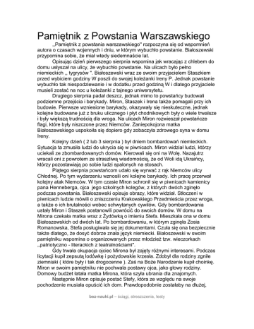 Pamiętnik z Powstania Warszawskiego ,,Pamiętnik z powstania warszawskiego'' rozpoczyna się od wspomnień autora o czasach wojennych i dniu, w którym wybuchło powstanie. Białoszewski przypomina sobie, że miał wtedy siedemnaście lat. Opisując dzień pierwszego sierpnia wspomina jak wracając z chlebem do domu usłyszał na ulicy, że wybuchło powstanie. Na ulicach było pełno niemieckich ,, tygrysów ". Białoszewski wraz ze swoim przyjacielem Staszkiem przed wybiciem godziny W poszli do swojej koleżanki Ireny P. Jednak powstanie wybuchło tak niespodziewanie i w dodatku przed godziną W i dlatego przyjaciele musieli zostać na noc u koleżanki z tajnego uniwersytetu. Drugiego sierpnia padał deszcz, jednak mimo to powstańcy budowali podziemne przejścia i barykady. Miron, Staszek i Irena także pomagali przy ich budowie. Pierwsze wzniesione barykady, okazywały się nieskuteczne, jednak kolejne budowane już z bruku ulicznego i płyt chodnikowych były o wiele trwalsze i były większą trudnością dla wroga. Na ulicach Miron rozwieszał powstańcze flagi, które były niszczone przez Niemców. Zaniepokojona matka Białoszewskiego uspokoiła się dopiero gdy zobaczyła zdrowego syna w domu Ireny. Kolejny dzień ( 2 lub 3 sierpnia ) był dniem bombardowań niemieckich. Sytuacja ta zmusiła ludzi do ukrycia się w piwnicach. Miron widział ludzi, którzy uciekali ze zbombardowanych domów. Kierowali się oni na Wolę. Nazajutrz wracali oni z powrotem ze straszliwą wiadomością, że od Woli idą Ukraińcy, którzy pozostawiają po sobie ludzi spalonych na stosach. Piątego sierpnia powstańcom udało się wyrwać z rąk Niemców ulicy Chłodnej. Po tym wydarzeniu wznosili oni kolejne barykady. Ich pracę przerwał kolejny atak Niemców. W tym czasie Miron schronił się w piwnicach kamienicy pana Henneberga, ojca jego szkolnych kolegów, z których dwóch zginęło podczas powstania. Białoszewski opisuje obrazy, które widział. Stłoczeni w piwnicach ludzie mówili o zniszczeniu Krakowskiego Przedmieścia przez wroga, a także o ich brutalności wobec schwytanych cywilów. Gdy bombardowania ustały Miron i Staszek postanowili powrócić do swoich domów. W domu na Mirona czekała matka wraz z Żydówką o imieniu Stefa. Mieszkała ona w domu Białoszewskich od dwóch lat. Po bombardowaniu, w którym zginęła Zosia Romanowska, Stefa posługiwała się jej dokumentami. Czuła się ona bezpiecznie także dlatego, że dosyć dobrze znała język niemiecki. Białoszewski w swoim pamiętniku wspomina o organizowanych przez młodzież tzw. wieczorkach ,,patriotyczno - literackich z teatralnościami". Gdy trwała okupacja ojciec Mirona był zajęty różnymi interesami. Podczas licytacji kupił zepsutą lodówkę i pożydowskie krzesła. Zdobył dla rodziny zgniłe ziemniaki ( które były i tak drogocenne ). Zaś na Boże Narodzenie kupił choinkę. Miron w swoim pamiętniku nie pochwala postawy ojca, jako głowy rodziny. Domowy budżet łatała matka Mirona, która szyła ubrania dla znajomych. Następnie Miron opisuje postać Stefy, która ze względu na swoje pochodzenie musiała opuścić ich dom. Prawdopodobnie zostałaby na dłużej, bez-nauki.pl – ściągi, streszczenia, testy jednak gdy dozorczyni zorientowała się jakiego jest pochodzenia, kazała się jej wyprowadzić. Mimo to wróciła z łapanki piątego sierpnia, gdyż Niemcom nie udało się rozpoznać w niej Żydówki. Nastąpiły kolejne bombardowania. W ich wyniku ucierpiała Ulica Ogrodowa, która znajdowała się obok Chłodnej, gdzie mieszkał Białoszewski. Podczas tego nalotu zginęło wielu Polaków jak też i Niemców. Po bombardowaniu Miron postanowił odwiedzić Irenę, która wraz ze swoją rodziną ukryła się w piwnicy. Szóstego sierpnia rozeszły się pogłoski o upadku powstania. Dzięki Bogu wiadomość ta okazała się nieprawdą, chociaż ludzie odczuwali zbliżającą się klęskę. Niemcy zaś cały czas atakowali, zajmując coraz to nowe ulice. W tym czasie cywile budowali kolejne barykady i gasili ogień na ulicach. Białoszewski wraz ze swoją rodziną przeniósł się do swojej ciotki Józi, która mieszkała na Ogrodowej 49. Niemieckie bombardowania cały czas trwały. Niemcy przedostawali się do Śródmieścia. Podpalili szpital Świętego Stanisława, rozstrzeliwali pacjentów, wyrzucali ich przez okna. Po zakończeniu tego ataku Miron pomagał wynosić rannych ze szpitala, którym udało się przeżyć. W 1946 roku Białoszewski był świadkiem ekshumacji zamordowanych pacjentów szpitala. Następnie udał się do Ireny. Nie mógł wrócić do domu, gdyż na ulicach pojawili się Niemcy. Wraz z przyjaciółmi postanowił ukryć się na Rybakach, w niewykończonych blokach. Przebywając tam Miron spotkał swojego Swena. Tam właśnie zaczęło się życie w strachu o swoje życie. Do piwnic przybywali coraz to nowe rodziny. Ludzie uczyli się tam mieszkać jak w zwykłym domu. Mieszkańcy piwnic z wszystkich bloków urządzili sobie kaplicę, w której się spotykali. Spędzali oni ze sobą dużo czasu na wspólnych rozmowach. Podczas wspólnych rozmów w piwnicy Swen stawał na środek i czytał na głos gazetki wydawane przez AK, AL. Wraz z Mironem wychodził na ulicę, by pomagać przy budowie barykad, tuneli. Wychodzili także, aby obserwować walki. Jednak gdy bombardowania się nasiliły wychodzenie z piwnicy było już niebezpieczne. Walka o utrzymanie wodociągów się nie udała i powstańcy nie mieli wody. Następnie stracili oni elektrownię co oznaczało brak światła. Łączność między powstańcami była utrzymywana tylko kanałami. Było to także niebezpieczne gdyż Niemcy wrzucali do nich granaty. Mimo to młodzi powstańcy przenosili kanałami meldunki i wiadomości. Białoszewski wraz ze Swenem napisali litanię, która była znana i odmawiana przez wszystkich znajdujących się w piwnicach. Później stała się ona także pieśnią. Dwunastego sierpnia Niem