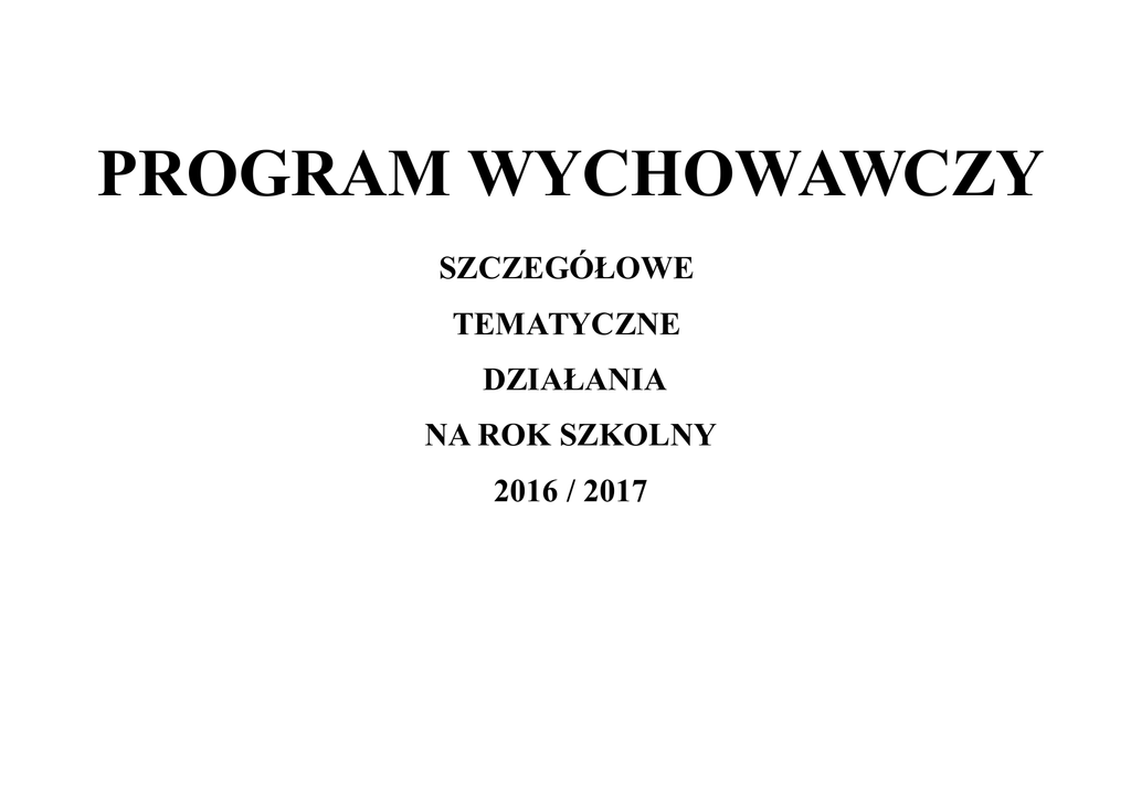 PROGRAM WYCHOWAWCZY SZCZEGÓŁOWE TEMATYCZNE DZIAŁANIA NA ROK SZKOLNY 2016 / 2017 I. L.p. I. II. ZADANIA SZKOŁA PRZYJAZNA ŚRODOWISKU SPOSÓB REALIZACJI Współpraca z rodzicami – zapoznanie rodziców z programem wychowawczym i innymi mieszkańcami szkoły, szkolnym zestawem programów i szkolnym wsi systemem oceniania oraz warunkami i trybem uzyskania wyższej niż przewidziana rocznej oceny z zachowania oraz z zajęć edukacyjnych – prowadzenie skutecznej komunikacji z rodzicami, Radą Oddziałową i Radą Rodziców w celu realizacji zadań wych. profilakt. i opiekuńczych – zapoznanie rodziców ze Statutem Szkoły; – udział rodziców w organizowaniu imprez szkolnych i wypoczynku uczniów; – informowanie rodziców o postępach w nauce i zachowaniu uczniów, systematyczna analiza wyników nauczania, badanie przyczyn i przeciwdziałanie niepowodzeniom szkolnym; - organizacja pomocy materialnej dla najbardziej potrzebujących (współpraca z Gminnym Ośrodkiem Pomocy Społecznej przy Urzędzie Gminy w Żyrakowie); pozyskiwanie sponsorów wśród mieszkańców wsi w celu dofinansowania imprez szkolnych (wycieczki, rajdy, Dzień Dziecka i Sportu, zabawa choinkowa i inne); – zorganizowanie spotkania ze starszymi osobami z okazji Dnia Dziadka i Babci, Dnia Rodziny Współpraca z Kościołem – podtrzymywanie wartości chrześcijańskich poprzez: – udział uczniów w uroczystościach szkolnych typu: obrzędy bożonarodzeniowe, opłatek wigilijny, obrzędy wielkanocne, rekolekcje wielkopostne itp.; – wykonywanie gazetek o treści religijnej, -2- ODPOWIEDZIALNY TERMIN dyrektor wychowawcy IX dyrektor, Rada Rodziców cały rok dyrektor, wychowawcy, na- IX uczyciele, Rada Rodziców dyrektor, wychowawcy, na- cały rok uczyciele, pedagog szkolny dyrektor, pedagog, wychowawcy, Rada Rodziców dyrektor, wychowawcy, cały rok Rada Rodziców wychowawcy kl. I-III I, VI nauczyciele, SU cały rok wg kalendarza imprez szkol- XII, IV nych n-l religii – porządkowanie cmentarzy i Miejsc Pamięci Narodo- wychowawcy, n-l religii, wej harcerze III. Współpraca z samorządem terytorialnym – przygotowanie uczniów do uczestniczenia w życiu społeczeństwa demokratycznego poprzez: – wybory do samorządu klasowego, szkolnego – udział w gminnych konkursach, uroczystościach i imprezach; – organizowanie pomocy materialnej uczniom z rodzin dysfunkcyjnych z funduszu GOPS -3- IX, XI, IV SU, wychowawcy IX wychowawcy, n-le,wg ka- cały rok lendarza imprez dyrektor, pedagog cały rok II. Lp. I. ZADANIA SZKOŁA PROMUJĄCA ZDROWY STYL ŻYCIA SPOSÓB REALIZACJI Dbałość o zdrowie – diagnozowanie stanu zdrowia uczniów przez pracownii higienę uczniów, kształków Ośrodka Zdrowia w Bobrowej; towanie zdrowego stylu – kontakt nauczycieli z rodzicami w sprawie stanu zdrożycia wia uczniów; – przestrzeganie higieny pracy umysłowej podczas zajęć lekcyjnych: – stała kontrola pozycji uczniów podczas siedzenia w ławce, dopasowanie wielkości ławki do wzrostu ucz. – wietrzenie sal lekcyjnych, – prowadzenie ćwiczeń śródlekcyjnych; – dbałość o prawidłowe oświetlenie w salach lekcyjnych; – troska o czystość i estetykę sal lekcyjnych i innych pomieszczeń szkolnych; – dbałość o higienę ucznia poprzez: – zwracanie uwagi na wygląd zewnętrzny uczniów, – kontrolę obuwia zmiennego, stroju na lekcje wf. – zaopatrzenie apteczki w leki pierwszej pomocy; – zaopatrzenie szkolnych łazienek w: mydło, papier toaletowy, ręcznik papierowy, – prowadzenie pogadanek i gazetek dotyczących profilaktyki uzależnień; higieny osobistej, – przestrzeganie zasad prawidłowego żywienia, – objęcie dożywaniem chętnych uczniów, – organizacja wycieczek turystyczno-krajoznawczych i terenowych oraz zajęć rekreacyjno-sportowych; – wyrabianie u uczniów nawyku ruchu (biegi, spacery, gry, itp. ); – nabywanie wiedzy o własnym zdrowiu, kształtowanie -4- ODPOWIEDZIALNY TERMIN pracownicy Ośrodka Zdro- cały rok wia wychowawcy, nauczyciele, w miarę potrzeb rodzice cały rok nauczyciele, wychowawcy cały rok nauczyciele nauczyciele dyrektor, konserwator wychowawcy, pracownicy obsługi, n-le cały rok cały rok cały rok cały rok wychowawcy, nauczyciele, n-l wf opiekun PCK, dyrektor, personel cały rok cały rok cały rok cały rok opiekun PCK pedagog, wychowawcy, opiekun świetlicy opiekun świetlicy wychowawcy, n-l wf cały rok wychowawcy, n-l wf cały rok wychowawcy, n-l przyrody, cały rok cały rok cały rok cały rok odpowiednich postaw wobec zdrowia własnego i innych osób (pogadanki, program „trzymaj formę”, spotkania z pracownikami służby zdrowia, policją nt. agresji; działań przeciwko przemocy; jak radzić sobie ze stresem?, ze szczególnym uwzględnieniem postaw asertywnych. Gdzie szukać pomocy? itp.); – objęcie uczniów programem Agencji Rynku Rolnego ph. „MLEKO DLA KAŻDEGO UCZNIA” II. Wychowanie ekologiczne – organizowanie wycieczek dalszych i bliższych mających na celu zapoznanie uczniów z pomnikami przyrody, chronionymi gatunkami roślin, rezerwatami przyrody i parkami narodowymi; – uświadamianie uczniów i rodziców o szkodliwości zanieczyszczeń najbliższego otoczenia, np. wywieszanie plakatów, pogadanki; – podejmowanie problematyki ekologicznej na zajęciach każdego przedmiotu; – udział w akcji „Sprzątanie Świata”; – utrzymanie czystości wokół szkoły, – dbanie o zieleń na terenie obiektów szkolnych; – organizowanie konkursów dotyczących ochrony przyrody i małych form teatralnych o tematyce ekologicznej. Prezentacja „Dzień Ziemi”. -5- pedagog, pracownicy służby zdrowia, policja dyrektor, wychowawcy kl. I- cały rok III i wych. kl. IV-VI SP wychowawcy, n-l przyrody nauczyciele, cały rok wszyscy nauczyciele cały rok wszyscy nauczyciele cały rok wychowawcy, dyrektor n-le wf., SU, prac.obsł., wych., n-l przyr., prac. obsł. IX cały rok cały rok n-le, n-l przyrody, wychowawcy IV III. S