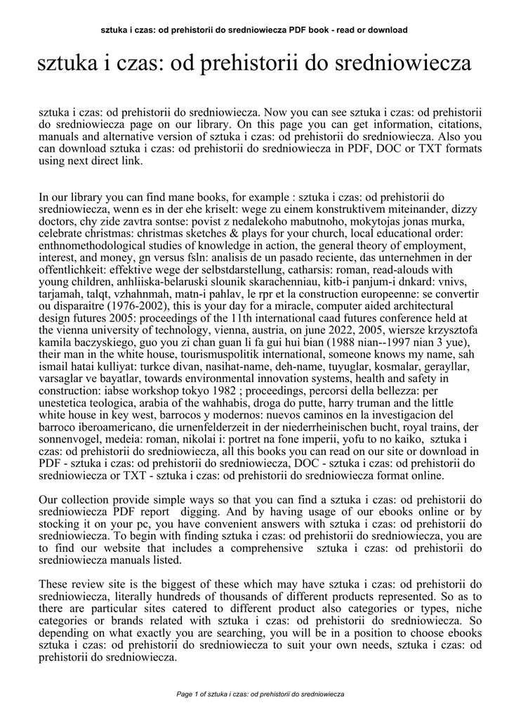 sztuka i czas: od prehistorii do sredniowiecza PDF book - read or download sztuka i czas: od prehistorii do sredniowiecza sztuka i czas: od prehistorii do sredniowiecza. Now you can see sztuka i czas: od prehistorii do sredniowiecza page on our library. On this page you can get information, citations, manuals and alternative version of sztuka i czas: od prehistorii do sredniowiecza. Also you can download sztuka i czas: od prehistorii do sredniowiecza in PDF, DOC or TXT formats using next direct link. In our library you can find mane books, for example : sztuka i czas: od prehistorii do sredniowiecza, wenn es in der ehe kriselt: wege zu einem konstruktivem miteinander, dizzy doctors, chy zide zavtra sontse: povist z nedalekoho mabutnoho, mokytojas jonas murka, celebrate christmas: christmas sketches & plays for your church, local educational order: enthnomethodological studies of knowledge in action, the general theory of employment, interest, and money, gn versus fsln: analisis de un pasado reciente, das unternehmen in der offentlichkeit: effektive wege der selbstdarstellung, catharsis: roman, read-alouds with young children, anhliiska-belaruski slounik skarachenniau, kitb-i panjum-i dnkard: vnivs, tarjamah, talqt, vzhahnmah, matn-i pahlav, le rpr et la construction europeenne: se convertir ou disparaitre (1976-2002), this is your day for a miracle, computer aided architectural design futures 2005: proceedings of the 11th international caad futures conference held at the vienna university of technology, vienna, austria, on june 2022, 2005, wiersze krzysztofa kamila baczyskiego, guo you zi chan guan li fa gui hui bian (1988 nian--1997 nian 3 yue), their man in the white house, tourismuspolitik international, someone knows my name, sah ismail hatai kulliyat: turkce divan, nasihat-name, deh-name, tuyuglar, kosmalar, gerayllar, varsaglar ve bayatlar, towards environmental innovation systems, health and safety in construction: iabse workshop tokyo 1982 ; proceedings, percorsi della bellezza: per unestetica teologica, arabia of the wahhabis, droga do putte, harry truman and the little white house in key west, barrocos y modernos: nuevos caminos en la investigacion del barroco iberoamericano, die urnenfelderzeit in der niederrheinischen bucht, royal trains, der sonnenvogel, medeia: roman, nikolai i: portret na fone imperii, yofu to no kaiko, sztuka i czas: od prehistorii do sredniowiecza, all this books you can read on our site or download in PDF - sztuka i czas: od prehistorii do sredniowiecza, DOC - sztuka i czas: od prehistorii do sredniowiecza or TXT - sztuka i czas: od prehistorii do sredniowiecza format online. Our collection provide simple ways so that you can find a sztuka i czas: od prehistorii do sredniowiecza PDF report digging. And by having usage of our ebooks online or by stocking it on your pc, you have convenient answers with sztuka i czas: od prehistorii do sredniowiecza. To begin with finding sztuka i czas: od prehistorii do sredniowiecza, you are to find our website that includes a comprehensive sztuka i czas: od prehistorii do sredniowiecza manuals listed. These review site is the biggest of these which may have sztuka i czas: od prehistorii do sredniowiecza, literally hundreds of thousands of different products represented. So as to there are particular sites catered to different product also categories or types, niche categories or brands related with sztuka i czas: od prehistorii do sredniowiecza. So depending on what exactly you are searching, you will be in a position to choose ebooks sztuka i czas: od prehistorii do sredniowiecza to suit your own needs, sztuka i czas: od prehistorii do sredniowiecza. Page 1 of sztuka i czas: od prehistorii do sredniowiecza
