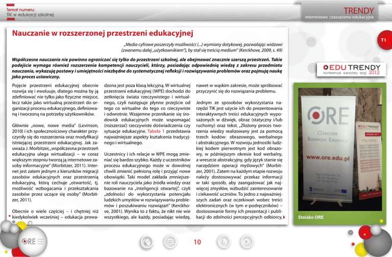 Temat numeru: TIK w edukacji szkolnej Nauczanie w rozszerzonej przestrzeni edukacyjnej T1 „Media cyfrowe poszerzyły możliwości (...) wymiany dotykowej, pozwalając widzowi (zwanemu dalej „użytkownikiem”), by stał się treścią medium” (Kerckhove, 2009, s. 49) Współczesne nauczanie nie powinno ograniczać się tylko do przestrzeni szkolnej, ale obejmować znacznie szerszą przestrzeń. Takie podejście wymaga również rozszerzenia kompetencji nauczycieli, którzy, posiadając odpowiednią wiedzę z zakresu przedmiotu nauczania, wykazują postawy i umiejętności niezbędne do systematycznej refleksji i rozwiązywania problemów oraz pojmują naukę jako proces ustawiczny. Pojęcie przestrzeni edukacyjnej obecnie rozwija się i ewoluuje, dlatego można by ją zdefiniować nie tylko jako fizyczne miejsce, lecz także jako wirtualną przestrzeń do organizacji procesu edukacyjnego, definiowaną i tworzoną na potrzeby użytkowników. Głównie „nowe, nowe media” (Levinson, 2010) i ich społecznościowy charakter przyczyniły się do rozszerzenia oraz modyfikacji istniejącej przestrzeni edukacyjnej. Jak zauważa J. Morbitzer, „współczesna przestrzeń edukacyjna ulega wirtualizacji – w coraz większym stopniu tworzą ją internetowe zasoby informacyjne” (Morbitzer, 2011). Internet jest zatem jednym z kierunków migracji zasobów edukacyjnych oraz przestrzenią edukacyjną, którą cechuje „otwartość, tj. możliwość wzbogacania i przekształcania zasobów przez uczące się osoby” (Morbitzer, 2011). Obecnie o wiele częściej – i chętniej niż kiedykolwiek wcześniej – edukacja prowa- dzona jest poza klasą lekcyjną. W wirtualnej przestrzeni edukacyjnej (WPE) dochodzi do zetknięcia świata rzeczywistego i wirtualnego, czyli następuje płynne przejście od tego co wirtualne do tego co rzeczywiste i odwrotnie. Wzajemne przenikanie się środowisk edukacyjnych może wspomagać (rozszerzać) rzeczywiste doświadczenia czy sytuacje edukacyjne. Tabela 1 przedstawia najważniejsze aspekty kształcenia tradycyjnego i wirtualnego. Uczestnicy i ich relacje w WPE mogą zmieniać się bardzo szybko. Każdy z uczestników procesu edukacyjnego może w dowolnej chwili zmienić pełnioną rolę i przyjąć nowe obowiązki. Taki model zakłada zmniejszenie roli nauczyciela jako źródła wiedzy oraz bazowanie na „inteligencji otwartej”, czyli „zdolności do wykorzystania potencjału ludzkich umysłów w rozwiązywaniu problemów i poszukiwaniu rozwiązań” (Kerckhove, 2001). Wynika to z faktu, że nikt nie wie wszystkiego, ale każdy, posiadając wiedzę, nawet w wąskim zakresie, może spróbować przyczynić się do rozwiązania problemu. Jednym ze sposobów wykorzystania narzędzi TIK jest użycie ich do prezentowania interaktywnych treści edukacyjnych wyposażonych w dźwięk, obraz (statyczny i/lub ruchomy) oraz tekst. „Złożony proces tworzenia wiedzy realizowany jest za pomocą trzech kodów: obrazowego, werbalnego i abstrakcyjnego. W rozwoju jednostki ludzkiej kodem pierwotnym jest kod obrazowy, w późniejszym okresie kod werbalny, a wreszcie abstrakcyjny, gdy język stanie się narzędziem operacji myślowych” (Morbitzer, 2001). Zatem na każdym etapie rozwoju należy dostosowywać przekaz informacji w taki sposób, aby zaangażować jak najwięcej zmysłów, wzbudzić zainteresowanie i ciekawość uczniów. To jedno z najważniejszych zadań oraz oczekiwań wobec treści elektronicznych (w tym e-podręczników) – dostosowanie formy ich prezentacji i publikacji do zdolności percepcyjnych odbiorcy, 10 Stoisko ORE Temat numeru: TIK w edukacji szkolnej przy jednoczesnym pozostaniu w obrębie jego zainteresowań. „Umożliwianie uczniom wykonywania tego, co naprawdę lubią i chcą robić, w czym czują się dobrzy i niemalże niezastąpieni – zwiększa motywację, zaangażowanie i odpowiedzialność za własny proces uczenia się” (Kołodziejczyk, Jeszcze raz o talentach w szkole). Nie można wyobrazić sobie procesu nauczania bez zaangażowania nauczycieli oraz uczniów, którzy są bezpośrednimi „klientami” szkoły. Swoboda wyboru szkoły, tym samym oferty edukacyjnej, wiąże się z przyjęciem odpowiedzialności za własne losy. Nikomu bardziej niż samym uczniom nie powinno zależeć na rozwoju osobistym, należy zatem kształtować wśród nich postawę odpowiedzialności m.in. za dokonywane wybory. Wolność podejmowania decyzji jest ściśle powiązana z odpowiedzialnością za ich skutki, tym samym narzuca ograniczenia swobody w obszarze podjętych działań i zobowiązań. „Odpowiedzialna wolność zakłada, że ograniczenia wynikają nie z zawężania obszaru wolności, ale z rozszerzania obszaru odpowiedzialności” (Morbitzer, 2004, s. 174–185). Rozszerzona edukacja „Efektywne nauczanie wymaga ludzi biegłych w przedmiocie nauczania, którzy jed- nocześnie troszczą się o dobro swoich uczniów; ludzi, dla których miarą sukcesu zawodowego są osiągnięcia i społeczna dojrzałość uczniów” (Arends, 1995, s. 36, 310). Według R.I. Arendsa skuteczny nauczyciel to taki, który posiada odpowiednią wiedzę z zakresu przedmiotu nauczania, dysponuje repertuarem najlepszych sposobów postępowania pedagogicznego, wykazuje postawy i umiejętności niezbędne do systematycznej refleksji i rozwiązywania problemów, pojmuje naukę jako proces ustawiczny (Arends, 1995, s. 36, 310). Obecnie można by uzupełnić tę definicję o aktywne wykorzystywanie w realizacji procesu nauczania środków i narzędzi TIK, nowoczesnych zasobów edukacyjnych na zajęciach lekcyjnych oraz narzędzi komunikacji zdalnej. „Jeśli nauczyciela potraktować jako sprzedawcę wiedzy, to uczniów nie należy traktować jak jego klientów, lecz jako współtwórców wytwarzanych przez niego produktów” (Dede, 2007). Uczniowie powinni zatem być uwzględniani w projektowaniu pracy dydaktycznej i aktywnie brać w niej udział. Zanika tym sa